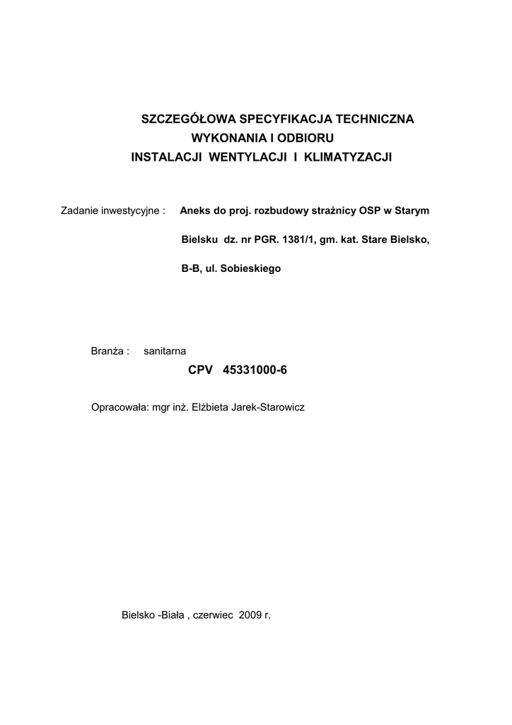 SZCZEGÓŁOWA SPECYFIKACJA TECHNICZNA WYKONANIA I ODBIORU INSTALACJI WENTYLACJI I KLIMATYZACJI Zadanie inwestycyjne : Aneks do proj. rozbudowy straŜnicy OSP w Starym Bielsku dz. nr PGR. 1381/1, gm. kat. Stare Bielsko, B-B, ul. Sobieskiego BranŜa : sanitarna CPV 45331000-6 Opracowała: mgr inŜ. ElŜbieta Jarek-Starowicz Bielsko -Biała , czerwiec 2009 r. Szczegółowa specyfikacja techniczna instalacji wentylacji i klimatyzacji Kod CPV: 1. 45331000-6 Wstęp 1.1. Przedmiot Szczegółowej Specyfikacji Technicznej Przedmiotem niniejszej Specyfikacji Technicznej są wymagania dotyczące wykonania i odbioru robót w zakresie realizacji instalacji wentylacji i klimatyzacji w StraŜnicy OSP w Starym Bielsku, Bielsko- Biała, ul. Sobieskiego 307a 1.2. Zakres stosowania Szczegółowej Specyfikacji Technicznej Specyfikacja Techniczna jest stosowana jako dokument przetargowy i kontraktowy przy zlecaniu i realizacji robót wymienionych w pkt. 1.1. Realizację zadania podzielono na dwa etapy: etap I - instalacja wentylacji etap II – instalacja klimatyzacji 1.3. Zakres robót objętych Szczegółową Specyfikacją Techniczną Roboty, których dotyczy specyfikacja, obejmują wszystkie czynności umoŜliwiające i mające na celu wykonanie nowej instalacji wentylacji i klimatyzacji. Niniejsza specyfikacja techniczna związana jest z wykonaniem niŜej wymienionych robót: - część wentylacyjna: o montaŜ przewodów wentylacyjnych o montaŜ elementów wentylacyjnych ( nawiewniki, czerpnie, wyrzutnie, przepustnice, tłumiki ) o montaŜ urządzeń (centrale wentylacyjne, nagrzewnica elektryczna, wentylatory) o badania instalacji (próby szczelności) o wykonanie izolacji termicznej o uruchomienie central wentylacyjnych o regulacja hydrauliczna o wykonanie układów sterowania central wentylacyjnych i wentylatorów - część chłodnicza o montaŜ urządzeń ( jednostki zewnętrzne i wewnętrzne klimatyzatorów SPLIT) o montaŜ rurociągów o badanie szczelności o wykonanie izolacji termicznej- zimnochronnej o napełnienie czynnikiem chłodniczym o uruchomienie o regulacja 1.4. Ogólne wymagania - wykonawca jest odpowiedzialny za realizację robót zgodnie z dokumentacją projektową, specyfikacją techniczną, poleceniami nadzoru autorskiego i inwestorskiego oraz zgodnie z art. 5, 22, 23 i 28 ustawy Prawo Budowlane, „Warunkami technicznymi wykonania i odbioru instalacji wentylacyjnych” Zeszyt 5 - Odstępstwa od projektu mogą dotyczyć jedynie dostosowania instalacji wentylacji i klimatyzacji do wprowadzonych zmian konstrukcyjno-budowlanych, lub zastąpienie zaprojektowanych materiałów - w przypadku niemoŜliwości ich uzyskania – przez inne materiały lub elementy o zbliŜonych charakterystykach i trwałości. Wszelkie zmiany i odstępstwa od zatwierdzonej dokumentacji technicznej nie mogą powodować obniŜenia wartości funkcjonalnych i uŜytkowych instalacji, a jeŜeli dotyczą zmiany materiałów i elementów określonych w dokumentacji technicznej na inne, nie mogą powodować zmniejszenia trwałości eksploatacyjnej, zwiększenia energochłonności instalacji lub zwiększenia hałasu lub drgań. Roboty budowlane naleŜy realizować zgodnie z „Warunkami technicznymi wykonania i odbioru robót budowlanomontaŜowych. Tom II Instalacje sanitarne i przemysłowe”, „Warunkami technicznymi wykonania i odbioru instalacji wentylacyjnych” Zeszyt 5, Polskimi Normami oraz innymi przepisami dotyczącymi przedmiotowej instalacji. - 2. Materiały Do wykonania instalacji mogą być stosowane wyroby producentów krajowych i zagranicznych. Wszystkie materiały uŜyte do wykonania instalacji muszą posiadać znak CE lub deklarację zgodności producenta odnoszącą się do aktualnej aprobaty technicznej lub Polskiej Normy. Wykonawca uzyska przed zastosowaniem wyrobu akceptację Inspektora Nadzoru. Odbiór techniczny materiałów powinien być dokonany według wymagań i w sposób określony aktualnymi normami. 2.1. Przewody wentylacyjne - instalacja wykonana będzie z przewodów wentylacyjnych o przekroju prostokątnym i okrągłym, łączonych za pomocą połączeń kołnierzowych i mufowych, wykonanych z blachy ocynkowanej oraz z przewodów elastycznych wykonanych z folii aluminiowej, usztywnionej drutem stalowym i izolowanych wełną mineralną pokrytą z zewnątrz folią aluminiową. - dostarczone na budowę elementy z blachy ocynkowanej powinny być proste, czyste od zewnątrz i wewnątrz, bez widocznych wŜerów i ubytków spowodowanych korozją lub uszkodzeniami. - Wszystkie przewody wentylacyjne powinny spełniać wymagania §153 „Rozporządzenia Ministra Infrastruktury z dnia 12 kwietnia 2002r w sprawie warunków technicznych jakim powinny odpowiadać budynki i ich usytuowanie”. 2.2. Przewody chłodnicze - przewody instalacji freonu wykonane zostaną z rur miedzianych ciągnionych bez szwu, przeznaczonych do wykonywania instalacji chłodniczych - powierzchnie zewnętrzne i wewnętrzne powinny być gładkie i czyste, bez defektów wynikających z przeciągania. - łączenie rur z łącznikami wykonać za pomocą lutów twardych - rury i kształtki muszą posiadać atest hutniczy i świadectwo jakości; rury powinny być oznakowane w sposób umoŜliwiający identyfikację ich podstawowych cech 2.3. Urządzenia Podstawowymi urządzeniami instalacji wentylacji są: - centrale wentylacyjne dachowe BD-2 - centrale wentylacyjne sekcyjna BS-1 i podwieszane SPS-1 - wentylatory MUB, KVK, KT, MPB, TFSK, SILENT - nagrzewnica kanałowa elektryczna DH Centrale wyposaŜone są w kompletną automatykę sterującą złoŜoną z elementów zabudowanych w urządzeniu (centrala jest okablowana) oraz elementów zewnętrznych automatyki montowanych w kanałach wentylacyjnych . Będzie utrzymywana stała temperatura nawiewu powietrza. - w skład centrali wchodzą sekcje: filtrów, wymiennika obrotowego, nagrzewnicy i wentylatorów - centrale posadawia się na konstrukcji wsporczej na dachu, bezpośrednio na