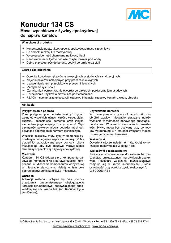 Konudur 134 CS Masa szpachlowa z żywicy epoksydowej do napraw kanałów Właściwości produktu • • • • • Konsystencja pasty, tiksotropowa, epoksydowa masa szpachlowa Do obróbki ręcznej lub maszynowej Wysoka odporność chemiczna na kwasy i ługi Nanoszenie na wilgotne podłoże, wiąże również pod wodą Dobra przyczepność do betonu, cegły i ceramiki oraz stali Zakres zastosowania • • • • • • • Obróbka końcówek rękawów renowacyjnych w studniach kanalizacyjnych Klejenie pakerów naklejanych przy pracach iniekcyjnych Uszczelnianie rys i przecieków w pracach iniekcyjnych Zamykanie rys i spoin Zamykanie / wyrównywanie otworów po pakerach, porów oraz jam usadowych Uzupełnianie ubytków o niewielkich powierzchniach REACh – scenariusze ekspozycji: czasowa inhalacja, czasowy kontakt z wodą, obróbka Aplikacja Przygotowanie podłoża Przed podjęciem prac podłoże musi być czyste i wolne od wszelkich luźnych części, kurzu, oleju, tłuszczu, pozostałości cementu oraz innych elementów pogarszających przyczepność. Wytrzymałość powierzchniowa podłoża musi odpowiadać odpowiednim normom technicznym. Wszelkie szczeliny, mufy, rysy w elemencie budowlanym podlegające naprawie, muszą być tak uprzednio przygotowane przy pomocy robota frezującego, aby było możliwe wprowadzenie tam masy szpachlowej z żywicy epoksydowej. Mieszanie Konudur 134 CS składa się z komponentu bazowego (komponent A) oraz utwardzacza (komponent B). Mieszanie komponentów odbywa się w mieszadle statycznym. Należy w tym celu dobrać odpowiednią końcówkę mieszacza. Czyszczenie narzędzi W czasie przerw w pracy dłuższych niż czas obróbki żywicy, mieszadło statyczne należy wymienić w momencie ponownego przystąpienia do prac. W ramach czasu obróbki pozostałości żywicy mogą być usuwane przy pomocy MC-Verdunnung EP. Materiał związany można usunąć jedynie mechanicznie. Wskazówki Otwarte kartusze należy jak najszybciej wykorzystać, maksymalnie w ciągu 7 dni. Wskazówki bezpieczeństwa Prosimy o stosowanie się do zaleceń bezpieczeństwa umieszczonych na etykietach opakowań. Pozostałe wskazania bezpieczeństwa znajdują się w karcie informacyjnej „Środki ostrożności przy obróbce żywic reakcyjnych”. GISCODE: RE1 Obróbka Aplikacja materiału odbywa się przy pomocy urządzenia pneumatycznego obsługującego kartusze dwukomorowe, zapewniającego odpowiednią siłę nacisku na tłoki (np. Konudur Injektion Device). 1 MC-Bauchemie Sp. z o.o. • ul. Wyścigowa 39 • 53-011 Wrocław • Tel. +48 71 339 77 44 • Fax: +48 71 339 77 44 [email protected] • www.mc-bauchemie.pl Właściwości techniczne Konudur 134 CS Parametr Jednostka Wartość* Gęstość g/cm Proporcje mieszania 3 Uwagi 1,5 DIN EN ISO 2811-1 przy 20°C i 50% wzgl. wilgotności powietrza objętościowo 2:1 Komponent A : Komponent B Lepkość mPa.s pasta EN ISO 3219 stateczność 10-15mm (w zależności od temperatury) Czas obróbki minut 20 DIN EN ISO 9514 przy 20°C i 50% wzgl. wilgotności powietrza Warunki obróbki °C % K ≥8 - ≤40 ≤ 90 3 temperatura powietrza i podłoża wilgotność względna powietrza powyżej punktu rosy Przyczepność do betonu N/mm² > 2,5 DIN EN ISO 1542 oderwanie do 100% w betonie (w każdej temperaturze i wilgotności) Przyrost przyczepności do stali N/mm² 12 17 21 po 8 godzinach po 16 godzinach po 24 godzinach suche do matowo wilgotnego powłoki mineralne bez wody w porach Wilgotność podłoża Cechy produktowe Konudur 134 CS Środek do czyszczenia MC-Verdunnung EP Kolor Szary Forma dostawy 400 ml podwójne kartusze o proporcjach objętościowych 2:1 po 8 sztuk w kartonie; 10 sztuk mieszacza Super Quadro i 4 rury przedłużające Składowanie W szczelnie zamkniętych, oryginalnych opakowaniach, w suchym pomieszczeniu, w temperaturach między +5°C i +25°C przydatność do użytku wynosi co najmniej rok. Te same warunki dotyczą transportu. Utylizacja opakowań Należy dokładnie opróżniać pojemniki przestrzegając w tym względzie informacji w sprawie opakowań. Na życzenie wysyłamy informacje pt. „Koncepcja firmy MC w sprawie utylizacji całkowicie opróżnionych opakowań transportowych i handlowych”. * Wszystkie wartości techniczne są podane, jeżeli nie zaznaczono inaczej, przy temp. +23°C i 50% względnej wilgotności powietrza Uwaga: Wszelkie informacje zawarte w niniejszej karcie oparte są na naszym doświadczeniu i najlepszej wiedzy, jednakże nie mogą być traktowane jako prawnie wiążące. Należy bezwzględnie każdorazowo stosować się do prawodawstwa miejscowego, w zakresie przeznaczenia oraz zastosowania w obiektach budowlanych. Przy spełnieniu powyższych wymogów odpowiadamy za poprawność przekazanych informacji w ramach naszych Ogólnych Warunków Sprzedaży, Dostaw i Płatności. Wszelkie doradztwo ze strony naszych Współpracowników, odbiegające od treści naszych kart technicznych, jest wiążące jedynie w przypadku pisemnego ich potwierdzenia. W każdym przypadku należy stosować się do ogólnie obowiązujących zasad sztuki budowlanej. Wydanie 07/2013. Niniejszy druk został aktualizowany pod względem technicznym. Unieważnia się dotychczasowe wydania i nie wolno ich stosować. W przypadku wydania nowej karty, zaktualizowanej pod względem technicznym, wydanie niniejsze traci ważność. . 2 MC-Bauchemie Sp. z o.o. • ul. Wyścigowa 39 • 53-011 Wrocław • Tel. +48 71 339 77 44 • Fax: +48 71 339 77 44 [email protected] • www.mc-bauchemie.pl