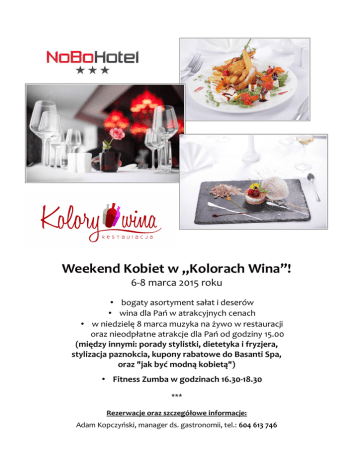 Weekend Kobiet w „Kolorach Wina”! 6-8 marca 2015 roku • bogaty asortyment sałat i deserów • wina dla Pań w atrakcyjnych cenach • w niedzielę 8 marca muzyka na żywo w restauracji oraz nieodpłatne atrakcje dla Pań od godziny 15.00 (między innymi: porady stylistki, dietetyka i fryzjera, stylizacja paznokcia, kupony rabatowe do Basanti Spa, oraz "jak być modną kobietą") • Fitness Zumba w godzinach 16.30-18.30 *** Rezerwacje oraz szczegółowe informacje: Adam Kopczyński, manager ds. gastronomii, tel.: 604 613 746 "Weekend Kobiet od 6 do 8 marca" "Women's Weekend from 6th to 8th March" MENU SAŁATY SALADS Mix sałat z kaczką na carpaccio z żółtego buraka z karmelizowanym jabłkiem i gruszką oraz owocami granatu i truskawki z orientalnym dresingiem / 27 pln Selection of lettuce with duck on carpaccio of yellow beet with caramelized apple and pear, fresh strawberry and pomegrenate sprinked with oriental sauce / 27 pln Sałatka z polędwicą wołową paloną w sianie podana na rukoli i liściach szpinaku z sosem serowym / 28 pln Mixed green salad with beef tenderloin strips roasted in the hay served on arugula and spinach leaves with cheese sauce / 28 pln - Figi karmelizowane w sosie balsamicznym na mozaice sezonowych owoców z chipsem z parmezanu i cytrynowym sorbetem / 31 pln - Figs caramelised in 'balsamico' served on a mosaic of seasonal fruit with chips of Parmesan and lemon sorbet, 31 pln DESERY DESSERTS Duet musów czekoladowych na malinach serwowany z miodowymi ciasteczkami / 14 pln Chocolate mousse duo on raspberries served with honey biscuits / 14 pln Truskawki w pieprzu z sosem balsamicznym serwowane na waniliowym serku mascarpone / 16 pln Strawberries with balsamic sauce seasoned with pepper, served on vanilla mascarpone cheese / 16 pln - Lekka pianka jogurtowa z frużeliną wiśniową podana na ciastku z kajmakiem / 15 pln Light yoghurt mousse with cherry jam on kaymak cake served on the cake with kajmakiem / 15 pln www.kolory-wina.pl "Weekend Kobiet od 6 do 8 marca" "Women's Weekend from 6th to 8th March" WINA WINES Prosecco Treviso / Paladio, Italia wytrawne, owocowe, lekkie, musujące 60 pln / butelka 75 cl [white dry, fruity, light, sparkling] *** Bianco/Rosso Verona 2013 / Tenute Ca 'Botta, Italia białe lub czerwone półwytrawne, lekkie, owocowe 8 pln / kieliszek 125 ml | 45 pln / butelka 75 cl [white or red semi-dry, light, fruity] *** Valpolicella 2012 / Tenute Ca 'Botta, Italia czerwone wytrawne, rześkie, owocowe, czerwone 55 pln / butelka 75 cl [red dry, juicy, fruity] *** Chianti Colli Senesi 2008 / Tenuta di Petriolo, Italia czerwone wytrawne, soczyste, owocowe 70 pln / butelka 75 cl [red dry, juicy, fruity] *** Wino Weekendu: Gewürztraminer 2012 / Weiser, Alsace, France białe, półsłodkie, pełne, korzenne 12 pln / kieliszek 125 ml | 70 pln / butelka 75 cl [white, semi-sweet, full-bodied, spicy] Dołożymy wszelkich starań, aby Wydarzenie tego Dnia spełniło Państwa oczekiwania i odbyło się na najwyższym poziomie. NoBo Hotel Łódź, Restauracja „Kolory Wina” 91-357 Łódź, ul. Liściasta 86 / al. Włókniarzy, www.nobohotel.pl, www.kolory-wina.pl