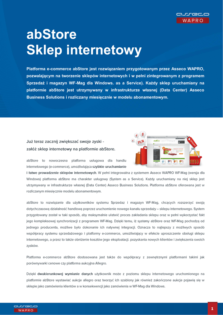 abStore Sklep internetowy abStore Sklep internetowy Platforma e-commerce abStore jest rozwiązaniem przygotowanym przez Asseco WAPRO, pozwalającym na tworzenie sklepów internetowych i w pełni zintegrowanym z programem Sprzedaż i magazyn WF-Mag dla Windows. as a Service). Każdy sklep uruchamiany na platformie abStore jest utrzymywany w infrastrukturze własnej (Data Center) Asseco Business Solutions i rozliczany miesięcznie w modelu abonamentowym. 1 abStore Sklep internetowy Możliwości o o o o o o o o o o o o o o o o o o o 2 abStore Sklep internetowy o o o o o o o o o o o o o 3