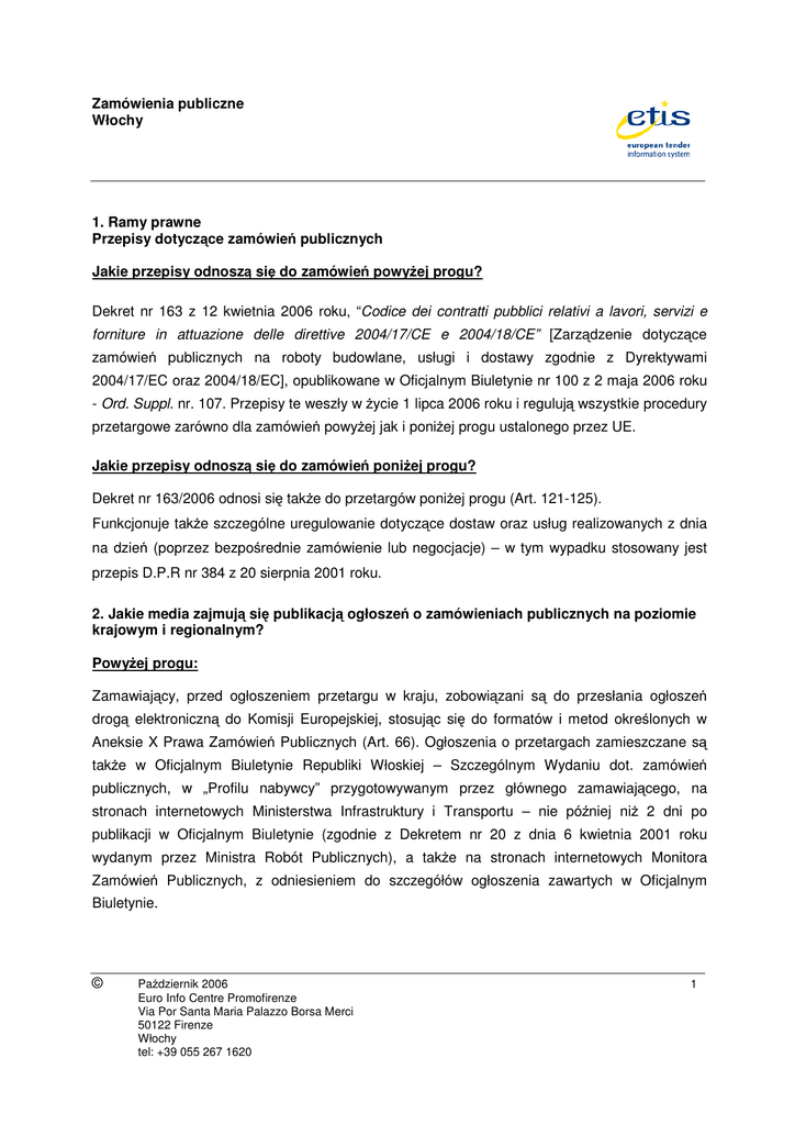 Zamówienia publiczne Włochy 1. Ramy prawne Przepisy dotyczące zamówień publicznych Jakie przepisy odnoszą się do zamówień powyŜej progu? Dekret nr 163 z 12 kwietnia 2006 roku, “Codice dei contratti pubblici relativi a lavori, servizi e forniture in attuazione delle direttive 2004/17/CE e 2004/18/CE” [Zarządzenie dotyczące zamówień publicznych na roboty budowlane, usługi i dostawy zgodnie z Dyrektywami 2004/17/EC oraz 2004/18/EC], opublikowane w Oficjalnym Biuletynie nr 100 z 2 maja 2006 roku - Ord. Suppl. nr. 107. Przepisy te weszły w Ŝycie 1 lipca 2006 roku i regulują wszystkie procedury przetargowe zarówno dla zamówień powyŜej jak i poniŜej progu ustalonego przez UE. Jakie przepisy odnoszą się do zamówień poniŜej progu? Dekret nr 163/2006 odnosi się takŜe do przetargów poniŜej progu (Art. 121-125). Funkcjonuje takŜe szczególne uregulowanie dotyczące dostaw oraz usług realizowanych z dnia na dzień (poprzez bezpośrednie zamówienie lub negocjacje) – w tym wypadku stosowany jest przepis D.P.R nr 384 z 20 sierpnia 2001 roku. 2. Jakie media zajmują się publikacją ogłoszeń o zamówieniach publicznych na poziomie krajowym i regionalnym? PowyŜej progu: Zamawiający, przed ogłoszeniem przetargu w kraju, zobowiązani są do przesłania ogłoszeń drogą elektroniczną do Komisji Europejskiej, stosując się do formatów i metod określonych w Aneksie X Prawa Zamówień Publicznych (Art. 66). Ogłoszenia o przetargach zamieszczane są takŜe w Oficjalnym Biuletynie Republiki Włoskiej – Szczególnym Wydaniu dot. zamówień publicznych, w „Profilu nabywcy” przygotowywanym przez głównego zamawiającego, na stronach internetowych Ministerstwa Infrastruktury i Transportu – nie później niŜ 2 dni po publikacji w Oficjalnym Biuletynie (zgodnie z Dekretem nr 20 z dnia 6 kwietnia 2001 roku wydanym przez Ministra Robót Publicznych), a takŜe na stronach internetowych Monitora Zamówień Publicznych, z odniesieniem do szczegółów ogłoszenia zawartych w Oficjalnym Biuletynie. © Październik 2006 Euro Info Centre Promofirenze Via Por Santa Maria Palazzo Borsa Merci 50122 Firenze Włochy tel: +39 055 267 1620 1 Zamówienia publiczne Włochy W Ŝadnym wypadku ogłoszenia publikowane we Włoszech nie mogą róŜnić się od ogłoszeń przesyłanych do Komisji Europejskiej. Ogłoszenia o przetargach publikowane są 12 dni po ich przesłaniu do Komisji lub 5 dni w uzasadnionych przypadkach, w postaci skrótu w przynajmniej dwóch głównych krajowych dziennikach oraz w przynajmniej dwóch najbardziej poczytnych lokalnych gazetach w regionie właściwym dla wykonania zamówienia. PoniŜej progu: W przypadku zamówień poniŜej progu zamawiający nie jest w Ŝaden sposób zobowiązany do zamieszczenia ogłoszenia czy teŜ przesyłania informacji o zamówieniu poza granicami Włoch. W przypadku robót budowlanych ogłoszenia o przetargu publikowane są nie tylko w „Profilu nabywcy”, ale takŜe na stronach internetowych Ministerstwa Infrastruktury oraz w skróconej postaci w krajowym dzienniku oraz gazecie lokalnej. JeŜeli wartość zamówienia przekracza 500,000 EUR stosowne ogłoszenie zamieszczane jest takŜe w Oficjalnym Biuletynie, a w przypadku zamówień o mniejszej wartości – ogłoszenie zamieszczane jest na tablicy ogłoszeń urzędu miejskiego właściwego dla miejsca realizacji zamówienia. W przypadku usług i dostaw o wartości poniŜej progu ogłoszenia są publikowane w Oficjalnym Biuletynie Republiki Włoskiej – Szczególnym Wydaniu dot. zamówień publicznych , na stronach internetowych Monitora Zamówień Publicznych lub na tablicy ogłoszeń Głównego Zamawiającego. Prawne konsekwencje związane z zamieszczonym ogłoszeniem są efektywne od dnia publikacji w Oficjalnym Biuletynie. 3. Jakie stosowane są procedury przetargowe? PowyŜej progu: Procedury wyboru ofert, które sprowadzają się do oczywistego i koniecznego etapu wyboru najlepszej oferty w oparciu o kryteria takie jak najniŜsza cena lub najbardziej ekonomiczna oferta, mogą zostać podzielone na: a) zwykłe procedury (przetarg nieograniczony oraz przetarg ograniczony), które mogą być stosowane zgodnie z uznaniem zamawiającego; b) procedury, którego mogą być stosowane tylko w określonych okolicznościach: - a) negocjacje z ogłoszeniem; - b) negocjacje bez ogłoszenia; - c) dialog konkurencyjny; © Październik 2006 Euro Info Centre Promofirenze Via Por Santa Maria Palazzo Borsa Merci 50122 Firenze Włochy tel: +39 055 267 1620 2 Zamówienia publiczne Włochy - d) konkurs na projekt; - e) system dynamicznych zakupów. Procedura jest wybierana przez zamawiającego w celu wybrania najkorzystniejszej oferty w zgodzie z powyŜszymi kryteriami. Informacja o formie przetargu zawarta jest w ogłoszeniu (jeŜeli konkretna procedura stawia taki wymóg). PoniŜej progu: A) Dla zamówień poniŜej progu na roboty budowlane (art. 122-123): Warunki dotyczące przesyłania zgłoszeń oraz przyjmowania ofert są znacznie ograniczone. Negocjacje z ogłoszeniem są zawsze dopuszczalne dla zamówień na roboty budowlane których wartość nie przekracza 100,000 EUR. Oferty Nietypowe oferty mogą zostać automatycznie odrzucone (jeŜeli otrzymano przynajmniej 5 ofert) bez konieczności stosowania procedur weryfikacji i odrzucenia w przypadku powaŜnie zaniŜonej ceny oferty oraz bez zawartej w ofercie prewencyjnego wyrównania ceny. B) Dla zamówień na dostawy oraz usługi (art. 124): Ogłoszenie o planowanych przetargach w „Profilu nabywcy” nie jest obowiązkowe; zamawiający nie są takŜe zobowiązani do publikowania ogłoszeń o wyniku przetargu. JeŜeli stosowane jest kryterium najniŜszej ceny, zamawiający moŜe zawrzeć w ogłoszeniu o przetargu informację o automatycznym wykluczeniu ofert zawierających zbyt duŜy rabat. Taka moŜliwość jest wykluczona w przypadku gdy liczba otrzymanych ofert jest mniejsza niŜ 5: w takim wypadku zamawiający moŜe wg o