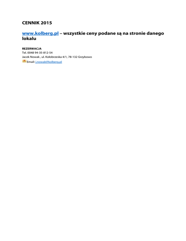CENNIK 2015 www.kolberg.pl – wszystkie ceny podane są na stronie danego lokalu REZERWACJA Tel. 0048 94-35-812-54 Jacek Nowak , ul. Kołobrzeska 4/1, 78-132 Grzybowo Email: [email protected]