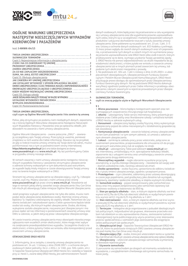 OGÓLNE WARUNKI UBEZPIECZENIA NASTĘPSTW NIESZCZĘŚLIWYCH WYPADKÓW KIEROWCÓW I PASAŻERÓW kod: I-NNWK-04/15 TWOJA UMOWA UBEZPIECZENIA SŁOWNICZEK TERMINÓW Część I: Najważniejsze informacje o ubezpieczeniu Z KIM I NA CO ZAWIERAMY TĘ UMOWĘ PRZEDMIOT UBEZPIECZENIA ZAKRES UBEZPIECZENIA ZA CO NIE ZAPŁACIMY ODSZKODOWANIA SUMA, NA JAKĄ JESTEŚ UBEZPIECZONY Część II: Obsługa ubezpieczenia JAK ZAWIERA MY UMOWĘ UBEZPIECZENIA JAK USTALAMY WYSOKOŚĆ I SPOSÓB OPŁACENIA SKŁADKI OKRES UBEZPIECZENIA I CZAS TRWANIA NASZEJ ODPOWIEDZIALNOŚCI OBOWIĄZKI UBEZPIECZAJĄCEGO I UBEZPIECZONEGO KIEDY MOŻEMY ROZWIĄZAĆ UMOWĘ UBEZPIECZENIA Część III: Osługa szkody JAKIE DZIAŁANIA NALEŻY PODJĄĆ W RAZIE WYPADKU USTALENIE WYSOKOŚCI ŚWIADCZENIA WYPŁATA ODSZKODOWANIA Część IV: Postanowienia końcowe 1 1 2 2 2 3 3 3 3 3 4 4 4 4 5 TWOJA UMOWA UBEZPIECZENIA, czyli czym są Ogólne Warunki Ubezpieczenia i kto zawiera tę umowę Polisa, jaką otrzymujesz po podaniu nam niezbędnych danych, zapoznaniu się z treścią Ogólnych Warunków Ubezpieczenia Następstw Nieszczęśliwych Wypadków Kierowcy i Pasażerów oraz po opłaceniu składki, jest dowodem na zawarcie z nami umowy ubezpieczenia. Ogólne Warunki Ubezpieczenia – zwane potocznie „OWU” – zawierają szczegółowy opis Twojej umowy. Przeczytaj je uważnie, ponieważ znajdziesz w nich ważne dla Ciebie informacje. Dowiesz się na przykład, że gdy w trakcie trwania umowy zmienią się Twoje dane lub adres, musisz poinformować nas o tym za pośrednictwem strony internetowej https://ekonto.ergohestia.pl (jest ona także dostępna ze strony www.youcandrive.pl oraz www.mtu24.pl). My też poinformujemy Ciebie w przypadku zmiany naszego adresu. W ramach zawartej z nami umowy ubezpieczenia następstw nieszczęśliwych wypadków kierowcy i pasażerów otrzymujesz ubezpieczenie o zakresie ochrony wskazanym w tym dokumencie pod warunkiem, że wypadki będą miały miejsce w czasie obowiązywania Twojej umowy oraz na terenie krajów wskazanych w OWU. Stronami tej umowy ubezpieczenia są Ubezpieczający, czyli Ty, i Ubezpieczyciel, czyli my. Możesz zawrzeć z nami umowę przez stronę www.youcandrive.pl lub przez stronę www.mtu24.pl. Niezależnie od tego w ramach jakiej oferty zawarłeś swoje ubezpieczenie (You Can Drive lub mtu24.pl) obowiązują Ciebie niniejsze Ogólne Warunki Ubezpieczenia. Jeżeli pragniesz wykupić ubezpieczenie nie tylko dla siebie, musisz nam podać dane ubezpieczanej dodatkowo osoby. Niemniej stroną umowy będziesz Ty i będziesz zobowiązany do zapłaty składki. Natomiast do uzyskania świadczeń i odszkodowań oprócz Ciebie uprawniona będzie także osoba lub osoby, dla których kupiłeś ubezpieczenie. Osoba, dla której wykupione zostało ubezpieczenie, nazywana jest Ubezpieczonym i ma prawo żądać od nas informacji o postanowieniach zawartej umowy oraz OWU w zakresie, w jakim dotyczą praw i obowiązków Ubezpieczonego. W czasie trwania umowy ubezpieczenia masz obowiązek niezwłocznego zgłaszania nam wszelkich zmian okoliczności, które mogą mieć wpływ na zwiększenie prawdopodobieństwa wypadku. Szczególnie chodzi o te okoliczności, o które pytamy Ciebie we wniosku albo korespondencji przed zawarciem umowy ubezpieczenia. OŚWIADCZENIE ERGO HESTII 1. Informujemy, że w związku z zawartą umową ubezpieczenia na podstawie art. 24 ust. 1 Ustawy z dnia 29.08.1997 r. o ochronie danych osobowych (tekst jednolity: Dz.U. z 2014 r. nr 1182, poz. 926 z późn. zm.): 1) Sopockie Towarzystwo Ubezpieczeń ERGO Hestia SA z siedzibą w Sopocie przy ul. Hestii 1, zwane dalej ERGO Hestią, jest administratorem Twoich KM/OW084/1506 danych osobowych, które będą przez nią przetwarzane w celu wywiązania się z umowy ubezpieczenia oraz dla wypełnienia prawnie usprawiedliwionych celów, którymi są w szczególności: marketing bezpośredni własnych produktów i usług oraz dochodzenie roszczeń z tytułu zawartej umowy ubezpieczenia. Dane pobierane są na podstawie: art. 23 ust. 1 pkt. 3 i 5 ww. Ustawy o ochronie danych osobowych i art. 815 Kodeksu cywilnego; 2) masz prawo wglądu do swoich danych osobowych oraz ich poprawiania, a przetwarzanie tych danych w celach innych niż wymienione powyżej prawnie usprawiedliwione cele ERGO Hestii albo osób trzecich, którym przekazywane są te dane, wymaga uzyskania Twojej uprzedniej zgody. 2. ERGO Hestia nie ponosi odpowiedzialności za skutki niepodania do jej wiadomości okoliczności, o które pytała we wniosku o zawarcie umowy ubezpieczenia lub w innych pismach przed zawarciem tej umowy, lub podanie tych okoliczności niezgodnie z prawdą. 3. Na podstawie art. 104 ust. 1 pkt 4 Ustawy z dnia 22.05.2003 r. o ubezpieczeniach obowiązkowych, Ubezpieczeniowym Funduszu Gwarancyjnym i Polskim Biurze Ubezpieczycieli Komunikacyjnych, ERGO Hestii przysługuje prawo dostępu do zgromadzonych przez Ubezpieczeniowy Fundusz Gwarancyjny danych. Na tej podstawie ERGO Hestia dokonuje weryfikacji zgodności podanych przez Ciebie informacji o przebiegu ubezpieczenia z danymi zawartymi w rejestrze prowadzonym przez Ubezpieczeniowy Fundusz Gwarancyjny. SŁOWNICZEK TERMINÓW, czyli co znaczą pojęcia użyte w Ogólnych Warunkach Ubezpieczenia §1 1. Blizna pourazowa – blizna będąca następstwem oparzeń oraz ran wymagających zaopatrzenia chirurgicznego lub hospitalizacji. 2. eKonto – udostępniany Tobie serwis internetowy, który prezentuje posiadane przez Ciebie polisy oraz likwidowane szkody i umożliwia kontakt z ERGO Hestią w zakresie wybranych usług. 3. Konsument – ubezpieczony będący osobą fizyczną, który wykorzystuje ubezpieczony pojazd do celów niezwiązanych z działalnością gospodarczą lub zawodową. 4. Kontynuacja ubezpieczenia – zawarcie kolejnej umowy ubezpieczenia na ten sam przedmiot i w tym samym zakresie, co umowa z zakończonym okresem ubezpieczenia. 5. Lokaut – zamknięcie zakładu pracy przez właściciela, połączone ze zwaln