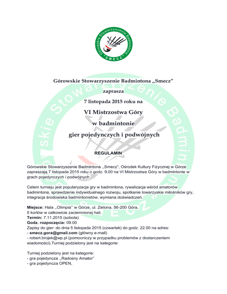 Górowskie Stowarzyszenie Badmintona ,,Smecz” zaprasza 7 listopada 2015 roku na VI Mistrzostwa Góry w badmintonie gier pojedynczych i podwójnych REGULAMIN Górowskie Stowarzyszenie Badmintona ,,Smecz”, Ośrodek Kultury Fizycznej w Górze zapraszają 7 listopada 2015 roku o godz. 9.00 na VI Mistrzostwa Góry w badmintonie w grach pojedynczych i podwójnych. Celem turnieju jest popularyzacja gry w badmintona, rywalizacja wśród amatorów badmintona, sprawdzenie indywidualnego rozwoju, spotkanie towarzyskie miłośników gry, integracja środowiska badmintonistów, wymiana doświadczeń. Miejsce: Hala ,,Olimpia’’ w Górze, ul. Zielona, 56-200 Góra, 5 kortów w całkowicie zaciemnionej hali. Termin: 7.11.2015 (sobota) Godz. rozpoczęcia: 09.00 Zapisy do gier: do dnia 5 listopada 2015 (czwartek) do godz. 22.00 na adres: - [email protected] (główny e-mail) - [email protected] (pomocniczy w przypadku problemów z dostarczeniem wiadomości).Turniej podzielony jest na kategorie: Turniej podzielony jest na kategorie: - gra pojedyncza ,,Radosny Amator” - gra pojedyncza OPEN, - gra pojedyncza +40 lat - gra pojedyncza +50 lat (min. 5 zawodników zgłoszonych do dnia 3.11.2015), - gra pojedyncza kobiet (min 3 zawodniczek zgłoszonych do 3.11.2015), - gra podwójna Open - gra mieszana Open - gra podwójna kobiet (min 3 pary zgłoszone do dnia 03.11.2015 - termin bezwzględny, zgłoszenia po tym terminie nie będą przyjmowane) W przypadku rozgrywania gry podwójnej kobiet kategoria ,,gra podwójna OPEN" zmieniona zostanie na ,,grę podwójną mężczyzn". W kategorii ,,Radosny Amator” zgłosić się mogą zawodnicy, którzy oceniają swoją grę na poziomie amatorskim podstawowym. W przypadku oceny przez organizatora wyższych umiejętności gry u danego zawodnika prowadzący zastrzega możliwość przeniesienia danego zawodnika z tej kategorii. Ilość zgłoszeń warunkować będzie decyzję organizatora o możliwości uczestniczenia zawodnika w maksymalnie dwóch lub trzech kategoriach. Organizator nie ponosi odpowiedzialności za kontuzje, wypadki, problemy zdrowotne uczestników podczas trwania zawodów, zawodnik startuje na własną odpowiedzialność. System gier: grupowo-pucharowy, do 15 pkt w fazie grupowej bez podwyższenia. W fazie pucharowej przewiduje się grę do 21 pkt. Lotki Yonex Mavis 2000 zapewnia organizator. Na grę lotkami piórowymi zgodę wyrazić muszą obydwoje zawodników oprócz gry we wszystkich kategoriach OPEN (gra pojedyncza OPEN, gra podwójna Open, - gra mieszana Open) gdzie lotka piórowa jest wyższa od syntetycznej i zgoda drugiej osoby/pary nie obowiązuje. W przypadku zgłoszenia chęci grania lotką piórową zawodnik/para zawodników zgłaszający/para zgłaszająca grę lotką piórową zobowiązany/zobowiązani są do zapewnienia ilości odpowiedniej do rozegrania pojedynku. Nagrody: organizator przewiduje puchary/medale oraz dyplomy od 1 do 3 miejsca. Przewidywane są nagrody rzeczowe oraz losowanie wartościowych nagród/nagrody rzeczowej spośród uczestników turnieju. Sprawy finansowe: - gra pojedyncza - 25 zł - gra podwójna - 25 zł/osobę Organizator zapewnia drobny poczęstunek, wodę (1,5 l wody mineralnej/ os) , ciepły napój (kawa, herbata). W przypadku chęci zagrania w grze podwójnej ale braku partnera prosimy dopisać w zgłoszeniu ,,szukam partnera/partnerki do gry podwójnej/mieszanej). Uczestnik, który dokonuje zgłoszenia zobowiązany jest do zapoznania się z w/w regulaminem i akceptuje jego postanowienia. Zapraszamy