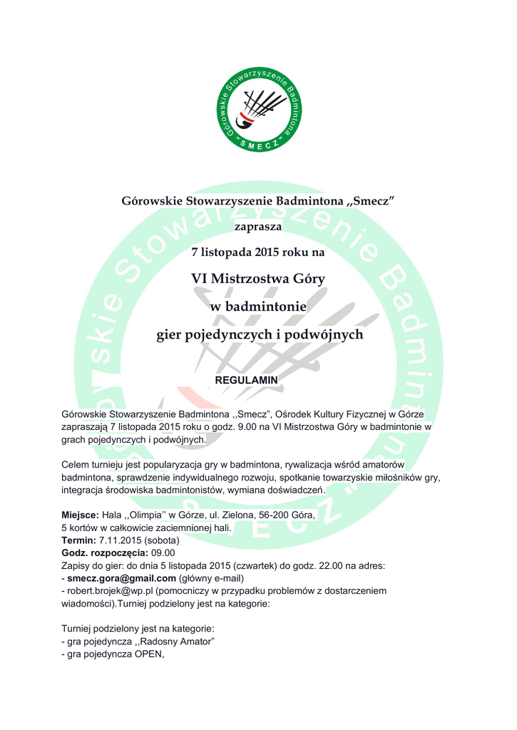 Regulamin VI Mistrzostw Góry w badmintonie 7.11.2015