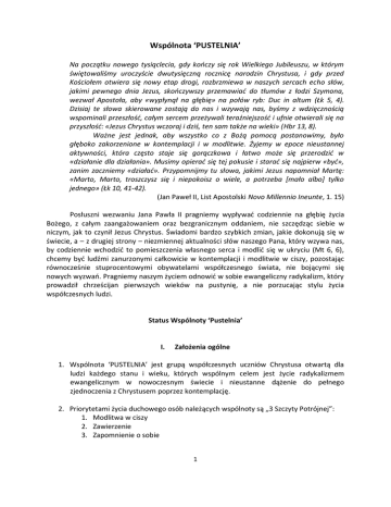 Wspólnota ‘PUSTELNIA’ Na początku nowego tysiąclecia, gdy kończy się rok Wielkiego Jubileuszu, w którym świętowaliśmy uroczyście dwutysięczną rocznicę narodzin Chrystusa, i gdy przed Kościołem otwiera się nowy etap drogi, rozbrzmiewa w naszych sercach echo słów, jakimi pewnego dnia Jezus, skończywszy przemawiać do tłumów z łodzi Szymona, wezwał Apostoła, aby «wypłynął na głębię» na połów ryb: Duc in altum (Łk 5, 4). Dzisiaj te słowa skierowane zostają do nas i wzywają nas, byśmy z wdzięcznością wspominali przeszłość, całym sercem przeżywali teraźniejszość i ufnie otwierali się na przyszłość: «Jezus Chrystus wczoraj i dziś, ten sam także na wieki» (Hbr 13, 8). Ważne jest jednak, aby wszystko co z Bożą pomocą postanowimy, było głęboko zakorzenione w kontemplacji i w modlitwie. Żyjemy w epoce nieustannej aktywności, która często staje się gorączkowa i łatwo może się przerodzić w «działanie dla działania». Musimy opierać się tej pokusie i starać się najpierw «być», zanim zaczniemy «działać». Przypomnijmy tu słowa, jakimi Jezus napomniał Martę: «Marto, Marto, troszczysz się i niepokoisz o wiele, a potrzeba [mało albo] tylko jednego» (Łk 10, 41-42). (Jan Paweł II, List Apostolski Novo Millennio Ineunte, 1. 15) Posłuszni wezwaniu Jana Pawła II pragniemy wypływać codziennie na głębię życia Bożego, z całym zaangażowaniem oraz bezgranicznym oddaniem, nie szczędząc siebie w niczym, jak to czynił Jezus Chrystus. Świadomi bardzo szybkich zmian, jakie dokonują się w świecie, a – z drugiej strony – niezmiennej aktualności słów naszego Pana, który wzywa nas, by codziennie wchodzić to pomieszczenia własnego serca i modlić się w ukryciu (Mt 6, 6), chcemy być ludźmi zanurzonymi całkowicie w kontemplacji i modlitwie w ciszy, pozostając równocześnie stuprocentowymi obywatelami współczesnego świata, nie bojącymi się nowych wyzwań. Pragniemy naszym życiem odnowić w sobie ewangeliczny radykalizm, który prowadził chrześcijan pierwszych wieków na pustynię, a nie porzucając stylu życia współczesnych ludzi. Status Wspólnoty ‘Pustelnia’ I. Założenia ogólne 1. Wspólnota ‘PUSTELNIA’ jest grupą współczesnych uczniów Chrystusa otwartą dla ludzi każdego stanu i wieku, których wspólnym celem jest życie radykalizmem ewangelicznym w nowoczesnym świecie i nieustanne dążenie do pełnego zjednoczenia z Chrystusem poprzez kontemplację. 2. Priorytetami życia duchowego osób należących wspólnoty są „3 Szczyty Potrójnej”: 1. Modlitwa w ciszy 2. Zawierzenie 3. Zapomnienie o sobie 1 3. Modlitwa w ciszy jest podstawową formą kontaktu z Bogiem każdego członka Wspólnoty, podejmowaną codziennie, przynajmniej przez pół godziny, w dowolnej porze i w dowolnym miejscu. Jest ona sercem ‘PUSTELNI’, najbardziej charakterystyczną jej cechą. Jej praktykowanie stanowi wyraz naśladowania Chrystusa, który udawał się na miejsca pustynne i tam modlił się do Ojca (Mk 1, 35). 4. Zawierzenie – to całkowite otwarcie się na każdą chwilę, by dostrzegać w niej wolę Bożą i pełnić ją doskonale. To realizacja wezwania Jezusa, który nie chce byśmy zmarnowali jakikolwiek moment naszego życia, lecz każdy wykorzystali jak najlepiej do wzrostu duchowego siebie. Innymi słowy – zawierzenie to życie chwilą obecną, tu i teraz. 5. Zapomnienie o sobie oznacza życie w duchu Jezusa, który nie przyszedł, aby Mu służono, lecz aby służyć i oddać swoje życie. Jest radykalnym odwróceniem się od egoizmu – myślenia o sobie, szukania siebie, swojej wygody, chwały, czy łatwego życia – po to by żyć według maksymy: „Oddać wszystko i oddać siebie”. 6. Patronami Wspólnoty ‘PUSTELNIA’ są: św. Teresa od Dzieciątka Jezus i św. Franciszek z Asyżu. Wzorem współczesnego życia w pełnym zjednoczeniu Bogiem poprzez kontemplację jest s. Jeanne Marie (+2010) – pustelniczka spod Paryża. 7. Miejscem centralnym i domem macierzystym wspólnoty jest pustelnia św. Teresy od Dzieciątka Jezus na Potrójnej w Beskidzie Małym. II. Członkowie wspólnoty ‘PUSTELNIA’ 1. Członkiem wspólnoty ‘PUSTELNIA’ może być każdy człowiek świecki lub duchowny, osoba samotna lub żyjąca w związku małżeńskim, po osiągnięciu 21-go roku życia, która pragnie żyć duchem ewangelii i duchem pustelni. 2. Wspólnota ‘PUSTELNIA’ obejmuje trzy kręgi zaangażowania: 1. Przyjaciele Pustelni 2. Pustelnicy 3. Fraternia Pustelni 1. Przyjaciele Pustelni Przyjacielem Pustelni może zostać każdy, kto: 1. Był przynajmniej dwa razy na pustelni na Potrójnej i uczestniczył w rekolekcjach „Fundament”, obejmujących konferencje o modlitwie w ciszy, strukturze wewnętrznej człowieka i o wzroście duchowym według schematu „Twierdzy wewnętrznej” św. Teresy z Avila. 2. Modli się codziennie pół godziny w ciszy. 3. Przynajmniej raz na dwa lata uczestniczy w dniach skupienia lub rekolekcjach w pustelni na Potrójnej. 4. Uczestniczy w spotkaniach Wspólnoty, jakie odbywają się raz w miesiącu. 5. Formuje się wewnętrznie, opracowując przynajmniej jedną lekturę duchową w ciągu roku. 2 2. Pustelnicy Pustelnikiem może zostać każdy, kto: 1. Przynajmniej dwa lata był Przyjacielem Pustelni i w tym czasie przynajmniej trzy razy uczestniczył w rekolekcjach lub dniach skupienia w pustelni na Potrójnej. 2. Modli się codziennie pół godziny w ciszy. 3. Kontynuuje swój rozwój duchowy, uczestnicząc w kolejnych stopniach rekolekcji w pustelni na Potrójnej. 4. Uczestniczy w spotkaniach Wspólnoty, jakie odbywają się raz w miesiącu. 5. Podejmuje jakąś formę wolontariatu – zaangażowania się w świecie (do indywidualnego określenia) 6. Formuje się wewnętrznie, opracowując przynajmniej cztery lektury duchowe w ciągu roku. 7. Czuje się duchowo (i w miarę możliwości materialnie) odpowiedzialny za pustelni