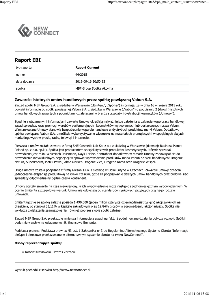 Raporty EBI http://newconnect.pl/?page=1045&ph_main_content_start=show&ncc... Raport EBI typ raportu Raport Current numer 44/2015 data dodania 2015-09-16 20:50:33 spółka MBF Group Spółka Akcyjna Zawarcie istotnych umów handlowych przez spółkę powiązaną Vabun S.A. Zarząd spółki MBF Group S.A. z siedzibą w Warszawie („Emitent”, „Spółka”) informuje, że w dniu 16 września 2015 roku powziął informację od spółki powiązanej Vabun S.A. z siedzibą w Warszawie („Vabun”) o podpisaniu 2 (dwóch) istotnych umów handlowych zawartych z podmiotami działającymi w branży sprzedaży i dystrybucji kosmetyków („Umowy”). Zgodnie z otrzymanymi informacjami zawarte Umowy określają najważniejsze założenia w zakresie współpracy handlowej, zasad sprzedaży oraz promocji wyrobów perfumeryjnych i kosmetyków wytworzonych lub dostarczonych przez Vabun. Wzmiankowane Umowy stanowią bezpośrednie wsparcie handlowe w dystrybucji produktów marki Vabun. Dodatkowo spółka powiązana Vabun S.A. umożliwia wykorzystywanie wizerunku na materiałach promujących i w specjalnych akcjach marketingowych w prasie, radiu, telewizji i internecie. Pierwsza z umów została zawarta z firmą SHE Cosmetic Lab Sp. z o.o z siedzibą w Warszawie (dawniej: Business Planet Poland sp. z o.o. sp.k.). Spółka jest producentem specjalistycznych produktów kosmetycznych, których sprzedaż prowadzona jest m.in. w sieciach Rossmann, Dayli i Hebe. Kontrahent dodatkowo w ramach Umowy zobowiązał się do prowadzenia indywidualnych negocjacji w sprawie wprowadzenia produktów marki Vabun do sieci handlowych: Drogerie Natura, SuperPharm, Piotr i Paweł, Alma Market, Drogerie Vica, Drogerie Kama oraz Drogerie Wispol. Druga umowa została podpisana z firmą Alleson s.r.o. z siedzibą w Dolni Lutyne w Czechach. Zawarcie umowy oznacza jednocześnie ekspansję produktową na rynku czeskim, gdzie za podpisywanie dalszych umów handlowych oraz budowę sieci sprzedaży odpowiedzialny będzie czeski kontrahent. Umowy zostały zawarte na czas nieokreślony, a ich wypowiedzenie może nastąpić z jednomiesięcznym wypowiedzeniem. W ocenie Emitenta szczegółowe warunki Umów nie odbiegają od standardów rynkowych przyjętych przy tego rodzaju umowach. Emitent łącznie ze spółką zależną posiada 1.490.000 (jeden milion czterysta dziewięćdziesiąt tysięcy) akcji zwykłych na okaziciela, co stanowi 33,11% w kapitale zakładowym oraz 19,84% głosów w zgromadzeniu akcjonariuszy. Spółka nie wyklucza zwiększenia zaangażowania, również poprzez swoje spółki zależne.. Zarząd MBF Group S.A. przekazuje niniejszą informację z uwagi na fakt, iż podejmowane działania dotyczą rozwoju Spółki i będą miały wpływ na osiągane wyniki finansowe Emitenta. Podstawa prawna: Podstawa prawna: §3 ust. 1 Załącznika nr 3 do Regulaminu Alternatywnego Systemu Obrotu "Informacje bieżące i okresowe przekazywane w alternatywnym systemie obrotu na rynku NewConnect". Osoby reprezentujące spółkę: Robert Krassowski - Prezes Zarządu wydruk pochodzi z serwisu http://www.newconnect.pl 1z1 2015-11-06 13:08