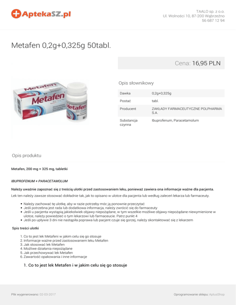 TAALO sp. z o.o. Ul. Wolności 10, 87-200 Wąbrzeźno 56 687 12 94 Metafen 0,2g+0,325g 50tabl. Cena: 16,95 PLN Opis słownikowy Dawka 0,2g+0,325g Postać tabl. Producent ZAKŁADY FARMACEUTYCZNE POLPHARMA S.A. Substancja czynna Ibuprofenum, Paracetamolum Opis produktu Metafen, 200 mg + 325 mg, tabletki IBUPROFENUM + PARACETAMOLUM Należy uważnie zapoznać się z treścią ulotki przed zastosowaniem leku, ponieważ zawiera ona informacje ważne dla pacjenta. Lek ten należy zawsze stosować dokładnie tak, jak to opisano w ulotce dla pacjenta lub według zaleceń lekarza lub farmaceuty. Należy zachować tę ulotkę, aby w razie potrzeby móc ją ponownie przeczytać Jeśli potrzebna jest rada lub dodatkowa informacja, należy zwrócić się do farmaceuty Jeśli u pacjenta wystąpią jakiekolwiek objawy niepożądane, w tym wszelkie możliwe objawy niepożądane niewymienione w ulotce, należy powiedzieć o tym lekarzowi lub farmaceucie. Patrz punkt 4 Jeśli po upływie 3 dni nie nastąpiła poprawa lub pacjent czuje się gorzej, należy skontaktować się z lekarzem Spis treści ulotki 1. Co to jest lek Metafeni w jakim celu się go stosuje 2. Informacje ważne przed zastosowaniem leku Metafen 3. Jak stosować lek Metafen 4. Możliwe działania niepożądane 5. Jak przechowywać lek Metafen 6. Zawartość opakowania i inne informacje 1. Co to jest lek Metafen i w jakim celu się go stosuje Plik wygenerowano: 02-03-2017 Oprogramowanie sklepu: AptusShop TAALO sp. z o.o. Ul. Wolności 10, 87-200 Wąbrzeźno 56 687 12 94 Metafenjest lekiem w postaci tabletek do podawania doustnego. Zawiera dwie substancje czynne ibuprofen oraz paracetamol wykazujące działanie przeciwbólowe, przeciwgorączkowe i przeciwzapalne. Wskazania do stosowania: bóle różnego pochodzenia, w tym: bóle głowy migrena bóle menstruacyjne bóle zębów bóle mięśni bóle kości i stawów bóle lędźwiowo-krzyżowe bóle pourazowe nerwobóle gorączka. Lek przeznaczony jest dla dorosłych i dzieci w wieku powyżej 12 lat. 2. Informacje ważne przed zastosowaniem leku Metafen Kiedynie stosować leku Metafen Jeśli pacjent ma uczulenie na paracetamol, ibuprofen lub którykolwiek z pozostałych składników tego leku (wymienionych w punkcie 6.). Jeśli występuje uczulenie (nadwrażliwość) na leki z grupy NLPZ (niesteroidowe leki przeciwzapalne), w tym kwas acetylosalicylowy; występowanie w przeszłości astmy aspirynowej, obrzęku naczynioruchowego (choroby skóry i błon śluzowych, charakteryzującej się występowaniem obrzęków), skurczu oskrzeli, nieżytu nosa lub pokrzywki, związanych z przyjmowaniem kwasu acetylosalicylowego lub innych leków z grupy NLPZ W ciężkiej niewydolności nerek i (lub) wątroby W przypadku choroby wrzodowej żołądka i (lub) dwunastnicy (czynnej lub w wywiadzie); perforacji lub krwawień, również tych występujących po zastosowaniu leków z grupy NLPZ W ciężkim nadciśnieniu tętniczym W ciężkiej chorobie układu sercowo-naczyniowego, tachykardii (przyspieszonej akcji serca), dławicy piersiowej W ciężkiej niewydolności serca W okresie ciąży i karmienia piersią W czasie jednoczesnego przyjmowania leków przeciwzakrzepowych oraz w skazie krwotocznej (skłonności do krwawień w obrębie, np. skóry i błon śluzowych, nosa, układu pokarmowego) W przypadku zatrzymania moczu W czasie jednoczesnego przyjmowania innych leków z grupy NLPZ, w tym inhibitorów COX-2 U pacjentów, u których występuje wrodzony niedobór dehydrogenazy glukozo-6-fosforanowej U dzieci w wieku poniżej 12 lat W przypadku choroby alkoholowej Ostrzeżenia i środki ostrożności Przed rozpoczęciem stosowania leku Metafen należy omówić to z lekarzem lub farmaceutą. Metafenzawiera paracetamol. Aby uniknąć przedawkowania należy sprawdzić czy inne przyjmowane leki nie zawierają paracetamolu. Jednoczesne, długotrwałe stosowanie różnych leków o działaniu przeciwbólowym może prowadzić do uszkodzenia nerek z ryzykiem niewydolności. Należy zachować ostrożność podczas stosowania leku u osób, u których występują: zaburzenie czynności wątroby i (lub) nerek oraz układu krążenia; u pacjentów, u których występują zaburzenia czynności nerek należy stosować dawki skuteczne, możliwie jak najmniejsze, toczeń rumieniowaty układowy oraz mieszana choroba tkanki łącznej - występuje zwiększone ryzyko rozwoju jałowego Plik wygenerowano: 02-03-2017 Oprogramowanie sklepu: AptusShop TAALO sp. z o.o. Ul. Wolności 10, 87-200 Wąbrzeźno 56 687 12 94 zapalenia opon mózgowych, choroby przewodu pokarmowego w wywiadzie (wrzodziejące zapalenie jelita grubego, choroba Leśniowskiego i Crohna) - może dojść do nasilenia objawów, zaburzenia rytmu serca, nadciśnienie tętnicze, zawał mięśnia sercowego lub niewydolność serca w wywiadzie - może dojść do zatrzymania płynów w organizmie, z powodu pogorszenia czynności nerek, zaburzenia krzepnięcia krwi lub jednocześnie zażywane są leki przeciwzakrzepowe - ibuprofen może przedłużyć czas krwawienia. Lek należy stosować ostrożnie u osób z astmą oskrzelową oraz u osób, u których występują lub w przeszłości występowały inne reakcje uczuleniowe, ze względu na ryzyko wystąpienia skurczu oskrzeli. W przypadku kłopotów z sercem, przebytego udaru lub podejrzenia, że występuje ryzyko tych zaburzeń (np. podwyższone ciśnienie krwi, cukrzyca, zwiększone stężenie cholesterolu, palenie tytoniu) należy omówić sposób leczenia z lekarzem lub farmaceutą. U pacjentów w wieku powyżej 65 lat istnieje większe ryzyko wystąpienia działań niepożądanych, niż u pacjentów młodszych. Przy długotrwałym stosowaniu leku, zwłaszcza u osób z chorobami przewodu pokarmowego w wywiadzie, szczególnie u osób w wieku powyżej 65 lat, istnieje ryzyko wystąpienia krwotoku z przewodu pokarmowego, owrzodzenia lub perforacji. W przypadku wystąpienia wszelkich nietypowych objawów ze strony układu pokarmoweg