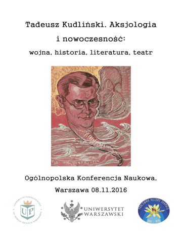 Tadeusz Kudliński. Aksjologia i nowoczesność: wojna, historia, literatura, teatr Ogólnopolska Konferencja Naukowa, Warszawa 08.11.2016 Pracownia Historii Dramatu 1864-1939 przy Instytucie Literatury Polskiej Uniwersytetu Warszawskiego oraz Katedra Literatury XX wieku, Instytut Filologii Polskiej, Uniwersytet Pedagogiczny w Krakowie mają zaszczyt zaprosić na konferencję naukową Tadeusz Kudliński. Aksjologia i nowoczesność: wojna, historia, literatura, teatr O literaturze polskiej okresu dwudziestolecia międzywojennego napisano tak wiele, że anonsowanie kolejnego dyskursu o ambicjach badawczych, który miałby dotyczyć twórczości pisarzy skupionych wokół poznańskiego „Zdroju”, beskidzkiego „Czartaka”, czy wreszcie „Zwrotnicy” i „Skamandra ” można potraktować jako przejaw ignorancji, względnie arogancji. Trudno też w tej sytuacji ustrzec się przed podejrzeniem, że chodzi tu wyłącznie o kolejne „przyczynki do badań” nad literaturą międzywojnia zwłaszcza, że interesuje nas mało do tej pory rozpoznany obszar, zagospodarowany przez prozaików, poetów, dramaturgów, publicystów i ludzi teatru, związanych z „Gazetą Literacką”. Rozważania nad nią mogą wydawać się marginalne i pozostawać w sferze mało interesujących badań szczegółowych, ponieważ, jak wspominał Tadeusz Kudliński, który „w jej redagowaniu magna pars fui”, ukazywały się dwa czasopisma pod takim tytułem. Kudliński debiutował w „Gazecie Literackiej”, wydawanej przez Jerzego Brauna opowiadaniem Ci, którzy w przejściu przez Karpaty… . Debiut w roku 1926 miał zatem miejsce na łamach „Gazety” chronologicznie pierwszej, a opowiadanie, rozgrywające się zimą, w surowym pejzażu górskim podczas kampanii karpackiej uznać można jako zapowiedź powieści Smak świata z roku 1931. Powieść ukazująca z perspektywy żołnierskiej specyfikę walk na froncie włoskim została dobrze przyjęta przez ówczesną krytykę. Pozostając w interakcjach z twórczością Rotha, Barbusse`a, Haška, a na gruncie polskim Wittlina jest wyjątkowa, choćby ze względu na niespotykane nigdzie studium nowoczesnego pola walki zsynchronizowane z psychologicznymi profilami postaci, w których refleksjom aksjologicznym sprzyja żywiołowy biologizm. Dziś jednak Smaku świata nie przypominano nawet z okazji nie tak dawno obchodzonego stulecia wybuchu I wojny światowej. Kudliński, doktor praw na dobrej posadzie w banku, dla którego pisarstwo i prace redakcyjne pozostawały przede wszystkim pasją, wspominając swoją współpracę z czasopismem Jerzego Brauna, mówił wprost o grupie „Gazety”, wywodzącej się z klubu poetyckiego „Helion”, który tworzyli wspomniany już Braun, oraz Józef Aleksander Gałuszka, Marian Sewi (Seelinger), Jan Sztaudynger, Helena Moskwianka, Witold Zechenter, Adam Polewka i Janusz Stępowski. Nie są to rzecz jasna wszyscy, publikujący na łamach „Gazety Literackiej”. Kudliński przedstawił kompletną galerię portretów w rozdziale pod tym właśnie tytułem w tomie Młodości mej stolica. Wspomnienia krakowianina między wojnami. Dodajmy, że do „Gazety” pisywali również Stanisław Pigoń, Leon Płoszewski, Jerzy Eugeniusz Płomieński, Stefan Szuman, a także promotor Kazimierza Wyki i Wacława Kubackiego profesor Stefan Kołaczkowski, oraz Karol Homolacs. Czy ich dorobkowi słusznie przeznaczono dzisiaj manowce naszej kultury narodowej? Owszem, kilku z nich, podobnie jak Tadeusz Kudliński, patronuje ulicom polskich miast. A przecież inicjowali także życie teatralne naszego kraju. Kudliński na przykład zaangażował się w projekt teatru powszechnego, którego genezy szukał w chłopskim teatrze obrzędowym, w ludowych rytuałach, także podmiejskich. Wraz z grupą znajomych aktorów i literatów założył alternatywny teatr „Mikroscena”, gdzie miały miejsce premiery jednoaktówek Wiesława Goreckiego. Autora Oszusta, Buntu, Windy także warto przywrócić pamięci zbiorowej. Wśród ważniejszych inicjatyw teatralnych Kudlińskiego należy wymienić założony w ramach Krakowskiej Konfraterni Teatralnej kolejny teatr alternatywny „Studio 39”. Specjalnie dla tego teatru Marian Niżyński napisał Kawalera księżycowego, „oryginalną trawestację podania o Twardowskim – w duchu ballady Mickiewiczowskiej – trawestacją unowocześnioną w kształcie uroczej komedii muzycznej”. Parodia, humor, commedia del`arte, elementy satyry kabaretowej złożyły się na ów projekt nowoczesności wyrażony poprzez ikonosferę miasta. Kawalera, wystawiono na dziedzińcu Kolegium Nowodworskiego, zespół przygotował także radiową adaptację widowiska, które stało się przebojem sezonu. Oprócz wspomnianej prozy autobiograficznej autor Smaku świata jest także autorem tomu nowel Pierwsza miłość panny Elo, gdzie obok technik narracyjnych nowoczesność znalazła swój wyraz także w tematyce sportowej, rzadko występujące w literaturze polskiej XX w. Kwestie etyczne i moralne podjął w powieści Wygnańcy Ewy. Ciemną stronę rynku odrodzonego państwa polskiego, „machinacje grynderskie” ujawniła z kolei powieść Wuj Rafał i Ska, w której skonstruował szeroką panoramę społeczno-obyczajową tamtego czasu. Na kanwie życia literackiego i teatralnego międzywojnia powstała natomiast powieść Farbowane lisy, zainspirowana okolicznościami i atmosferą jubileuszu Emila Zegadłowicza. O różnorodności warsztatu i zainteresowań krakowskiego literata świadczą powieści historyczne Tadeusza Kudlińskiego, jak choćby Rumieńce, Uroki, czy Gniew o Szoszannę: powieść z dawnych dziejów Izraela, oraz studia i szkice o teatrze, zebrane w tomach Dawne i nowe przypadki „teatrała” i Rodowód polskiego teatru, oraz publicystyka i dziesiątki recenzji, zamieszczonych w rozmaitych czasopismach. Przedstawiona bibliografia wymaga oczywiście uzupełnienia, lecz pragniemy jedynie zarysować 