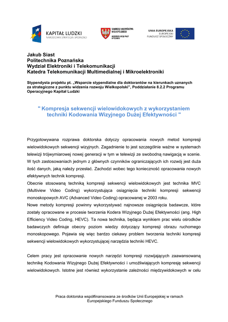 Jakub Siast Politechnika Poznańska Wydział Elektroniki i Telekomunikacji Katedra Telekomunikacji Multimedialnej i Mikroelektroniki Stypendysta projektu pt. „Wsparcie stypendialne dla doktorantów na kierunkach uznanych za strategiczne z punktu widzenia rozwoju Wielkopolski”, Poddziałanie 8.2.2 Programu Operacyjnego Kapitał Ludzki " Kompresja sekwencji wielowidokowych z wykorzystaniem techniki Kodowania Wizyjnego Dużej Efektywności " Przygotowywana rozprawa doktorska dotyczy opracowania nowych metod kompresji wielowidokowych sekwencji wizyjnych. Zagadnienie to jest szczególnie ważne w systemach telewizji trójwymiarowej nowej generacji w tym w telewizji ze swobodną nawigacją w scenie. W tych zastosowaniach jednym z głównych czynników ograniczających ich rozwój jest duża ilość danych, jaką należy przesłać. Zachodzi wobec tego konieczność opracowania nowych efektywnych technik kompresji. Obecnie stosowaną techniką kompresji sekwencji wielowidokowych jest technika MVC (Multiview Video Coding) wykorzystująca osiągnięcia techniki kompresji sekwencji monoskopowych AVC (Advanced Video Coding) opracowanej w 2003 roku. Nowe metody kompresji powinny wykorzystywać najnowsze osiągnięcia badawcze, które zostały opracowane w procesie tworzenia Kodera Wizyjnego Dużej Efektywności (ang. High Efficiency Video Coding, HEVC). Ta nowa technika, będąca wynikiem prac wielu ośrodków badawczych definiuje obecny poziom wiedzy dotyczący kompresji obrazu ruchomego monoskopowego. Pojawia się więc bardzo ciekawy problem tworzenia techniki kompresji sekwencji wielowidokowych wykorzystującej narzędzia techniki HEVC. Celem pracy jest opracowanie nowych narzędzi kompresji rozwijających zaawansowaną technikę Kodowania Wizyjnego Dużej Efektywności i umożliwiających kompresję sekwencji wielowidokowych. Istotne jest również wykorzystanie zależności międzywidokowych w celu Praca doktorska współfinansowana ze środków Unii Europejskiej w ramach Europejskiego Funduszu Społecznego uzyskania dużego stopnia kompresji. Zaproponowane techniki mają być przebadane eksperymentalnie w celu dokładnej oceny ich faktycznego wpływu na efektywność kompresji. W pracy przeprowadzona zostanie analiza kodeka HEVC pod kątem możliwości jego adaptacji do kompresji wielowidokowych sekwencji wizyjnych. Autor dokonał przeglądu istniejących technik kompresji sekwencji wielowidokowych z analizą ich właściwości i możliwości adaptacji w koderze HEVC. W ramach pracy zostaną opracowane autorskie narzędzia dedykowane dla kompresji sekwencji wielowidokowych, które zostaną połączone z oprogramowaniem przygotowanych w Katedrze Telekomunikacji Multimedialnej i Mikroelektroniki. Przeprowadzone zostaną badania eksperymentalne przy użyciu sekwencji testowych udostępnianych przez komitet MPEG. Rozważania teoretyczne dotyczące autorskich narzędzi kodowania zostaną skonfrontowane z wynikami eksperymentów oraz z wynikami prac innych autorów. Opracowanie techniki kodowania sekwencji wielowidokowych to nie tylko ciekawe zagadnienie badawcze ale również możliwości praktycznego zastosowania wyników badań. Na terenie województwa wielkopolskiego działa szereg firm zajmujących się techniką wizyjną najnowszej generacji. Mogą one zaadoptować wyniki badań pracy doktorskiej w swoich produktach. Nie można również pominąć znaczenia doświadczenia jakie niesie ze sobą praca z najnowszymi generacjami kodeków wizyjnych, dla firm z tej branży. Za przykład wielkopolskich firm, które mogą zastosować wyniki badań z pracy doktorskiej mogą posłużyć: ADB Polska, Telwizja Polska, Arpol oraz Samsung Poland. Na rynku istnieje zapotrzebowanie na nowe funkcjonalności systemów telewizyjnych i producenci dokładają starań aby ten popyt zaspokoić. Ośrodki naukowe stanowią, dla takich firm źródło innowacji i źródło aktualnej wiedzy na temat prac prowadzonych w dziedzinie. Praca doktorska współfinansowana ze środków Unii Europejskiej w ramach Europejskiego Funduszu Społecznego