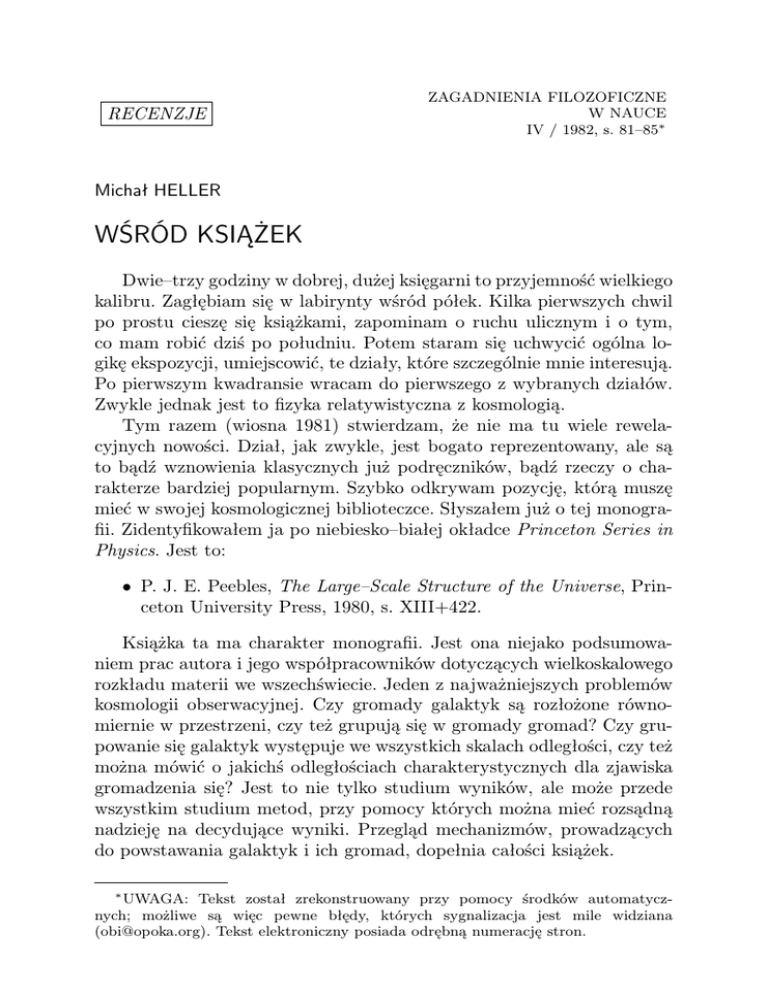RECENZJE ZAGADNIENIA FILOZOFICZNE W NAUCE IV / 1982, s. 81–85∗ Michał HELLER WŚRÓD KSIĄŻEK Dwie–trzy godziny w dobrej, dużej księgarni to przyjemność wielkiego kalibru. Zagłębiam się w labirynty wśród półek. Kilka pierwszych chwil po prostu cieszę się książkami, zapominam o ruchu ulicznym i o tym, co mam robić dziś po południu. Potem staram się uchwycić ogólna logikę ekspozycji, umiejscowić, te działy, które szczególnie mnie interesują. Po pierwszym kwadransie wracam do pierwszego z wybranych działów. Zwykle jednak jest to fizyka relatywistyczna z kosmologią. Tym razem (wiosna 1981) stwierdzam, że nie ma tu wiele rewelacyjnych nowości. Dział, jak zwykle, jest bogato reprezentowany, ale są to bądź wznowienia klasycznych już podręczników, bądź rzeczy o charakterze bardziej popularnym. Szybko odkrywam pozycję, którą muszę mieć w swojej kosmologicznej biblioteczce. Słyszałem już o tej monografii. Zidentyfikowałem ja po niebiesko–białej okładce Princeton Series in Physics. Jest to: • P. J. E. Peebles, The Large–Scale Structure of the Universe, Princeton University Press, 1980, s. XIII+422. Książka ta ma charakter monografii. Jest ona niejako podsumowaniem prac autora i jego współpracowników dotyczących wielkoskalowego rozkładu materii we wszechświecie. Jeden z najważniejszych problemów kosmologii obserwacyjnej. Czy gromady galaktyk są rozłożone równomiernie w przestrzeni, czy też grupują się w gromady gromad? Czy grupowanie się galaktyk występuje we wszystkich skalach odległości, czy też można mówić o jakichś odległościach charakterystycznych dla zjawiska gromadzenia się? Jest to nie tylko studium wyników, ale może przede wszystkim studium metod, przy pomocy których można mieć rozsądną nadzieję na decydujące wyniki. Przegląd mechanizmów, prowadzących do powstawania galaktyk i ich gromad, dopełnia całości książek. ∗ UWAGA: Tekst został zrekonstruowany przy pomocy środków automatycznych; możliwe są więc pewne błędy, których sygnalizacja jest mile widziana ([email protected]). Tekst elektroniczny posiada odrębną numerację stron. 2 Michał HELLER Inna nowość dotyczy historii nauki. Studium powstania i wczesnych interpretacji szczególnej teorii względności: • A. J. Miller, Albert Einstein’s Special Theory of Relativity: Emergence (1905) and Early Interpretation (1905–1911), Addison– Wesley Publ. Comp. 1981, s. XXVIII + 466. Artykuł Einsteina „O elektrodynamice ciał w ruchu” niewątpliwie zapoczątkował nową erę w fizyce. Miller stara się zrozumieć atmosferę w fizyce (m. in. prace Hertza, Lorentza, Poincare’go), która stworzyła warunki dla Einsteinowskiej rewolucji, a także filozoficzne inspiracje, które sterowały poszukiwaniami Einsteina. Znaczną część książki zajmuje drobiazgowa wręcz analiza tekstu artykułu twórcy szczególnej teorii względności. Rzetelność nie opuszcza autora, gdy przechodzi on do przedstawienia rozwoju poglądu samego Einsteina po roku 1905 oraz różnych sporów i polemik spowodowanych pojawieniem się nowej teorii. Książka niezbędna nie tylko dla historyków XX–wiecznej nauki, ale także dla tych wszystkich fizyków, którzy interesują się przeszłością z jakiej wyrośli. Gdy już jesteśmy przy historii nauki, warto uważnie przejrzeć książkę: • M. Jammer, Das Problem des Raumes — Die Entwicklung der Raumtheorien, Wissenschaftliche Buchgesellschaft, Darmstadt 1980, XVII + 240. Jest to drugie, uzupełnione wydanie jednej z pozycji słynnej serii książek Jammera poświęconych ewolucji różnych pojęć występujących we współczesnej nauce. Autor dodał w tym wydaniu rozdział o aktualnych dziś problemach dotyczących przestrzeni. Szkoda, że rozdział ten jest tak skrótowy. Z półki astronomicznej decyduję się na dwie pozycje. Pierwsza: • W. J. Kaufmann, Black Holes and Warped Spacetime, Freeman and Comp. 1979, s. X + 221. Jest pozycją popularną: ewolucja gwiazd, fizyka czarnych dziur, kwazary kosmologia. Tekst interesujący, przejrzysty, ale kupuję ją tylko ze względu na wspaniałe fotografie astronomiczne. Można podziwiać technikę edytorską. Druga książka astronomiczna też o charakterze popularnym mniej interesuje mnie, ale poleciłbym ją tym wszystkim, których pociąga astrologia. Idzie o książkę: WŚRÓD KSIĄŻEK 3 • R. B. Culver. Ph. A. Ianna, The Gemini Syndrome — Star Wars of the Oldest Kind, Pachart Publishing House, 1979, s. VIII + 216. Dwaj zawodowi astronomowie zadali sobie wiele trudu, by zgłębić tajniki stawiania horoskopów. Ze znawstwem demaskują teraz bezskuteczność astrologicznych metod. Zwykle dłużej myszkuję w dziale matematycznym. Matematyka sama dla siebie jest pasjonującą dziedziną wiedzy, do wielu różnych badań. Każdą dziedzinę matematyki warto znać, a ponieważ jest tu zwykle wiele nowości, wybór jest bardzo trudny. Dziś moją uwagę zwraca gruby tom wydany po angielsku przez PWN, w Warszawie: • A. O. Barut, R. Rączka, Theory of Group Representations and Applications, PWN — Polish Scietific Publishers, Warszawa 1980, s. XIX + 717. Jest to drugie wydanie rozszerzone. Prawie wszystko o teorii reprezentacji grup plus wiele pokrewnych działów matematyki. Ścisłość w matematycznej monografii, ale jest też wiele zastosowań do fizyki, zwłaszcza do mechaniki relatywistycznej. Przy pierwszym kartkowaniu odnoszę wrażenie, że polski wydawca powinien się postarać o lepszą kosmetykę angielskiego tekstu. Wreszcie dział filozoficzny. Rzucają się w oczy dwa eleganckie tomy: • Faith and Science in an Unjust World, tom 1: Plenary Presentations, pod redakcją: R. L. Shinna, s. XIV + 392, t. 2: Reports and Recommendations, pod red.: P. Abrechta, VIII + 214, World Council of Chuches, Geneva, 1980. Tomy te zawierają akta i sprawozdania kongresu zorganizowanego przez Światową Radę Kościołów na temat: