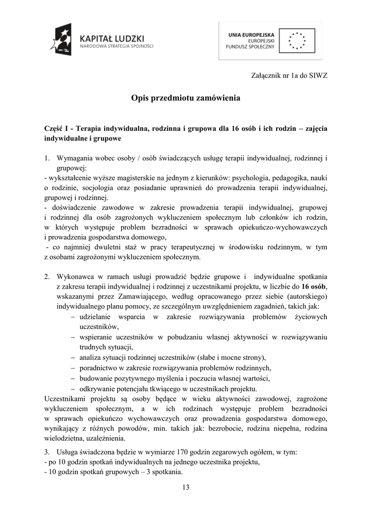 Załącznik nr 1a do SIWZ Opis przedmiotu zamówienia Część I - Terapia indywidualna, rodzinna i grupowa dla 16 osób i ich rodzin – zajęcia indywidualne i grupowe 1. Wymagania wobec osoby / osób świadczących usługę terapii indywidualnej, rodzinnej i grupowej: - wykształcenie wyższe magisterskie na jednym z kierunków: psychologia, pedagogika, nauki o rodzinie, socjologia oraz posiadanie uprawnień do prowadzenia terapii indywidualnej, grupowej i rodzinnej. - doświadczenie zawodowe w zakresie prowadzenia terapii indywidualnej, grupowej i rodzinnej dla osób zagrożonych wykluczeniem społecznym lub członków ich rodzin, w których występuje problem bezradności w sprawach opiekuńczo-wychowawczych i prowadzenia gospodarstwa domowego, - co najmniej dwuletni staż w pracy terapeutycznej w środowisku rodzinnym, w tym z osobami zagrożonymi wykluczeniem społecznym. 2. Wykonawca w ramach usługi prowadzić będzie grupowe i indywidualne spotkania z zakresu terapii indywidualnej i rodzinnej z uczestnikami projektu, w liczbie do 16 osób, wskazanymi przez Zamawiającego, według opracowanego przez siebie (autorskiego) indywidualnego planu pomocy, ze szczególnym uwzględnieniem zagadnień, takich jak: udzielanie wsparcia w zakresie rozwiązywania problemów życiowych uczestników, wspieranie uczestników w pobudzaniu własnej aktywności w rozwiązywaniu trudnych sytuacji, analiza sytuacji rodzinnej uczestników (słabe i mocne strony), poradnictwo w zakresie rozwiązywania problemów rodzinnych, budowanie pozytywnego myślenia i poczucia własnej wartości, odkrywanie potencjału tkwiącego w uczestnikach projektu. Uczestnikami projektu są osoby będące w wieku aktywności zawodowej, zagrożone wykluczeniem społecznym, a w ich rodzinach występuje problem bezradności w sprawach opiekuńczo wychowawczych oraz prowadzenia gospodarstwa domowego, wynikający z różnych powodów, min. takich jak: bezrobocie, rodzina niepełna, rodzina wielodzietna, uzależnienia. 3. Usługa świadczona będzie w wymiarze 170 godzin zegarowych ogółem, w tym: - po 10 godzin spotkań indywidualnych na jednego uczestnika projektu, - 10 godzin spotkań grupowych – 3 spotkania. 13 4. Miejsce i czas świadczenia usługi: - spotkania indywidualne będą odbywać się w miejscach wskazanych przez Zamawiającego – głównie miejsca zamieszkania uczestników projektu, w dniach od poniedziałku do soboty w przedziale czasowym pomiędzy godziną 8:00 a 20:00. - spotkania grupowe będą odbywać się w miejscu wskazanym przez Zamawiającego – siedziba MOPR – sala konferencyjna, w terminie uzgodnionym z Zamawiającym, w dniach od poniedziałku do piątku, w godzinach pracy MOPR. Termin realizacji usługi: od dnia zawarcia umowy do 30 listopada 2012 r. Szczegółowy wymiar godzinowy oraz terminy realizacji przedmiotu umowy ustalone zostaną z merytorycznie odpowiedzialnym pracownikiem Zamawiającego. Miejsce realizacji: Świnoujście. 5. Wykonawca zobowiązany będzie do prowadzenia prawidłowej dokumentacji, według wzorów opracowanych przez Zamawiającego, między innymi: dziennik spotkań obejmujący terminy i tematykę porad indywidualnych, karty indywidualnego planu pomocy, sprawozdanie obejmujące opinię o uczestnikach projektu i postępach / wynikach prowadzonych spotkań terapeutycznych. 14 Załącznik nr 1 b do SIWZ Część II - Doradztwo zawodowe – grupowe i indywidualne 1. Wymagania wobec osoby prowadzącej doradztwo zawodowe indywidualne i grupowe: - wykształcenie wyższe o specjalności doradca zawodowy lub wykształcenie wyższe na dowolnym kierunku i studia podyplomowe w zakresie doradcy zawodowego, - co najmniej dwu letnie doświadczenie zawodowe na stanowisku doradcy zawodowego, - doświadczenie w pracy z osobami zagrożonymi wykluczeniem społecznym oraz osobami niepełnosprawnymi, - znajomość problematyki rynku pracy, - posiadanie wiedzy z zakresu poradnictwa zawodowego oraz kształcenia ustawicznego, - znajomość ustawy o promocji zatrudnienia i instytucjach rynku pracy oraz aktów normatywnych tej ustawy, - posiadanie wiedzy z zakresu przepisów prawa normujących zasady poradnictwa zawodowego, - znajomość podstaw prawa pracy, - znajomość obowiązujących procedur administracyjnych, - umiejętności trenerskie zdobyte w toku działalności zawodowej, - posiadanie licencji zawodowej doradcy zawodowego. 2. Zakres prowadzonego doradztwa: Zajęcia indywidualne i grupowe w ramach doradztwa zawodowego prowadzone będą dla 40 osób w 3 grupach: 1) 16 osób zagrożonych wykluczeniem społecznym, nieaktywnych zawodowo lub bezrobotnych, - spotkania indywidualne 16 osób x 1 godzina zegarowa - spotkanie grupowe 1 spotkanie x 3 godziny zegarowe 2) 14 osób bezrobotnych, w tym długotrwale, - spotkania indywidualne 14 osób x 1 godzina zegarowa - spotkanie grupowe 1 spotkanie x 3 godziny zegarowe 3) 10 osób niepełnosprawnych, nieaktywnych zawodowo - spotkania indywidualne 10 osób x 1 godzina zegarowa x 2 spotkania - spotkanie grupowe 1 spotkanie x 3 godziny zegarowe Łączna liczba godzin: 59. Termin realizacji usługi: do 31 sierpnia 2012 r. Miejsce realizacji: Świnoujście. 3. Tematyka spotkań powinna zawierać między innymi: - przybliżenie rynku pracy – rodzaje umów, samozatrudnienie, - zagadnienia z kodeksu pracy, 15 - analiza predyspozycji zawodowych uczestników projektu, itp. 4. Wykonawca w ramach świadczonej usługi zobowiązany jest zapewnić: - miejsce prowadzonych spotkań indywidualnych i grupowych dla grupy 1 i 2, - materiały szkoleniowe dla wszystkich uczestników, - obsługę techniczną spotkań, - przerwę kawową (tj. ciastka, kawa, herbata oraz napoje zimne – woda, sok) podczas spotkań grupowych – dla grupy 1 i 2, - wydanie zaświadczeń / certyfikatów o ukończeniu spotkań indywidualnych i grupowych dla wszystkich uczestników. Miejsce spotkań indywidualnych i grupowych dla uczestników z grupy 3 zostanie wskazane przez Zamawiającego. 