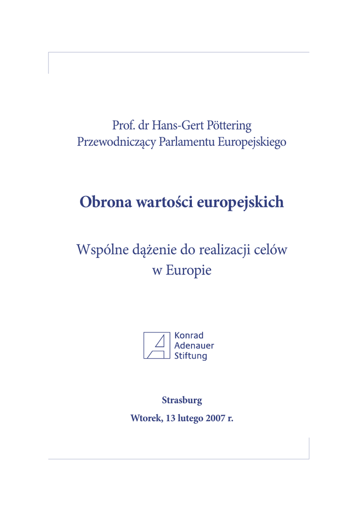 Prof. dr Hans-Gert Pöttering Przewodniczący Parlamentu Europejskiego Obrona wartości europejskich Wspólne dążenie do realizacji celów w Europie Strasburg Wtorek, 13 lutego 2007 r. Raporty Fundacji Konrada Adenauera Największym sukcesem jest przezwyciężenie podziału Europy. STRONA 2 Zmiana na stanowisku Przewodniczącego po dwóch i pół roku jest zgodna z tradycją Parlamentu Europejskiego istniejącą od pierwszych bezpośrednich wyborów w czerwcu 1979 r. W perspektywie historycznej dwa i pół roku to okres nader krótki. Jeżeli jednak weźmiemy pod uwagę fakt, iż Przewodniczący Parlamentu Europejskiego sprawuje swój urząd podczas trwania pięciu prezydencji Rady Europejskiej – obecnie prezydencji Niemiec, po których przewodnictwo obejmą kolejno Portugalia, Słowenia, Francja i Czechy – to wyraźnie uwidacznia się ogrom odpowiedzialności spoczywającej na naszym Parlamencie w czasie, w którym dzieło zjednoczenia Europy znajduje się w bardzo zaawansowanej fazie, ale nie zostało jeszcze dokończone, a nawet jest zagrożone z powodu tymczasowego niepowodzenia traktatu konstytucyjnego we Francji i w Holandii. Parlament Europejski zdaje sobie sprawę z tej odpowiedzialności i dlatego nikt nie może go prześcignąć w dążeniu do celu, jakim jest pełna jedność naszego kontynentu! (...) Od pierwszych wyborów do Parlamentu Europejskiego doświadczyliśmy wielu wzlotów i upadków polityki europejskiej. Raporty Fundacji Konrada Adenauera Największym sukcesem jest przezwyciężenie podziału Europy. Nasze wspólne wartości odniosły zwycięstwo. Członkostwo w Unii Europejskiej takich krajów jak Estonia, Łotwa, Litwa, Polska, Republika Czeska, Słowacja, Węgry, Słowenia oraz Malta i Cypr, które dołączyły 1 maja 2004 r., a także Bułgarii i Rumunii od 1 stycznia bieżącego roku i zjednoczonych Niemiec już od 3 października 1990 r. jest dla mnie cudem naszego pokolenia. Mamy wszelkie powody ku temu, aby również dziś cieszyć się tym z całego serca. Zadaniem dla wszystkich z nas wciąż pozostaje jednak uczenie się od siebie nawzajem oraz okazywanie sobie coraz większego szacunku i zrozumienia. Powinniśmy przestać mówić o „starych” i „nowych” państwach członkowskich. Wszyscy wspólnie stanowimy Parlament Europejski, a reprezentowane przez nas narody – wspólnotę Unii Europejskiej. W latach osiemdziesiątych mówiło się o „eurosklerozie”. Ale potem nastał rynek wewnętrzny i wspólna europejska waluta. Jako Parlament Europejski wywalczyliśmy sobie swoje prawa i wciąż będziemy to czynić. Nasz Parlament jest dzisiaj wpływową i świadomą swojej pozycji instytu- cją. Doświadczenie uczy nas więc, że osiągamy sukcesy z myślą o naszym kontynencie, jeżeli sami tego pragniemy, jeżeli mamy silną wolę i jesteśmy zdecydowani urzeczywistnić ideę jedności naszego kontynentu przy jednoczesnym zachowaniu jego różnorodności. O taką śmiałość chciałbym wszystkich Państwa prosić. Sukces odniesiemy jednak tylko wówczas, gdy obywatelki i obywatele Unii Europejskiej – oprócz więzi łączących ich ze stronami rodzinnymi i własnym krajem – poczują się Europejkami i Europejczykami oraz uświadomią sobie, co ich łączy. Świadomość przynależności do wspólnoty oraz poczucie solidarności stanowią konieczny warunek naszej wspólnej przyszłości. Zjednoczenie Europy nie jest więc jedynie nakazem rozumu. Zjednoczenie Europy leży nam również na sercu. Uzmysłowienie tego obywatelom to być może największe zadanie, któremu musimy razem podołać. Musimy służyć obywatelkom i obywatelom Unii Europejskiej. Europejczycy powinni być dumni z tego, co sobie wywalczyli na przestrzeni stuleci – z wartości, wolności, prawa i demokracji. Była to długa droga. Wiemy, że u naszych europejskich korzeni leży grecka filozofia, rzymskie prawo, judeochrześcijańska spuścizna, oświecenie, a więc nasza wspólna europejska kultura. Ale nie zapominajmy również o tragicznych wojnach domowych w Europie, a w XX w. – o totalitarnych ideologiach gardzących godnością człowieka oraz o odwadze ojców założycieli, którzy po 1945 r. wkroczyli na drogę przebaczenia i pojednania, aby budować nową, lepszą, pokojową i wspólną Europę. Powinniśmy o tym pamiętać również i dziś oraz na nowo odkrywać to wszystko, co nas łączy. Wielki Europejczyk rodem z Francji, Jacques Delors, nawiązując do tradycji zapoczątkowanej przez Roberta Schumana, mówił o „europejskiej duszy”. Wielki Europejczyk rodem z Polski, Władysław Bartoszewski, powiedział kiedyś: „Europa to przede wszystkim wolność jednostki i prawa człowieka – zarówno polityczne, jak i gospodarcze.” Obydwaj mają rację. 1. Obrona wartości europejskich Chciałbym powiedzieć kilka słów o wartościach europejskich. Zasadzają się one na fundamencie, jakim jest godność człowieka. Szanując ludzką godność, szanujemy drugiego człowieka, Sukces odniesiemy jednak tylko wówczas, gdy obywatelki i obywatele Unii Europejskiej poczują się Europejkami i Europejczykami. STRONA 3 Raporty Fundacji Konrada Adenauera składamy zobowiązanie wobec samych siebie i tworzymy w ten oto sposób porządek oparty na odpowiedzialności i solidarności. W naszej codziennej praktyce politycznej zawsze powinniśmy służyć godności człowieka i pragnę zachęcić nas wszystkich do tego, abyśmy bronili godności i praw człowieka na całym świecie. Nie jest to abstrakcyjny postulat. Nie jesteśmy mentorem świata, ale nasz obraz człowieka oraz nasze wartości staną się dla innych bardziej przekonujące, jeżeli uwiarygodnimy je naszym własnym życiem. Oznacza to bardzo konkretne konsekwencje dla naszej polityki. Pragnę zachęcić nas wszystkich do tego, abyśmy bronili godności i praw człowieka na całym świecie. STRONA 4 • Pragniemy partnerstwa ze zdolną do działania i demokratyczną Rosją. Dlatego też oczekujemy