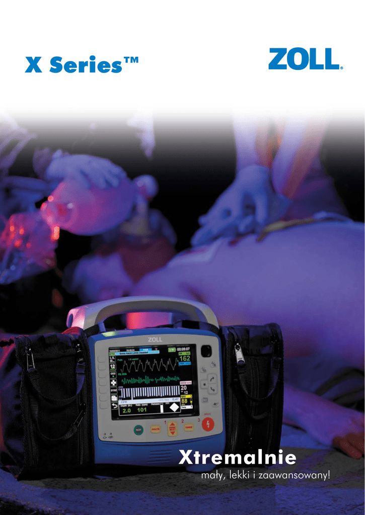 X Series™ Xtremalnie mały, lekki i zaawansowany! Niesamowite możliwości w tak małym urządzeniu! X Series nie jest podobny do innych monitorów/defibrylatorów. Można wręcz poczuć różnicę. X Series: mniejszy o 66% Mniej niż 6 kg wagi w pełni funkcjonalnego urządzenia, to połowa ciężaru dotychczas oferowanych na rynku aparatów, przy czym defibrylator posiada wszystko, czego potrzebuje lekarz i ratownik medyczny. Kompaktowy, bez kompromisu w wielkości ekranu, funkcjonalności i obsłudze. Bazując na platformie rozwijanej z myślą o wojskowych i lotniczych służbach medycznych, X Series wyznacza nowy standard wytrzymałości i trwałości, przy najbardziej rozwiniętych funkcjach. Łączy w sobie doskonałe terapeutyczne funkcje defibrylacji i stymulacji ZOLL® oraz zaawansowane możliwości monitorowania pacjenta. X Series jest także pierwszym defibrylatorem ze zintegrowanym modemem WiFi, stanowiącym jedną z trzech opcji komunikacji. Inną unikalną funkcją jest podział ekranu, umożliwiający jednoczesną obserwację krzywych EKG w czasie rzeczywistym obok uprzednio wykonanego 12-odprowadzeniowego zapisu EKG lub prezentację jednej z pięciu oddzielnych stron zapisu EKG z pamięci aparatu wraz z wynikami analizy i interpretacją słowną. Duży, jasny, kolorowy ekran LCD z 3 trybami wyświetlania zapewnia czytelną prezentację wszystkich monitorowanych parametrów. Tryb dużych cyfr jest tylko jedną z opcji do wyboru. Wszystko to bez konieczności wymiany baterii w trakcie akcji lub transportu, gdyż wydajne akumulatory litowo-jonowe SurePower™ II zapewniają co najmniej sześć godzin pracy – wystarczająco dla najbardziej skomplikowanej i długotrwałej akcji ratunkowej. ZOLL X Series inny defibrylator X Series: o 42% lżejszy ZOLL X Series inny defibrylator X Series: duży monitor – małe urządzenie ZOLL X Series inny defibrylator Xtremalnie wszechstronny Zaawansowana technologia, doskonała łączność Niezrównana wytrzymałość i wsparcie intensywnego nadzoru Pierwotne przeznaczenie aparatu do użytku w warunkach polowych i w ewakuacji lotniczej sprawiło, iż defibrylator X Series jest pierwszym urządzeniem spełniającym normę IP55 dotyczącą szczelności na wnikanie ciał stałych i cieczy. Jest także praktycznie odporny na działanie wysokiego ciśnienia wody (do 3 minut) oraz spełnia najbardziej restrykcyjne wymogi odporności na wstrząsy i wibracje. X Series może być dodatkowo wyposażony w 3 kanały inwazyjnego ciśnienia oraz 2 kanały temperatury, często przydatne w transporcie pacjentów wymagających intensywnego nadzoru. Skuteczna RKO X Series nie ma sobie równych, jeśli chodzi o pomoc w poprawie jakości RKO zarówno w czasie rzeczywistym, jak i poprzez analizę zapisanych w pamięci danych zwrotnych z prowadzonej resuscytacji. Oprogramowanie CPR Dashboard jest niezastąpione w osiągnięciu skuteczności RKO zgodnie z aktualnymi wytycznymi. Na ekranie urządzenia prezentowane są w postaci graficznej i numerycznej informacje dotyczące rzeczywistej głębokości i częstości uciśnięć klatki piersiowej oraz wskaźnik perfuzji, wskaźnik relaksacji i zegar czasu przerwy. Cyfrowy filtr See-Thru CPR umożliwia obserwację niezakłóconego przebiegu EKG w trakcie RKO i skrócenie przerw potrzebnych do oceny autogennego rytmu serca. Zarządzanie STEMI Szybkie i dokładne wykonanie 12-odprowadzeniowego badania EKG z interpretacją i transmisją danych umożliwia wczesną diagnostykę pacjentów z uniesieniem odcinka ST i maksymalne skrócenie czasu od wystąpienia STEMI do wdrożenia terapii reperfuzyjnej. Systemy telemedyczne RescueNet® 12-Lead oraz RescueNet Medgate zapewniają wsparcie analizy EKG i konsultacje medyczne ze strony współpracujących ośrodków klinicznych. Dokładne pomiary NIBP Dostępna wyłącznie w defibrylatorach ZOLL X Series unikalna technologia SureBP®* i Smartcuf™ uważana jest za złoty standard w pomiarach NIBP. Funkcja Sure BP zapewnia dokładny pomiar ciśnienia w czasie ok. 15 sekund, gdyż pomiar odbywa się w trakcie pompowania mankietu. Funkcja Smartcuf synchronizuje odczyt ciśnienia z załamkiem R elektrokardiogramu, poprawiając dokładność i wiarygodność pomiarów, szczególnie w przypadkach wysokiego poziomu artefaktów ruchowych i słabego tętna. Niezrównane możliwości gromadzenia danych i trendów X Series na nowo definiuje dane, które powinny być gromadzone w defibrylatorze, sposób w jaki mogą być przesyłane, prędkość z jaką mogą być przesyłane, a także dostęp do zapisanych danych w warunkach ratowniczych. To pierwszy defibrylator ze zintegrowanym modemem WiFi. W trakcie całej opieki nad pacjentem dane mogą być strumieniowo przesyłane do szpitali lub innych odległych lokalizacji. Dzięki funkcji zrzutów ekranowych (Snapshot) można z łatwością, za pomocą jednego przycisku na panelu aparatu, zapisać krzywe EKG i trendy życiowe (12 sekund przed zdarzeniem i 12 sekund po zdarzeniu). X Series umożliwia rejestrację w pamięci kombinacji do 32 zrzutów ekranowych, do 24 godzin danych z interwencji lub trendów z 1-minutowym interwałem oraz chronologiczny zapis do 1000 zdarzeń. Bez kompromisów X Series jest nowym, zaawansowanym technologicznie urządzeniem, zaprojektowanym w oparciu o uwagi ratowników medycznych z całego świata. * Technologia Welch Allyn dla Propaq® MD Idealny wyświetlacz dla ratownictwa medycznego X Series Defibrylator umożliwia wyświetlanie jednocześnie 4 wybranych krzywych oraz przeglądanie 12-odprowadzeniowego EKG. Ekran urządzenia pracuje w trzech trybach: kolorowym, wysoko kontrastowym czarno-białym oraz nocnym. Przeprowadzenie skutecznej resuscytacji możliwe jest dzięki unikatowej funkcji CPR Dashboard™. Wizualny wskaźnik alarmu Pulsoksymetria Masimo®rainbow®SET Nieinwazyjny pomiar ciśnienia Welch Allyn Sure BP® i SmartCuf® Kapnometria Oridion Microstream® Przyciski szybkiego dostępu Akumulator L