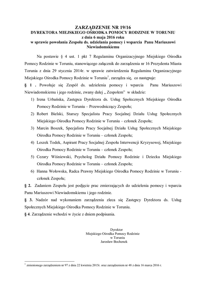 ZARZĄDZENIE NR 19/16 DYREKTORA MIEJSKIEGO OŚRODKA POMOCY RODZINIE W TORUNIU z dnia 6 maja 2016 roku w sprawie powołania Zespołu ds. udzielania pomocy i wsparcia Panu Mariuszowi Niewiadomskiemu Na postawie § 4 ust. 1 pkt 7 Regulaminu Organizacyjnego Miejskiego Ośrodka Pomocy Rodzinie w Toruniu, stanowiącego załącznik do zarządzenia nr 16 Prezydenta Miasta Torunia z dnia 29 stycznia 2014r. w sprawie zatwierdzenia Regulaminu Organizacyjnego Miejskiego Ośrodka Pomocy Rodzinie w Toruniu1, zarządza się, co następuje: § 1 . Powołuje się Zespół ds. udzielenia pomocy i wparcia Panu Mariuszowi Niewiadomskiemu i jego rodzinie, zwany dalej „ Zespołem” w składzie: 1) Irena Urbańska, Zastępca Dyrektora ds. Usług Społecznych Miejskiego Ośrodka Pomocy Rodzinie w Toruniu – Przewodniczący Zespołu; 2) Robert Bielski, Starszy Specjalista Pracy Socjalnej Działu Usług Społecznych Miejskiego Ośrodka Pomocy Rodzinie w Toruniu – członek Zespołu; 3) Marcin Boszek, Specjalista Pracy Socjalnej Działu Usług Społecznych Miejskiego Ośrodka Pomocy Rodzinie w Toruniu – członek Zespołu; 4) Leszek Todek, Aspirant Pracy Socjalnej Zespołu Interwencji Kryzysowej, Miejskiego Ośrodka Pomocy Rodzinie w Toruniu – członek Zespołu; 5) Cezary Wiśniewski, Psycholog Działu Pomocy Rodzinie i Dziecku Miejskiego Ośrodka Pomocy Rodzinie w Toruniu – członek Zespołu; 6) Hanna Wołowska, Radca Prawny Miejskiego Ośrodka Pomocy Rodzinie w Toruniu członek Zespołu; § 2. Zadaniem Zespołu jest podjęcie prac zmierzających do udzielenia pomocy i wparcia Panu Mariuszowi Niewiadomskiemu i jego rodzinie. § 3. Nadzór nad wykonaniem zarządzenia zleca się Zastępcy Dyrektora ds. Usług Społecznych Miejskiego Ośrodka Pomocy Rodzinie w Toruniu. § 4. Zarządzenie wchodzi w życie z dniem podpisania. Dyrektor Miejskiego Ośrodka Pomocy Rodzinie w Toruniu Jarosław Bochenek 1 zmienionego zarządzeniem nr 97 z dnia 22 kwietnia 2015r. oraz zarządzeniem nr 48 z dnia 16 marca 2016 r. Toruń 06.05.2016 r. Otrzymują: Irena Urbańska, Zastępca Dyrektora ds. Usług Społecznych Miejskiego Ośrodka Pomocy Rodzinie w Toruniu – Przewodniczący Zespołu; Robert Bielski, Starszy Specjalista Pracy Socjalnej Działu Usług Społecznych Miejskiego Ośrodka Pomocy Rodzinie w Toruniu – członek Zespołu; Marcin Boszek, Specjalista Pracy Socjalnej Działu Usług Społecznych Miejskiego Ośrodka Pomocy Rodzinie w Toruniu – członek Zespołu; Leszek Todek, Aspirant Pracy Socjalnej , Miejskiego Ośrodka Pomocy Rodzinie w Toruniu – członek Zespołu; Cezary Wiśniewski, Psycholog Działu Pomocy Rodzinie i Dziecku Miejskiego Ośrodka Pomocy Rodzinie w Toruniu – członek Zespołu; Hanna Wołowska, Radca Prawny Miejskiego Ośrodka Pomocy Rodzinie w Toruniu – członek Zespołu;