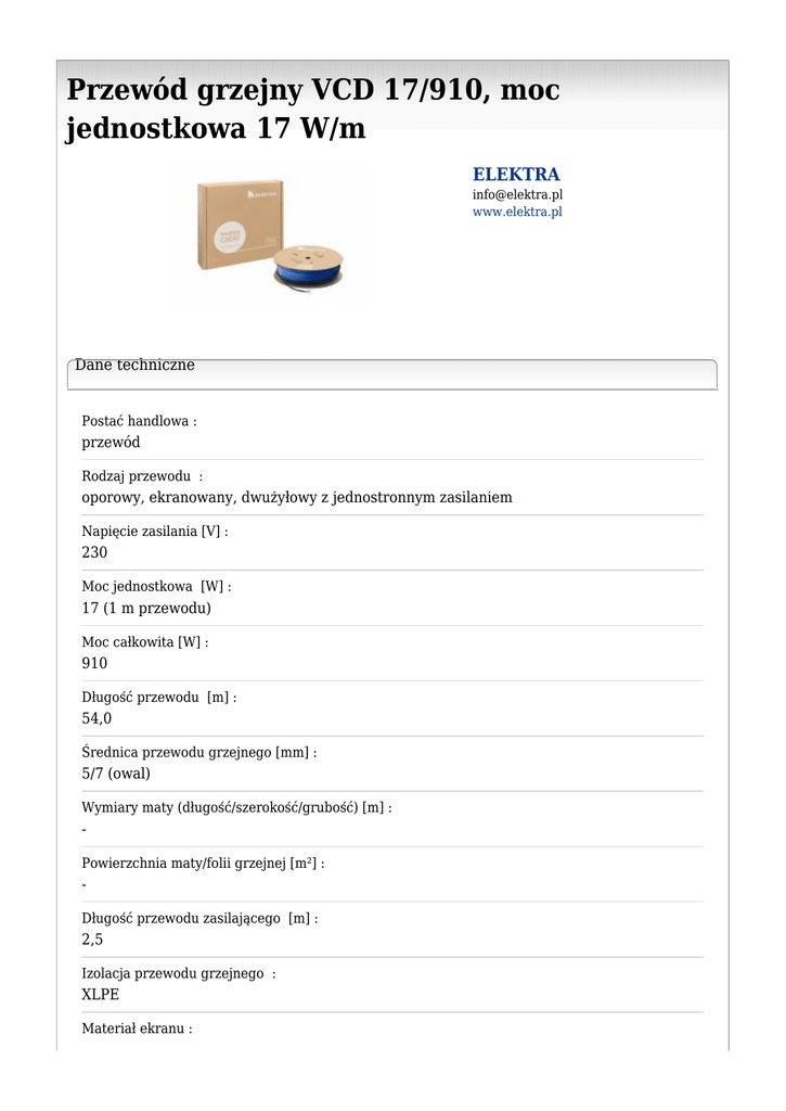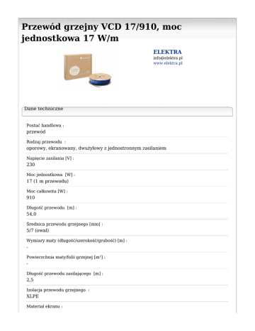 Przewód grzejny VCD 17/910, moc jednostkowa 17 W/m ELEKTRA [email protected] www.elektra.pl Dane techniczne Postać handlowa : przewód Rodzaj przewodu : oporowy, ekranowany, dwużyłowy z jednostronnym zasilaniem Napięcie zasilania [V] : 230 Moc jednostkowa [W] : 17 (1 m przewodu) Moc całkowita [W] : 910 Długość przewodu [m] : 54,0 Średnica przewodu grzejnego [mm] : 5/7 (owal) Wymiary maty (długość/szerokość/grubość) [m] : Powierzchnia maty/folii grzejnej [m²] : Długość przewodu zasilającego [m] : 2,5 Izolacja przewodu grzejnego : XLPE Materiał ekranu : miedź ocynowana Materiał powłoki zewnętrznej przewodu : PVC ciepłoodporny Maks. temperatura robocza [°C] : +95 Min. temperatura montażu [°C] : -5 Tolerancja mocy znamionowej [%] : +5, -10 Min. promień gięcia [cm] : 3,5 x Ø Sposób montażu : za pomocą taśmy montażowej ELEKTRA TME, TMS, siatki montażowej, kleju termicznego w wylewce betonowej Sterowanie : regulatory OCD4 1999, OCC2 1991, OTN 1991, OTD2 19991, ETV 19991 Stopień ochrony : IPX7 Gwarancja : 20 lat Normy, atesty, certyfikaty : Znak CE, Certyfikat B, Certyfikaty wg ISO 9001: IQNET, PCBC, PN-EN 60335-1, GOST-R Opis : Przewód grzejny VCD to przewód stosowany do ogrzewania podstawowego lub dodatkowego pomieszczeń i rurociągów lub jako zabezpieczenie przed oblodzeniem tarasów, dachów, rynien, rur spustowych, chodników oraz podjazdów.