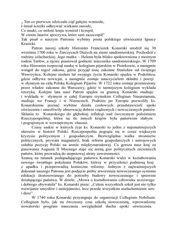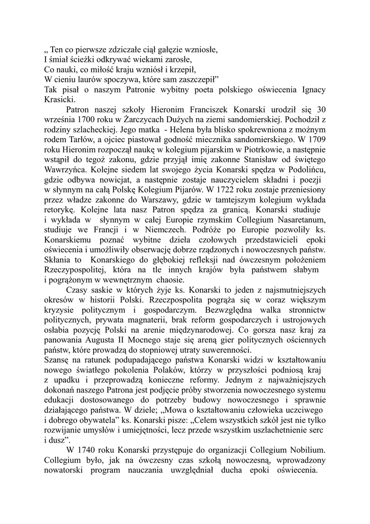 „ Ten co pierwsze zdziczałe ciął gałęzie wzniosłe, I śmiał ścieżki odkrywać wiekami zarosłe, Co nauki, co miłość kraju wzniósł i krzepił, W cieniu laurów spoczywa, które sam zaszczepił” Tak pisał o naszym Patronie wybitny poeta polskiego oświecenia Ignacy Krasicki. Patron naszej szkoły Hieronim Franciszek Konarski urodził się 30 września 1700 roku w Żarczycach Dużych na ziemi sandomierskiej. Pochodził z rodziny szlacheckiej. Jego matka - Helena była blisko spokrewniona z możnym rodem Tarłów, a ojciec piastował godność miecznika sandomierskiego. W 1709 roku Hieronim rozpoczął naukę w kolegium pijarskim w Piotrkowie, a następnie wstąpił do tegoż zakonu, gdzie przyjął imię zakonne Stanisław od świętego Wawrzyńca. Kolejne siedem lat swojego życia Konarski spędza w Podolińcu, gdzie odbywa nowicjat, a następnie zostaje nauczycielem składni i poezji w słynnym na całą Polskę Kolegium Pijarów. W 1722 roku zostaje przeniesiony przez władze zakonne do Warszawy, gdzie w tamtejszym kolegium wykłada retorykę. Kolejne lata nasz Patron spędza za granicą. Konarski studiuje i wykłada w słynnym w całej Europie rzymskim Collegium Nasaretanum, studiuje we Francji i w Niemczech. Podróże po Europie pozwoliły ks. Konarskiemu poznać wybitne dzieła czołowych przedstawicieli epoki oświecenia i umożliwiły obserwację dobrze rządzonych i nowoczesnych państw. Skłania to Konarskiego do głębokiej refleksji nad ówczesnym położeniem Rzeczypospolitej, która na tle innych krajów była państwem słabym i pogrążonym w wewnętrznym chaosie. Czasy saskie w których żyje ks. Konarski to jeden z najsmutniejszych okresów w historii Polski. Rzeczpospolita pogrąża się w coraz większym kryzysie politycznym i gospodarczym. Bezwzględna walka stronnictw politycznych, prywata magnaterii, brak reform gospodarczych i ustrojowych osłabia pozycję Polski na arenie międzynarodowej. Co gorsza nasz kraj za panowania Augusta II Mocnego staje się areną gier politycznych ościennych państw, które prowadzą do stopniowej utraty suwerenności. Szansę na ratunek podupadającego państwa Konarski widzi w kształtowaniu nowego światłego pokolenia Polaków, którzy w przyszłości podniosą kraj z upadku i przeprowadzą konieczne reformy. Jednym z najważniejszych dokonań naszego Patrona jest podjęcie próby stworzenia nowoczesnego systemu edukacji dostosowanego do potrzeby budowy nowoczesnego i sprawnie działającego państwa. W dziele; „Mowa o kształtowaniu człowieka uczciwego i dobrego obywatela” ks. Konarski pisze: „Celem wszystkich szkół jest nie tylko rozwijanie umysłów i umiejętności, lecz przede wszystkim uszlachetnienie serc i dusz”. W 1740 roku Konarski przystępuje do organizacji Collegium Nobilium. Collegium było, jak na ówczesny czas szkołą nowoczesną, wprowadzony nowatorski program nauczania uwzględniał ducha epoki oświecenia. W Collegium szczególny nacisk kładziono na wiedzę praktyczną, nauczano języka ojczystego i historii. Podniesiono poziom nauczania przedmiotów przyrodniczych, wprowadzono nauczanie matematyki i fizyki. Nauka miała służyć nie tylko zgłębianiu wiedzy ale też kształtowaniu postaw obywatelskich i patriotycznych. Wprowadzono również nowe metody nauczania mobilizujące uczniów do samodzielnego myślenia i aktywnej pracy poprzez teatr szkolny i sejmiki szkolne. Szczególnie sejmiki, czyli debaty uczniowskie pozwalały poruszać polityczne i społeczne problemy kraju, przygotowywały młodzież do wystąpień w życiu publicznym, kształcąc retorykę i zdolności oratorskie. W Collegium właściwie wyeliminowano też stosowanie kar cielesnych. Założenie Collegium Nobilium w Warszawie stało się bodźcem do formowania podobnych szkół w Wilnie, Poznaniu, Witebsku i innych miastach. Postulaty reformy szkolnictwa znalazły swoją kontynuację w postaci utworzonej w 1773 roku Komisji Edukacji Narodowej. Stanisław Konarski był nie tylko organizatorem szkoły ale też autorem nowoczesnych podręczników: „O poprawie wad wymowy” i „ O sztuce dobrego myślenia” Profesor Julian Dłużewski w biografii ks. Konarskiego pisze: „Dzięki Konarskiemu szkolnictwo polskie zaczęło przetwarzać Sarmatę epoki saskiej na człowieka nowego, dostosowanego do europejskich potrzeb życiowych. To nowe pokolenie dokona dzieła Sejmu Czteroletniego i uratuje od zguby naród, chociaż na ratunek państwa było już za późno”. Działalność na rzecz reformy systemu edukacji to jedynie część dorobku ks. Konarskiego. Z niemniejszym zapałem nasz Patron pracuje na rzecz naprawy ustrojowej Polski. Księdzu Konarskiemu przyszło żyć w czasach dla Polski bardzo trudnych. Rzeczpospolita stała na krawędzi wojny domowej. Kończące się panowanie Augusta II skłoniło przeciwników króla skupionych wokół Stanisława Leszczyńskiego do większej aktywności. Nie próżnowali także sąsiedzi Polski: Rosja, Prusy i Austria. W 1732 roku podpisali tzw. traktat trzech czarnych orłów, w którym zobowiązali się nie dopuścić do elekcji zarówno Sasa jak i Leszczyńskiego. Kiedy jednak po śmierci Augusta II pozycja Leszczyńskiego stała się zbyt silna, nastąpiła interwencja wojsk saskich i rosyjskich, co ostatecznie zakończyło się wstąpieniem na tron Augusta III Sasa. Stanisław Konarski był głęboko przejęty dramatyczną sytuacją Rzeczpospolitej i w trakcie walki o tron opowiedział się po stronie Stanisława Leszczyńskiego. Widział w nim człowieka światłego, ostro krytykującego propagowaną przez Sarmatów polską rzeczywistość społeczno-polityczną, domagającego się daleko idących reform ustrojowych. Wielkie wrażenie na Konarskim zrobiło dzieło Leszczyńskiego „Głos wolny wolność ubezpieczający”. W duchu reform i potrzeby gruntownej naprawy państwa Konarski w latach 1760- 1763 pisze pomnikowe dzieło „O skutecznym rad sposobie”. W tym 