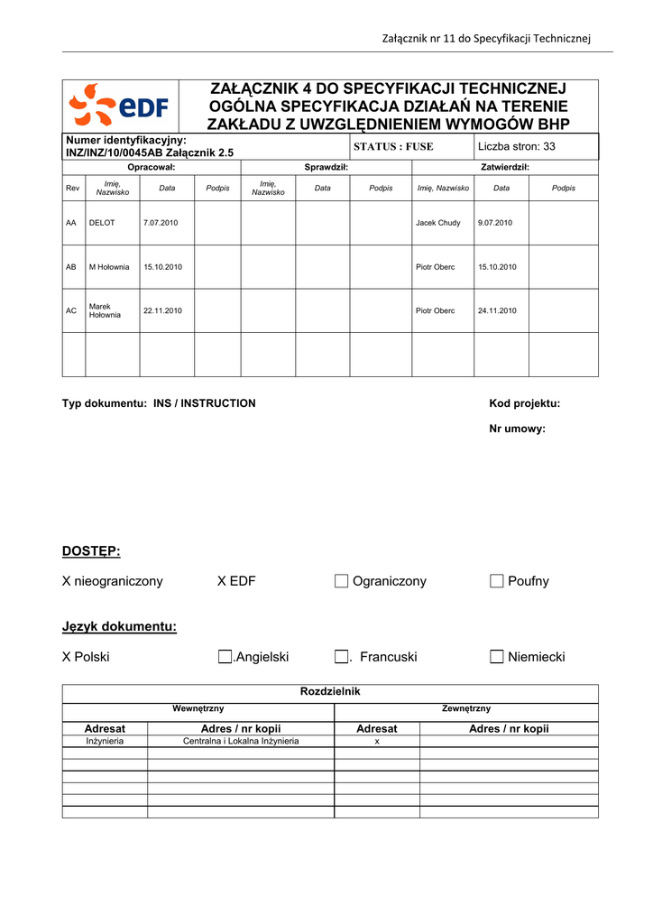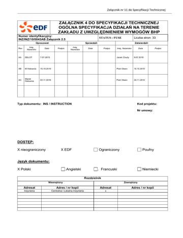 Załącznik nr 11 do Specyfikacji Technicznej ZAŁĄCZNIK 4 DO SPECYFIKACJI TECHNICZNEJ OGÓLNA SPECYFIKACJA DZIAŁAŃ NA TERENIE ZAKŁADU Z UWZGLĘDNIENIEM WYMOGÓW BHP Numer identyfikacyjny: INZ/INZ/10/0045AB Załącznik 2.5 Opracował: Rev Imię, Nazwisko Data Liczba stron: 33 STATUS : FUSE Sprawdził: Podpis Imię, Nazwisko Zatwierdził: Data Podpis Imię, Nazwisko Data AA DELOT 7.07.2010 Jacek Chudy 9.07.2010 AB M Hołownia 15.10.2010 Piotr Oberc 15.10.2010 AC Marek Hołownia 22.11.2010 Piotr Oberc 24.11.2010 Typ dokumentu: INS / INSTRUCTION Podpis Kod projektu: Nr umowy: DOSTĘP: X nieograniczony X EDF Ograniczony Poufny . Francuski Niemiecki Język dokumentu: X Polski .Angielski Rozdzielnik Wewnętrzny Zewnętrzny Adresat Adres / nr kopii Adresat Inżynieria Centralna i Lokalna Inżynieria x Adres / nr kopii Załącznik nr 11 do Specyfikacji Technicznej I. DOSTĘP DO DOKUMENTU Miejsce przechowywania oryginału: Centrum Usług Wspólnych EDF Polska / Inżynieria / Ścieżka dostępu do wersji elektronicznej: II. REJESTR I ZMIAN Numer zmienionej strony Revision Data zmiany AA 7/07/2010 _________ Utworzenie AB 15/10/2010 --------------- Wprowadzono nowe punkty 2 i 3 Całkowicie przeredagowano tekst pozostałych punktów AC 22.11.2010 --------------- Przeredagowano i zaktualizowano zgodnie z obowiązującymi przepisami prawa zapisy punktu 9 Załącznik otrzymał nową numerację (poprzedni numer 2.6) i zastąpił stary załącznik 2.5 Plan BHP. W nowym załączniku 2.5 zostały zawarte wszystkie wytyczne z Planu BHP Opis zmian Załącznik nr 11 do Specyfikacji Technicznej Spis treści 1 WPROWADZENIE............................................................................................................................................... 4 2 ZASADY OGÓLNE .............................................................................................................................................. 4 3 ZASADY DOTYCZĄCE PRZESTRZEGANIA PRZEPISÓW BHP PRZEZ WYKONAWCÓW REALIZUJĄCYCH PRACE NA TERENIE SPÓŁKI ...................................................................................... 5 4 ZAKRES DZIAŁAŃ ............................................................................................................................................. 6 5 WZORCOWA ORGANIZACJA PLACU BUDOWY ..................................................................................... 10 6 ANALIZYKA RYZYKA W ZAKRESIE TERMINU / HARMONOGRAMU / POSTĘPU PRAC ............ 14 7 BEZPIECZEŃSTWO ......................................................................................................................................... 15 8 ZATRUDNIANIE PRACOWNIKÓW I/LUB FIRMY ZAGRANICZNEJ ................................................... 19 9 ŚRODOWISKO ................................................................................................................................................... 20 10 PODWYKONAWSTWO W ZAKRESIE MONTAŻU NA MIEJSCU REALIZACJI PROJEKTU .......... 23 11 PLAN JAKOŚCI REALIZACJI ........................................................................................................................ 23 12 NADZÓR KLIENTA .......................................................................................................................................... 24 13 ELEMENTY, JAKIE POWINNY ZNALEŹĆ SIĘ W ODPOWIEDZI NA OFERTĘ PRZETARGOWĄ 24 Załącznik nr 11 do Specyfikacji Technicznej 1 WPROWADZENIE Niniejszy Załącznik do Ogólnej Specyfikacji Technicznej określa zakresy odpowiedzialności jak również 1 oczekiwany sposób zachowania związany z działalnością „na terenie Spółki”, które to zasady Wykonawcy lub ich Podwykonawcy będą musieli wdrożyć i stosować w wypadku podpisania umowy ze Spółkami Grupy EdF Polska. Niniejszy Załącznik do Ogólnej Specyfikacji Technicznej ma zastosowanie dla wszystkich projektów realizowanych w Spółkach Grupy EdF Polska i prowadzonych przez Inżynierię EdF Polska. Niniejszy Załącznik do Ogólnej Specyfikacji Technicznej może zostać uzupełniony o inne specyficzne wymagania wykazane w dokumentacji przetargowej oraz dodane do technicznej części kontraktu. Niniejszy Załącznik do Ogólnej Specyfikacji Technicznej oraz ewentualne uzupełnienia będą wykorzystywane przez Wykonawcę i jego Podwykonawców. Wykonawca będzie w szczególności odpowiadać, za przekazanie zawartych w tych specyfikacjach wymagań dla swoich Podwykonawców zaangażowanych w realizację projektu. W Załączniku 3 przedstawiono wykaz dokumentów, jakie winien złożyć Wykonawca. 2 ZASADY OGÓLNE 1. Na terenie Spółki obowiązuje stosowanie przepisów prawa oraz wewnętrznych aktów normatywnych, w tym procedur i instrukcji dotyczących jakości, bezpieczeństwa i higieny pracy, bezpieczeństwa przeciwpożarowego, ochrony środowiska, ruchu osobowego i materiałowego oraz ochrony zakładu. 2. Spółka zapewnia wszystkim Wykonawcom działającym lub mającym siedzibę na jej terenie dostęp do wymagań prawnych, niezbędnych do organizowania i prowadzenia prac w sposób zgodny z przepisami bezpieczeństwa i higieny pracy, bezpieczeństwa przeciwpożarowego, ochrony środowiska, ruchu osobowego i materiałowego oraz ochrony zakładu. 3. Wykonawcy działający lub mający siedzibę na terenie Spółki są zobowiązani organizować, przygotowywać oraz prowadzić prace w sposób zapobiegający: wypadkom, chorobom zawodowym, powstawaniu zagrożenia pożarowego oraz degradacji środowiska. 4. Pracownicy Wykonawców działających lub mających siedzibę na terenie Spółki są zobowiązani do stosowania zasad bezpieczeństwa i higieny pracy, bezpieczeństwa przeciwpożarowego, ochrony środowiska oraz przestrzegania obowiązujących przepisów ruchu osobowego i materiałowego oraz ochrony zakładu. 5. Każdy pracownik (łącznie z kierownictwem) Wykonawcy prowadzącego prace dla Spółki musi być przeszkolony w zakresie obowiązujących w Sp