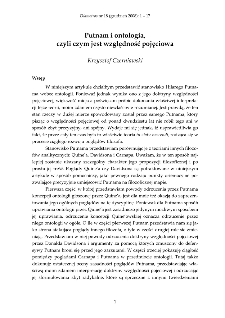 Diametros nr 18 (grudzień 2008): 1 – 17 Putnam i ontologia, czyli czym jest względność pojęciowa Krzysztof Czerniawski Wstęp W niniejszym artykule chciałbym przedstawić stanowisko Hilarego Putnama wobec ontologii. PoniewaŜ jednak wynika ono z jego doktryny względności pojęciowej, większość miejsca poświęcam próbie dokonania właściwej interpretacji tejŜe teorii, moim zdaniem często niewłaściwie rozumianej. Jest prawdą, Ŝe ten stan rzeczy w duŜej mierze spowodowany został przez samego Putnama, który pisząc o względności pojęciowej od ponad dwudziestu lat nie robił tego ani w sposób zbyt precyzyjny, ani spójny. Wydaje mi się jednak, iŜ usprawiedliwia go fakt, Ŝe przez cały ten czas była to właściwie teoria in statu nascendi, rodząca się w procesie ciągłego rozwoju poglądów filozofa. Stanowisko Putnama przedstawiam porównując je z teoriami innych filozofów analitycznych: Quine’a, Davidsona i Carnapa. UwaŜam, Ŝe w ten sposób najlepiej zostanie ukazany szczególny charakter jego propozycji filozoficznej i po prostu jej treść. Poglądy Quine’a czy Davidsona są potraktowane w niniejszym artykule w sposób pomocniczy, jako pewnego rodzaju punkty orientacyjne pozwalające precyzyjnie umiejscowić Putnama na filozoficznej mapie. Pierwsza część, w której przedstawiam powody odrzucenia przez Putnama koncepcji ontologii głoszonej przez Quine’a, jest dla mnie teŜ okazją do zaprezentowania jego ogólnych poglądów na tę dyscyplinę. PoniewaŜ dla Putnama sposób uprawiania ontologii przez Quine’a jest zasadniczo jedynym moŜliwym sposobem jej uprawiania, odrzucenie koncepcji Quine’owskiej oznacza odrzucenie przez niego ontologii w ogóle. O ile w części pierwszej Putnam przedstawia nam się jako strona atakująca poglądy innego filozofa, o tyle w części drugiej role się zmieniają. Przedstawiam w niej powody odrzucenia doktryny względności pojęciowej przez Donalda Davidsona i argumenty za pomocą których zmuszony do defensywy Putnam broni się przed jego zarzutami. W części trzeciej pokazuję ciągłość pomiędzy poglądami Carnapa i Putnama w przedmiocie ontologii. Tutaj takŜe dokonuję ostatecznej oceny zasadności poglądów Putnama, przedstawiając właściwą moim zdaniem interpretację doktryny względności pojęciowej i odrzucając jej sformułowania zbyt radykalne, które są sprzeczne z innymi twierdzeniami 1 Krzysztof Czerniawski Putnam i ontologia, czyli czym jest względność pojęciowa Putnama, i do których stosują się przynajmniej niektóre z zarzutów Davidsona przeciwko tej teorii. Putnam i Quine Zdaniem Putnama nawrót szacunku do ontologii po artykule Quine’a O tym co istnieje „miał i ma katastrofalne konsekwencje dla niemal kaŜdej części filozofii analitycznej”1. Przede wszystkim bowiem fałszywe jest stojące u podstaw ontologii załoŜenie, Ŝe istnieje jakiś jeden właściwy, dosłowny i rzeczywisty sens słów takich jak „istnieć”, „indywiduum”, „obiekt”2, oraz związane z nim przekonanie, Ŝe „świat wyznacza jedyny «prawdziwy» sposób podzielenia świata na obiekty, sytuacje, własności etc.”3. Putnam przeciwstawia temu załoŜeniu argument z względności pojęciowej, posługując się przykładem róŜnicy w opisie świata złoŜonego z trzech obiektów x1, x2, x3 na gruncie semantyki Carnapa i z siedmiu obiektów według opisu na gruncie mereologii Leśniewskiego, według której dla dowolnych dwóch konkretów istnieje przedmiot będący ich sumą4. Putnam zgadza się ze swoimi krytykami, Ŝe nie moŜna mówić, iŜ Carnap i Leśniewski nie zgadzają się ze sobą co do istnienia pewnych przedmiotów, poniewaŜ faktem jest, Ŝe mówią oni po prostu językami, gdzie słowo „przedmiot” ma róŜny sens5. ZauwaŜa jednak, Ŝe z tego wynika, iŜ nie moŜna traktować powaŜnie, jak tego chcą ci krytycy, pytania, czy np. sumy mereologiczne rzeczywiście istnieją. Nie jest wcale tak, Ŝe Carnap odrzucił istnienie sum mereologicznych, a Leśniewski je przyjął. Nie ma bowiem Ŝadnego „rzeczywistego” istnienia, Ŝadnego właściwego, jedynego sensu słowa „istnieć”, „przedmiot” czy „substancja”, poza wybranym układem pojęciowym, zaproponowanym przez Carnapa, Leśniewskiego czy innym. Carnap i Leśniewski dokonali więc jedynie wyboru pewnego szczególnego sposobu mówienia, a nie ontologii, a kwestia istnienia sum mereologicznych to kwestia czysto konwencjonalna, a nie faktualna6. Czy jednak Quine nie dowiódł, Ŝe nie istnieją kwestie czysto konwencjonalne? Putnam twierdzi, Ŝe Quine trafnie zauwaŜył, Ŝe nie ma gwarancji, iŜ cokolwiek, co nazywamy konwencją, w pewnym momencie nie będzie musiało być przez nas porzucone, z powodów których obecnie nie jesteśmy w stanie przewi1 Putnam [2004] s. 2. 2 Ibid., s. 2, 47, 84 – 85. 3 Ibid., s. 51. 4 Ibid., s. 38 – 40; Putnam [1998b] s. 343 – 346 i 359 – 363; Putnam [1990] s. 96 – 97. 5 Putnam [2004] s. 39 – 40. 6 Ibid., s. 41 – 43. 2 Krzysztof Czerniawski Putnam i ontologia, czyli czym jest względność pojęciowa dzieć. Ale nie postuluje on przecieŜ jakichś wiecznych konwencji. Zdaniem Putnama istnieje pewien sens słowa „konwencja”, wskazany przez Dawida Lewisa, według którego konwencja jest po prostu rozwiązaniem dla pewnego rodzaju problemu koordynacyjnego, i o taką właśnie konwencję mu chodzi. Tak więc kwestia wyboru aksjomatów mereologii bądź ich odrzucenia jest czymś podobnym do kwestii decyzji, czy w Anglii powinniśmy się umówić co do jeŜdŜenia lewą czy prawą stroną jezdni, i nie ma nic wspólnego z metafizyką „analityczności”, „aprioryczności” czy „niekorygowalności”7. Ponadto Quine’owska metafora nici, które nie są ani całkiem czarne, ani całkiem białe, poniewaŜ Ŝadne zdanie nie jest prawdziwe ani całkowicie na mocy konwencji, ani na mocy doświadczenia, sugeruje, Ŝe powinniśmy być zdolni do odr