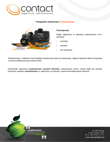 Fotografia reklamowa / Fotoreportaż Fotoreportaż Sesja zdjęciowa w plenerze wykonywana m.in. podczas: – eventów, – szkoleń, – dni otwartych. Każdorazowo, materiał przed obróbką dostarczany jest do autoryzacji, zdjęcia wybrane Klient otrzymuje w formie elektronicznej (nośnik DVD). Wychodząc naprzeciw oczekiwaniom naszych Klientów, każdorazowo formę, rodzaj zdjęć jak również kosztorys ustalamy indywidualnie, w zależności od potrzeb i stopnia skomplikowania zlecenia.