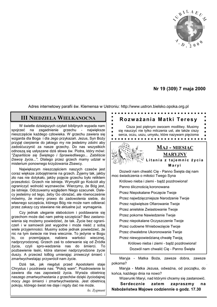 NR 19 (309)/1 7 maja 2000 r. PO GÓRACH, DOLINACH... Nr 19 (309) 7 maja 2000 Adres internetowy parafii św. Klemensa w Ustroniu: http://www.ustron.bielsko.opoka.org.pl III NIEDZIELA WIELKANOCNA W świetle dzisiejszych czytań biblijnych wypada nam spojrzeć na zagadnienie grzechu - największe nieszczęście kaŜdego człowieka. W grzechu zawiera się wzgarda dla Boga i dla Jego przykazań. Jezus, Syn BoŜy przyjął cierpienie do jakiego my nie jesteśmy zdolni aby zadośćuczynić za nasze grzechy. Do nas wszystkich odnoszą się usłyszane dziś słowa św. Piotra, który mówi: "Zaparliście się Świętego i Sprawiedliwego... Zabiliście Dawcę Ŝycia...". Dlatego przez grzech mamy udział w misterium ponownego krzyŜowania Zbawcy. Największym nieszczęściem naszych czasów jest coraz większe zobojętnienie na grzech. śyjemy tak, jakby zło nas nie dotykało, jakby pojęcie grzechu było reliktem przeszłości. Grzech nie istnieje. Wymyślił go Kościół aby ograniczyć wolność wyznawców. Wierzymy, Ŝe Bóg jest, Ŝe istnieje. Odczuwamy względem Niego szacunek. Dalecy jesteśmy od tego, Ŝeby Go obraŜać, ale równocześnie mówimy, Ŝe mamy prawo do zadowolenia siebie, do własnego szczęścia, którego Bóg nie moŜe nam odbierać przez zakazy czy stawiane nie aktualne juŜ wymagania. Czy jednak uleganie słabościom i poddawanie się grzechom moŜe dać nam pełnię szczęścia? Bez zastanowienia się moŜemy powiedzieć, Ŝe tak. śycie bez ograniczeń i w samowoli jest wygodne i moŜe nieść z sobą wiele przyjemności. Musimy sobie jednak powiedzieć, Ŝe nic na tym świecie nie trwa wiecznie. To jedynie w Bogu to, co przemijające, nabiera wartości wiecznej, nadprzyrodzonej. Grzech zaś to oderwanie się od Źródła Ŝycia, czyli spro-wadzenia nas do śmierci. To pozbawienie łaski, która stanowi nadprzyrodzone Ŝycie duszy. A przecieŜ toBóg umierając zniweczył śmierć i zmartwychwstając przywrócił nam Ŝycie. Dziś tak, jak niegdyś przed Apostołami staje Chrystus i pozdrawia nas: "Pokój wam". Pozdrowienie to zawiera dla nas zapowiedź Ŝycia. WyraŜa obietnicę naszego zmartwychwstania z grzechów dzięki Ŝyciodajnej mocy Jego śmierci i zmartwychwstania. Jest obietnicą pokoju, którego świat nie daje i nigdy dać nie moŜe. ks. Zygmunt RozwaŜania Matki Teresy Cisza jest pięknym owocem modlitwy. Musimy się nauczyć nie tylko milczenia ust, ale takŜe ciszy serca, oczu, uszu, umysłu, które nazywam pięcioma MAJ - MIESIĄC MARYJNY Litania z tajemnic Ŝycia Maryi Dozwól nam chwalić Cię - Panno Święta daj nam moc świadczenia o miłości Twego Syna Królowo nieba i ziemi - bądź pozdrowiona! Panno ślicznością koronowana Przez Niepokalane Poczęcie Twoje Przez najwdzięczniejsze Narodzenie Twoje Przez najświętsze Ofiarowanie Twoje Przez anielskie Zwiastowanie Twoje Przez pokorne Nawiedzenie Twoje Przez niepokalane Oczyszczenie Twoje Przez cudowne Wniebowzięcie Twoje Przez chwalebne Ukoronowanie Twoje Przez niewypowiedzianą chwałę Twoją Królowo nieba i ziemi - bądź pozdrowiona! Dozwól nam chwalić Cię - Panno Święta Maryja - Matka BoŜa, zawsze dobra, zawsze pokorna? Maryja - Matka Jezusa, odwaŜna, od początku, do końca, kaŜdego dnia na nowo? Wizerunki Maryi, nad którymi chcemy się zastanowić. Ser decznie zatem zapraszm y na NaboŜeństwa Majowe codziennie o godz. 17.30 NR 19 (309)/2 7 maja 2000 r. PO GÓRACH, DOLINACH... W DUCHU ŚPIJCIE MĘśNI - KATYŃ Kozielsk, Ostaszków, Starobielsk. Te trzy złowieszcze słowa dnia 3 kwietnia 1940 r. zwieńczyło jedno - KATYŃ. Miejsce jednej z największych zbrodni minionej wojny światowej. Ofiary mordu katyńskiego - dziesięć tysięcy bezbronnych jeńców, strzelani w tył głowy przez swoich katów na krawędzi grobów, wielu ze spętanymi rękami na plecach, to nasi rodacy, ojcowie rodzin, męŜowie, bracia, synowie w polskich mundurach. ROK ŚWIĘTY W HISTORII 1983: Jubileusz Odkupienia przygotowuje do Roku Świętego 2000. “Otwórzcie drzwi Odkupicielowi” - tymi słowami Ojciec Święty Jan Paweł II rozpoczyna bullę inaugurującą Jubileusz Odkupienia z dniem 6 stycznia 1983 r. Okazję do ogłoszenia tego nadzwyczajnego Roku Świętego stanowiła 1950 rocznica śmierci Jezusa. PapieŜ postanowił k o n t yn u o w a ć obchody J u b i l e us zy nadzwyczajnych. Był on równieŜ obchodzony w perspektywie Jubileuszu Roku 2000 i końca drugiego milenium. Ten nadzwyczajny Jubileusz miał za zadanie “kontynuować godne przygotowanie do Roku Świętego 2000”. Matka Boska Katyńska Bolejesz i Twoje córy brzózki ronią łzy liści po mrokach dołów katyńskich w których zapadła się pamięć człowieka nakryta czerwoną róŜą piasku Jedyny niekłamany świadku skrytobójczego strzału w tył głowy kolczastej golgoty rąk bezimiennego słowa ostatniego Daj choć krzyŜ brzozowy wieczną pamięć nakaŜ przywróć im ludzkość na wieczność przypisaną. Tadeusz Michalski tak woła: Matko Boleściwa! Tyś tuliła do serca swego udręczonego Syna. A przecieŜ mógł oddalić kielich goryczy. Matko Boska Katyńska! W swym Wizerunku tulisz postrzeloną głowę Ŝołnierza polskiego. Weź pod swój płaszcz wszystkich: kapelanów, szeregowych, oficerów, generałów, lekarzy, profesorów, inŜynierów - sam Kwiat Najjaśniejszej Rzeczypospolitej, którzy na czas narodowej potrzeby wdziali mundury z polskimi orłami, by po nierównej walce znaleźć się w obozach jenieckich. Oni teŜ mogli się uratować. Wystarczyło zaprzeć się Polski. Zaprzeć się Twego Syna lub podeptać KrzyŜ Pański. Wierni Bogu, Ojczyźnie i Ŝołnierskiemu honorowi zostali umęczeni. Katyń - któŜ z Polaków nie zna tragizmu tego słowa; budzi grozę, Ŝal, poczucie ogromnej krzywdy. Katyń to krwawiąca rana w polskiej świadomości narodowej, a jednocześnie wyrzut sumienia opinii światowej. W NASZYM STULECIU WRÓCILI MĘCZENNICY. A SĄ TO CZĘSTO MĘCZENNICY NIEZNANI, JAK GDYBY 