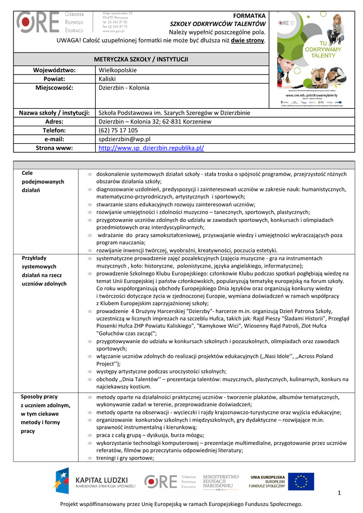 FORMATKA SZKOŁY ODKRYWCÓW TALENTÓW Należy wypełnić poszczególne pola. UWAGA! Całość uzupełnionej formatki nie może być dłuższa niż dwie strony. METRYCZKA SZKOŁY / INSTYTUCJI Wielkopolskie Kaliski Dzierzbin - Kolonia Województwo: Powiat: Miejscowość: Nazwa szkoły / instytucji: Adres: Telefon: e-mail: Strona www: Cele podejmowanych działań Przykłady systemowych działań na rzecz uczniów zdolnych Sposoby pracy z uczniem zdolnym, w tym ciekawe metody i formy pracy Szkoła Podstawowa im. Szarych Szeregów w Dzierzbinie Dzierzbin – Kolonia 32; 62-831 Korzeniew (62) 75 17 105 [email protected] http://www.sp_dzierzbin.republika.pl/ • doskonalenie systemowych działań szkoły - stała troska o spójność programów, przejrzystość różnych obszarów działania szkoły; • diagnozowanie uzdolnień, predyspozycji i zainteresowań uczniów w zakresie nauk: humanistycznych, matematyczno-przyrodniczych, artystycznych i sportowych; • stwarzanie szans edukacyjnych rozwoju zainteresowań uczniów; • rozwijanie umiejętności i zdolności muzyczno – tanecznych, sportowych, plastycznych; • przygotowanie uczniów zdolnych do udziału w zawodach sportowych, konkursach i olimpiadach przedmiotowych oraz interdyscyplinarnych; • wdrażanie do pracy samokształceniowej, przyswajanie wiedzy i umiejętności wykraczających poza program nauczania; • rozwijanie inwencji twórczej, wyobraźni, kreatywności, poczucia estetyki. • systematyczne prowadzenie zajęć pozalekcyjnych (zajęcia muzyczne - gra na instrumentach muzycznych , koło: historyczne, polonistyczne, języka angielskiego, informatyczne); • prowadzenie Szkolnego Klubu Europejskiego: członkowie Klubu podczas spotkań pogłębiają wiedzę na temat Unii Europejskiej i państw członkowskich, popularyzują tematykę europejską na forum szkoły. Co roku współorganizują obchody Europejskiego Dnia Języków oraz organizują konkursy wiedzy i twórczości dotyczące życia w zjednoczonej Europie, wymiana doświadczeń w ramach współpracy z Klubem Europejskim zaprzyjaźnionej szkoły; • prowadzenie 4 Drużyny Harcerskiej "Dzierzby"- harcerze m.in. organizują Dzień Patrona Szkoły, uczestniczą w licznych imprezach na szczeblu Hufca, takich jak: Rajd Pieszy "Śladami Historii", Przegląd Piosenki Hufca ZHP Powiatu Kaliskiego", "Kamykowe Wici", Wiosenny Rajd Patroli, Zlot Hufca "Gołuchów czas zacząć"; • przygotowywanie do udziału w konkursach szkolnych i pozaszkolnych, olimpiadach oraz zawodach sportowych; • włączanie uczniów zdolnych do realizacji projektów edukacyjnych (,,Nasi Idole’’, ,,Across Poland Project’’); • występy artystyczne podczas uroczystości szkolnych; • obchody ,,Dnia Talentów’’ – prezentacja talentów: muzycznych, plastycznych, kulinarnych, konkurs na najciekawszy kostium. • metody oparte na działalności praktycznej uczniów - tworzenie plakatów, albumów tematycznych, wykonywanie zadań w terenie, przeprowadzanie doświadczeń; • metody oparte na obserwacji - wycieczki i rajdy krajoznawczo-turystyczne oraz wyjścia edukacyjne; • organizowanie konkursów szkolnych i międzyszkolnych, gry dydaktyczne – rozwijające m.in. sprawność instrumentalną i kierunkową; • praca z całą grupą – dyskusja, burza mózgu; • wykorzystanie technologii komputerowej – prezentacje multimedialne, przygotowanie przez uczniów referatów, filmów po przeczytaniu odpowiedniej literatury; • treningi i gry sportowe; 1 Projekt współfinansowany przez Unię Europejską w ramach Europejskiego Funduszu Społecznego. • • • • • metody kształcące poszukiwanie, porządkowanie i wykorzystanie informacji z rożnych źródeł; praca indywidualna – rozmowa z uczniem, zadawanie prac dodatkowych; zachęcanie do czytania fachowych czasopism; zachęcanie do konfrontacji wiedzy w konkursach i olimpiadach; organizacja konsultacji grupowych lub indywidualnych dla uczniów przygotowujących się do udziału w konkursach, olimpiadach; • tworzenie kółek zainteresowań w oparciu o specyfikę zdolności i zainteresowań uczniów; • wyeksponowanie sukcesów uczniów uzdolnionych (gablota, strona internetowa, gazetka szkolna); • zadawanie dodatkowych zadań podczas prac klasowych i domowych. Przykłady indywidualizacji i różnicowania treści, metod, form pracy z uczniem zdolnym Efekty pracy (m.in. osiągnięcia uczniów) Czy szkoła posiada Szkolny System Wspierania Zdolności i Talentów? (jeśli tak, proszę w kilku zdaniach przedstawić jego zalety) Współpraca z innymi osobami/ instytucjami działającymi na rzecz ucznia zdolnego • samodzielna praca ucznia nad zagadnieniami wykraczającymi poza program nauczania, wskazanymi przez nauczyciela, dostosowanymi do poziomu rozwoju intelektualnego (uczeń pracuje w oparciu o specjalnie dla niego przygotowane listy zadań, karty prac, źródła, realizuje projekty indywidualne itd., konsultując się z nauczycielem); • indywidualizacja nauki na lekcjach, bez istotnego wykraczania poza nauczane treści, poprzez: prezentacje, przygotowywanie referatów, rozwiązywanie trudniejszych problemów w ramach omawianego zagadnienia, dodatkowe prace domowe lub prace długoterminowe; • samodzielne opracowywanie zagadnień np. na przedmiotowe i interdyscyplinarne zajęcia pozalekcyjne, przygotowywanie prostych doświadczeń i prezentowanie wyników na forum. Uczniowie wykazują samodzielność w korzystaniu z różnych źródeł informacji; wykazują postawy twórcze, dokumentują ,interpretują i prezentują wyniki doświadczeń i obserwacji, odnoszą sukcesy w konkursach, zawodach. Przykłady: • Ogólnopolski Konkurs Języka Angielskiego Oxford Plus / wyróżnienie dla uczennicy kl. IV (28.10.2011 r.) • XVI Gminny Konkurs Ortograficzny / Tytuł Mistrza Ortografii kl. V (07.11.2011 r.) • II Ogólnopolski Konkurs Plastyczny dla dzieci ,,Bezpiecznie na wsi – Czy upadek to przypadek?’’- etap regionalny 