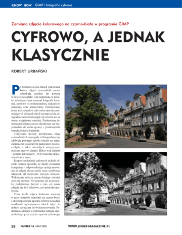 KNOW HOW GIMP i fotografia cyfrowa Zamiana zdjęcia kolorowego na czarno-białe w programie GIMP CYFROWO, A JEDNAK KLASYCZNIE ROBERT URBAŃSKI P o kilkudziesięciu latach panowania koloru zdjęcia czarno-białe znowu odzyskują należną im pozycję w świecie fotografii. Tak naprawdę, w natłoku zalewającej nas zewsząd fotografii barwnej, zarówno tej profesjonalnej, najczęściej prasowej, oraz amatorskiej, wykonywanej przez nas samych w celu uwiecznienia przemijających ulotnych chwil naszego życia, fotografia czarno-biała nigdy nie straciła nic ze swojej wyjątkowej wartości. Pozbawiona dosłowności koloru zawsze odwoływała się bezpośrednio do sedna sprawy – przekazywała emocje, uczucia i nastroje. Tradycyjne metody uzyskiwania zdjęć czarno-białych wymagały od fotografującego zdobycia pewnego zasobu wiedzy na temat chemii oraz stosowanych materiałów światłoczułych, a także niemałych umiejętności podczas pracy w ciemni. Efekty tych działań – porażki lub sukcesy – były widoczne dopiero na końcu pracy. Rozpowszechnienie cyfrowych technik obróbki obrazu sprawiło, że każdy posiadacz komputera i odpowiedniego oprogramowania do edycji obrazu może teraz spróbować własnych sił tworzeniu nowych obrazów. Wykonanie zdjęcia czarno-białego również stało się prostsze. Nie musimy już na początku podejmować decyzji o tym, czy nasze zdjęcie ma być kolorowe, czy monochromatyczne. Teraz każde zdjęcie kolorowe możemy w razie potrzeby zamienić na czarno-białe. I choć współczesne aparaty cyfrowe posiadają możliwość wykonywania takich zdjęć, to jednak odradzam jej wykorzystywanie. Podejmując decyzję o wykonaniu zdjęcia czarno-białego przy użyciu aparatu cyfrowego, 58 NUMER 16 MAJ 2005 WWW.LINUX-MAGAZINE.PL GIMP i fotografia cyfrowa KNOW HOW drzew, zwiększaniem kontrastu, czy też efekty stosowane przy wykonywaniu portretów, mające na celu usuwanie lub uwypuklanie przebarwień na skórze (piegów i pieprzyków). Sposób 1. Zmiana trybu RGB na skalę szarości (grayscale) (Obraz | Tryb | Odcienie szarości) Rysunek 1: Pierwszy sposób zamiany obrazu kolorowego na czarno-biały. Zmiana trybu RGB na tryb Skali szarości – następuje utrata informacji o kolorze. Polecenie Obraz | Tryb | Odcienie szarości. Obrazek przed i po operacji. Jest to metoda najprostsza i zdecydowanie najmniej twórcza (Rysunek 1). Poszczególne kolory zostają odwzorowane w skali szarości według ich poziomu jasności. Tracimy informację o kolorze. Dalsze modyfikacje mogą dotyczyć jedynie zmiany kontrastu i jasności całej skali tonalnej. Czasami jednak metoda ta okazuje się przydatna. Gdy dokonamy transformacji obrazu sposobami opisanymi w dalszej części tekstu, a chcemy uzyskać wydruk czarno-biały o neutralnym charakterze (bez dominanty jakiejkolwiek barwy), to warto na końcu zamienić tryb obrazu na skalę szarości. Sposób 2. Desaturacja Rysunek 2: Drugi sposób to zamiana obrazu kolorowego na czarno-biały. Desaturacja – obrazek (Warstwa | Kolory | Desaturacja) zachowuje tryb RGB. Polecenie Warstwa | Kolory | Desaturacja. Obrazek przed i po operacji. Jest to sposób konwersji równie prosty do uzyskania jak poprzedni, z tą jednak różnicą, że otrzymujemy czarno-biały obraz w trybie RGB (Rysunek 2). Podczas zabiegu desaturacji zmniejszamy do zera nasycenie barw. Informacja o kolorach zostaje nadal zachowana. Na takim czarno-białym zdjęciu możemy umieścić później kolorowe napisy lub pokolorować niektóre jego elementy według naszej indywidualnej wizji. Możemy również przeprowadzić cyfrowe tonowanie (np. sepiowanie itp.) obrazu przy pomocy wybranych narzędzi. pozbawiamy się w istocie możliwości wpływania na jego końcowy wygląd – odwzorowanie barw w skali szarości, tonalność, kontrast itp. Aparat przekonwertuje nam bowiem zarejestrowany barwny obraz niezależnie od naszej woli według algorytmów wprowadzonych nie przez fotografów, ale przez informatyków i elektroników. Poza tym bezpowrotnie tracimy informacje o kolorze. Najkorzystniejszym sposobem stworzenia zdjęcia czarno-białego metodą cyfrową jest modyfikacja fotografii barwnej przy użyciu programu do edycji obrazu. W omawianym przypadku posłużymy się znakomitym programem graficznym GIMP 2.0.5 dołączonym do najnowszej dystrybucji systemu Linux Mandrake (10.1 Official). GIMP z miesiąca na miesiąc staje się coraz bardziej doskonałym konkurentem dla profesjonalnego Photoshopa. Choć nadal pozbawiony jest możliwości profesjonalnej edycji obrazu w trybie CMYK, to dla przeciętnego fotoamatora, jak również wymagającego miłośnika fotografii, stanowi on już potężne narzędzie twórcze. Za jego pośrednictwem będziemy w stanie na kilka sposobów zamienić zdjęcie kolorowe na czarno-białe. Będziemy również mogli symulować efekty tonalne, które w tradycyjnej czarno-białej fotografii „analogowej” uzyskujemy, stosując barwne filtry nakładane na obiektyw aparatu. Mam tu na myśli efekty znane z fotografii krajobrazowej, związane z przyciemnianiem nieba, rozjaśnianiem zieleni Sposób 3. Modyfikacja odcienia, jasności i nasycenia (Narzędzia | Narzędzia kolorów | Odcień i nasycenie) W tym przypadku możemy puścić wodze naszej wyobraźni i dowolnie kształtować Rysunek : Trzeci sposób zamiany obrazu kolorowego na czarno-biały. Modyfikacja odcienia jasności i nasycenia. Obrazek zachowuje tryb RGB. Polecenie Narzędzia | Narzędzia kolorów | Odcień i nasycenie. Wygląd przed i po operacji; na trzeciej ilustracji zachowano w obrazie jeden kolor – czerwony. WWW.LINUX-MAGAZINE.PL NUMER 16 MAJ 2005 59 KNOW HOW GIMP i fotografia cyfrowa Rysunek 5: Niektóre kolory po zamianie na skalę szarości mogą posiadać taki sam walor, a więc zleją się w jednolitą płaszczyznę. wyglądem zdjęcia uzyskane podczas fotografowania z użyciem błon światłoczułych uczulonych na promieniowanie podczerwone. Wszystkie zmiany przepro