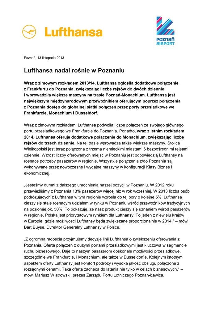 Poznań, 13 listopada 2013 Lufthansa nadal rośnie w Poznaniu Wraz z zimowym rozkładem 2013/14, Lufthansa ogłosiła dodatkowe połączenie z Frankfurtu do Poznania, zwiększając liczbę rejsów do dwóch dziennie i wprowadziła większe maszyny na trasie Poznań-Monachium. Lufthansa jest największym międzynarodowym przewoźnikiem oferującym poprzez połączenia z Poznania dostęp do globalnej siatki połączeń przez porty przesiadkowe we Frankfurcie, Monachium i Dusseldorf. Wraz z zimowym rozkładem, Lufthansa podwoiła liczbę połączeń ze swojego głównego portu przesiadkowego we Frankfurcie do Poznania. Ponadto, wraz z letnim rozkładem 2014, Lufthansa oferuje dodatkowe połączenie do Monachium, zwiększając liczbę rejsów do trzech dziennie. Na tej trasie wprowadza także większe maszyny. Stolica Wielkopolski jest teraz połączona z trzema niemieckimi miastami 6 bezpośrednimi rejsami dziennie. Wzrost liczby oferowanych miejsc w Poznaniu jest odpowiedzią Lufthansy na rosnące potrzeby pasażerów w regionie. Wszystkie połączenia z/do Poznania są wykonywane przez nowoczesne i wydajne maszyny w konfiguracji Klasy Biznes i ekonomicznej. „Jesteśmy dumni z dalszego umocnienia naszej pozycji w Poznaniu. W 2012 roku przewieźliśmy z Poznania 13% pasażerów więcej niż w rok wcześniej. W 2013 liczba osób podróżujących z Lufthansą w tym regionie wzrosła do tej pory o kolejne 5%. Lufthansa cieszy się stale rosnącym udziałem w rynku w Poznaniu wśród przewoźników tradycyjnych na poziomie ok. 50%. To pokazuje, że nasz produkt cieszy się uznaniem wśród pasażerów w regionie. Polska jest priorytetowym rynkiem dla Lufthansy. To jeden z niewielu krajów w Europie, gdzie możliwości Lufthansy będą zwiększane proporcjonalnie w 2014.” – mówi Bart Buyse, Dyrektor Generalny Lufthansy w Polsce. „Z ogromną radością przyjmujemy decyzje linii Lufthansa o zwiększeniu oferowania z Poznania. Oferta połączeń z dużymi portami przesiadkowymi jest kluczowa w segmencie ruchu biznesowego. Daje to naszym pasażerom doskonałe możliwości przesiadkowe, szczególnie we Frankfurcie, i Monachium, ale także w Dusseldorfie. Kolejnym istotnym aspektem oferty Lufthansy jest komfort podróży i wysoka jakość obsługi, połączone z rozsądnymi cenami. Taka oferta zachęca do latania nie tylko w celach biznesowych.“ – mówi Mariusz Wiatrowski, prezes Zarządu Portu Lotniczego Poznań-Ławica. Poznań jest ważnym rynkiem podróży służbowych dla Lufthansy w Polsce. Lufthansa współpracuje z ponad 500 firmami z regionu w ramach programu Partner Plus Benefit, dzięki któremu Lufthansa jest linią pierwszego wyboru dla klientów biznesowych. Lufthansa jest jedyną międzynarodową linią, która od lat kładzie duży nacisk na rozwój w polskich regionach, dzięki czemu umacnia tu swoją pozycję lidera. Łączy wzrost liczby oferowanych miejsc w zimowym rozkładzie połączeń wyniesie 20%, prognozy wzrostu na rok 2014 przewidują nawet 30% wzrost. Możliwości transportowe Lufthansy z Poznania wzrosną w 2014 o 47%. “Lufthansa konsekwentnie inwestuje w swoją flotę, aby spełnić oczekiwania nawet najbardziej wymagających pasażerów. Wartość ostatniego zamówienia Grupy Lufthansa na 37 maszyn typu Boeing 777-9X i 25 Airbusów A350-900, wynosi 14 miliardów euro po cenach katalogowych i jest największym w historii przemysłu niemieckiego w sektorze prywatnym. Do 2014 roku zainwestujemy 3 miliardy euro w rozwój produktów i usług. Stale inwestując w naszą ofertę, również w trudnej sytuacji ekonomicznej, skupiamy się na naszych pasażerach i chcemy być liderem innowacji, gwarantującym niezawodne połączenia oraz najwyższą jakość usług i produktów.” – podkreślił Buyse. Tej zimy pasażerowie Lufthansy mogą wybierać spośród 199 połączeń w 81 krajach na całym świecie. Lufthansa konkuruje z sukcesem i nadal wzmacnia swoją pozycję wiodącego tradycyjnego przewoźnika, dzięki stałym inwestycjom w nowe technologie, wzrost wydajności, komfort pasażerów oraz modernizację floty, która trwa aktualnie wśród wszystkich przewoźników Grupie Lufthansy. Dodatkowych informacji udzielają: Deutsche Lufthansa AG Group Communications Europe Martin Riecken Tel. +49 69 / 69695008 http://media.lufthansa.com Solski Burson-Marsteller Senior Associate Anna Włodarczyk Tel. (22) 242 86 33 [email protected] Solski Burson-Marsteller Manager Adam Kaliszewski Tel. (22) 242 86 32 [email protected] 2/2