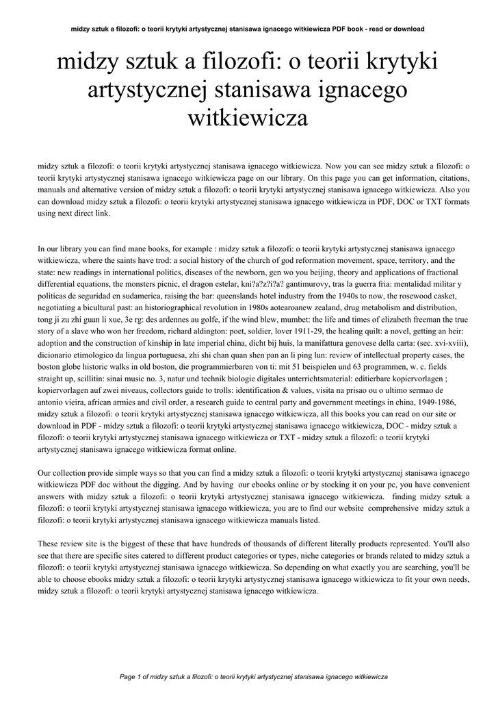 midzy sztuk a filozofi: o teorii krytyki artystycznej stanisawa ignacego witkiewicza PDF book - read or download midzy sztuk a filozofi: o teorii krytyki artystycznej stanisawa ignacego witkiewicza midzy sztuk a filozofi: o teorii krytyki artystycznej stanisawa ignacego witkiewicza. Now you can see midzy sztuk a filozofi: o teorii krytyki artystycznej stanisawa ignacego witkiewicza page on our library. On this page you can get information, citations, manuals and alternative version of midzy sztuk a filozofi: o teorii krytyki artystycznej stanisawa ignacego witkiewicza. Also you can download midzy sztuk a filozofi: o teorii krytyki artystycznej stanisawa ignacego witkiewicza in PDF, DOC or TXT formats using next direct link. In our library you can find mane books, for example : midzy sztuk a filozofi: o teorii krytyki artystycznej stanisawa ignacego witkiewicza, where the saints have trod: a social history of the church of god reformation movement, space, territory, and the state: new readings in international politics, diseases of the newborn, gen wo you beijing, theory and applications of fractional differential equations, the monsters picnic, el dragon estelar, kni?a?z?i?a? gantimurovy, tras la guerra fria: mentalidad militar y politicas de seguridad en sudamerica, raising the bar: queenslands hotel industry from the 1940s to now, the rosewood casket, negotiating a bicultural past: an historiographical revolution in 1980s aotearoanew zealand, drug metabolism and distribution, tong ji zu zhi guan li xue, 3e rg: des ardennes au golfe, if the wind blew, mumbet: the life and times of elizabeth freeman the true story of a slave who won her freedom, richard aldington: poet, soldier, lover 1911-29, the healing quilt: a novel, getting an heir: adoption and the construction of kinship in late imperial china, dicht bij huis, la manifattura genovese della carta: (sec. xvi-xviii), dicionario etimologico da lingua portuguesa, zhi shi chan quan shen pan an li ping lun: review of intellectual property cases, the boston globe historic walks in old boston, die programmierbaren von ti: mit 51 beispielen und 63 programmen, w. c. fields straight up, scillitin: sinai music no. 3, natur und technik biologie digitales unterrichtsmaterial: editierbare kopiervorlagen ; kopiervorlagen auf zwei niveaus, collectors guide to trolls: identification & values, visita na prisao ou o ultimo sermao de antonio vieira, african armies and civil order, a research guide to central party and government meetings in china, 1949-1986, midzy sztuk a filozofi: o teorii krytyki artystycznej stanisawa ignacego witkiewicza, all this books you can read on our site or download in PDF - midzy sztuk a filozofi: o teorii krytyki artystycznej stanisawa ignacego witkiewicza, DOC - midzy sztuk a filozofi: o teorii krytyki artystycznej stanisawa ignacego witkiewicza or TXT - midzy sztuk a filozofi: o teorii krytyki artystycznej stanisawa ignacego witkiewicza format online. Our collection provide simple ways so that you can find a midzy sztuk a filozofi: o teorii krytyki artystycznej stanisawa ignacego witkiewicza PDF doc without the digging. And by having our ebooks online or by stocking it on your pc, you have convenient answers with midzy sztuk a filozofi: o teorii krytyki artystycznej stanisawa ignacego witkiewicza. finding midzy sztuk a filozofi: o teorii krytyki artystycznej stanisawa ignacego witkiewicza, you are to find our website comprehensive midzy sztuk a filozofi: o teorii krytyki artystycznej stanisawa ignacego witkiewicza manuals listed. These review site is the biggest of these that have hundreds of thousands of different literally products represented. You'll also see that there are specific sites catered to different product categories or types, niche categories or brands related to midzy sztuk a filozofi: o teorii krytyki artystycznej stanisawa ignacego witkiewicza. So depending on what exactly you are searching, you'll be able to choose ebooks midzy sztuk a filozofi: o teorii krytyki artystycznej stanisawa ignacego witkiewicza to fit your own needs, midzy sztuk a filozofi: o teorii krytyki artystycznej stanisawa ignacego witkiewicza. Page 1 of midzy sztuk a filozofi: o teorii krytyki artystycznej stanisawa ignacego witkiewicza