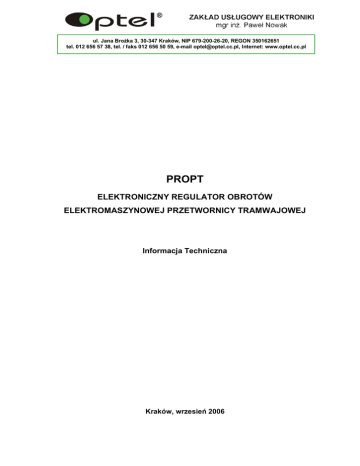 ul. Jana Brożka 3, 30-347 Kraków, NIP 679-200-26-20, REGON 350162651 tel. 012 656 57 38, tel. / faks 012 656 50 59, e-mail [email protected], Internet: www.optel.cc.pl PROPT ELEKTRONICZNY REGULATOR OBROTÓW ELEKTROMASZYNOWEJ PRZETWORNICY TRAMWAJOWEJ Informacja Techniczna Kraków, wrzesień 2006 ul. Jana Brożka 3, 30-347 Kraków, NIP 679-200-26-20, REGON 350162651 tel. 012 656 57 38, tel. / faks 012 656 50 59, e-mail [email protected], Internet: www.optel.cc.pl PROPT REGULATOR OBROTÓW PRZETWORNICY TRAMWAJOWEJ INFORMACJA TECHNICZNA 2/5 MODERNIZACJA WYEKSPLOATOWANEGO TABORU TRAMWAJOWEGO NIEWIELKIM KOSZTEM ZWIĘKSZENIE ŻYWOTNOŚCI PODZESPOŁÓW I ELEMENTÓW PRZETWORNICY TRAMWAJOWEJ OSZCZĘDNOŚĆ BATERII TRAMWAJU LEPSZA STABILIZACJA NAPIĘCIA PRĄDNICY 40 V OBNIŻENIE POZIOMU HAŁASU PRZETWORNICY DO NIEZBĘDNEGO MINIMUM W ZROST KOMFORTU JAZDY 1. WPROWADZENIE Przedmiotem niniejszego opisu jest elektroniczny regulator obrotów elektromaszynowej przetwornicy tramwajowej PROPT. Producentem urządzenia jest Zakład Usługowy Elektroniki OPTEL W Krakowie. W wagonach tramwajowych typu 105N eksploatowanych w kraju obwody sterowania i pomocnicze zasilane są prądem stałym o napięciu nominalnym 40 V. Źródłem tego napięcia jest przetwornica elektromaszynowa. Urządzenie to posiada, we wspólnej obudowie, silnik prądu stałego zasilany napięciem trakcyjnym oraz sprzężoną z nim prądnicę dostarczającą napięcie stałe 40V. Elektroniczny regulator PROPT zapewnia optymalną regulację obrotów przetwornicy i, współpracując z regulatorem napięcia RNDZ, stabilizację napięcia prądnicy. Pracująca z dużą prędkością przetwornica jest głównym źródłem hałasu w wagonie tramwajowym. Duża prędkość obrotowa przetwornicy utrzymywana jest niezależnie od faktycznej potrzeby chłodzenia elementów rozruchowych wagonu. Praca urządzenia z maksymalną prędkością przez około 18 godzin na dobę powoduje szybkie zużycie szczotek oraz komutatora silnika i kolektora prądnicy. Producenci urządzeń automatyki i elektroniki przemysłowej oferują nowoczesne przetwornice statyczne w wysokich cenach. Wyposażenie w tego rodzaju sprzęt wagonów typu 105N, eksploatowanych od wielu lat i przestarzałych technicznie, nie ma uzasadnienia ekonomicznego. Proponowane przez ZUE OPTEL rozwiązanie pozwala na modernizację wyeksploatowanego taboru i podniesienie komfortu jazdy oraz obsługi stosunkowo niskim kosztem. ul. Jana Brożka 3, 30-347 Kraków, NIP 679-200-26-20, REGON 350162651 tel. 012 656 57 38, tel. / faks 012 656 50 59, e-mail [email protected], Internet: www.optel.cc.pl PROPT REGULATOR OBROTÓW PRZETWORNICY TRAMWAJOWEJ INFORMACJA TECHNICZNA 3/5 2. CHARAKTERYSTYKA WYROBU Dokonane przez ZUE OPTEL pomiary pozwoliły stwierdzić, że możliwe jest zmniejszenie obrotów silnika przetwornicy bez zwiększenia temperatury rozrusznika. Elektroniczny regulator PROPT zapewnia regulację obrotów przetwornicy w zależności od temperatury otoczenia elementów rozruchowych, mierzonej w ciągły sposób przez czujnik elektroniczny umieszczony w pobliżu elementów oporowych rozrusznika. Zmiana obrotów przetwornicy dokonywana jest płynnie, za pomocą przerywnika tranzystorowego wykonanego w nowoczesnej technologii, w zakresie od prędkości minimalnej (przy temperaturze otoczenia rozrusznika ok. 35°C) do maksymalnej (przy temperaturze powyżej 75°C). W zakresie temperatur rozrusznika mniejszych od ok. 35°C, gdy chłodzenie elementów rozruchowych wagonu nie jest wymagane, regulator PROPT utrzymuje obroty przetwornicy na poziomie niezbędnym do zapewnienia zasilania obwodów sterujących i pomocniczych wagonu, przy minimalnym poziomie hałasu . Regulator PROPT jest umieszczony w metalowej obudowie z radiatorem, przystosowanej do mocowania do tablicy montażowej, np. w skrzyni aparatowej za stanowiskiem prowadzącego. Montaż urządzenia wymaga niewielkich przeróbek w obwodach rozruchu i zasilania silnika przetwornicy oraz przeciągnięcia dodatkowego przewodu z okolic rozrusznika w pobliże stanowiska prowadzącego (miejsca zamocowania regulatora). Na obudowie regulatora umieszczono sygnalizacyjne diody świecące, które umożliwiają natychmiastowe określenie stanu pracy regulatora i przetwornicy. ul. Jana Brożka 3, 30-347 Kraków, NIP 679-200-26-20, REGON 350162651 tel. 012 656 57 38, tel. / faks 012 656 50 59, e-mail [email protected], Internet: www.optel.cc.pl PROPT REGULATOR OBROTÓW PRZETWORNICY TRAMWAJOWEJ INFORMACJA TECHNICZNA 4/5 Regulator PROPT zamontowany w skrzyni aparatowej za stanowiskiem prowadzącego 3. PODSTAWOWE DANE TECHNICZNE Wartość Jednostka 400... 900 V— około 950 obr / min 3.3 Minimalny prąd pobierany 2 A 3.4 Maksymalny prąd pobierany 13 A L. p. Cecha lub parametr 3.1 Napięcie trakcyjne 3.2 Minimalne obroty przetwornicy utrzymywane przez PROPT w celu uzyskania napięcia 40V 3.5 Sygnalizacja stanu regulatora i zaniżonego napięcia baterii 3.6 Regulator napięcia współpracujący z regulatorem PROPT 3.7 Wymiary maksymalne diody świecące RNDZ – prod. ZUE OPTEL® 225x175x140 (W x L x H) mm ul. Jana Brożka 3, 30-347 Kraków, NIP 679-200-26-20, REGON 350162651 tel. 012 656 57 38, tel. / faks 012 656 50 59, e-mail [email protected], Internet: www.optel.cc.pl PROPT REGULATOR OBROTÓW PRZETWORNICY TRAMWAJOWEJ INFORMACJA TECHNICZNA 5/5 4. BADANIA EKSPLOATACYJNE Elektroniczny regulator PROPT jest stosowany od dziewięciu lat w taborze MPK SA w Krakowie i, od dwóch lat, w ZKM GDAŃSK. W zestawach wagonowych zamontowano ponad dwieście egzemplarzy tych urządzeń wraz z regulatorami napięcia RNDZ, stanowiącymi niezbędne uzupełnienie nowego zespołu. 5. KORZYŚCI Z ZASTOSOWANEGO ROZWIĄZANIA Zmniejszenie zużycia energii pobieranej przez wagon (ok. 750 kWh w skali roku) Zwiększenie żywotności podzespołów i elementów przetwornicy tramwajowej Oszczędność baterii tramwaju Lepsza stabilizacja napięcia prądnicy 40 V Obniżenie poziomu hałasu przetwor