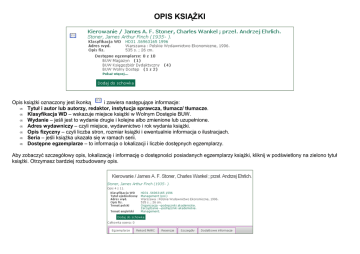 OPIS KSIĄśKI Opis ksiąŜki oznaczony jest ikonką i zawiera następujące informacje: • Tytuł i autor lub autorzy, redaktor, instytucja sprawcza, tłumacz/ tłumacze. • Klasyfikacja WD – wskazuje miejsce ksiąŜki w Wolnym Dostępie BUW. • Wydanie – jeśli jest to wydanie drugie i kolejne albo zmienione lub uzupełnione. • Adres wydawniczy – czyli miejsce, wydawnictwo i rok wydania ksiąŜki. • Opis fizyczny – czyli liczba stron, rozmiar ksiąŜki i ewentualnie informacja o ilustracjach. • Seria – jeśli ksiąŜka ukazała się w ramach serii. • Dostępne egzemplarze – to informacja o lokalizacji i liczbie dostępnych egzemplarzy. Aby zobaczyć szczegółowy opis, lokalizację i informację o dostępności posiadanych egzemplarzy ksiąŜki, kliknij w podświetlony na zielono tytuł ksiąŜki. Otrzymasz bardziej rozbudowany opis. PowyŜszy ekran, oprócz informacji z pierwszej strony, zawiera dodatkowo: • Temat polski – czyli hasła w języku polskim określające tematykę danej ksiąŜki • Temat angielski – czyli hasła w języku angielskim określające tematykę ksiąŜki Pola zawierające nazwę autora, temat polski i temat angielski odsyłają do innych publikacji odpowiednio: tego samego autora lub na ten sam temat. Informacje o lokalizacji i dostępności egzemplarzy ksiąŜki znajdują się w zakładce Egzemplarze. Lokalizacja – określa miejsce ksiąŜki w danej bibliotece. W powyŜszym przykładzie mamy następujące lokalizacje: • BUW Magazyn – jeśli chcesz skorzystać z tej ksiąŜki, zamów ją poprzez opcję Zamów/Rezerwuj; • BUW Księgozbiór Dydaktyczny – poszukaj tej ksiąŜki samodzielnie według sygnatury w obszarze Księgozbioru Dydaktycznego BUW (poziom 2); jeśli jesteś studentem UW, moŜesz ją wypoŜyczyć, weź ją z półki i zarejestruj w WypoŜyczalni Miejscowej (poziom 1); • BUW Wolny Dostęp – poszukaj tej ksiąŜki samodzielnie według Klasyfikacji WD (HD31 .S6963165 1996) w obszarze Wolnego Dostępu BUW. KsiąŜkę ze statusem Dostępny moŜesz wypoŜyczyć do domu, weź ją z półki i zarejestruj w WypoŜyczalni Miejscowej (poziom 1); z ksiąŜki ze statusem Nie wypoŜycza się moŜesz skorzystać tylko na miejscu w BUW; • Oddział Usług Informacyjnych i Szkoleń – złóŜ zamówienie do Czytelni Ogólnej, korzystając z opcji Zamów/Rezerwuj; • Wydział Zarządzania – Czytelnia, Wydział Nauk Ekonom. – z ksiąŜek moŜesz skorzystać odpowiednio: w Bibliotece Wydziału Zarządzania UW (ul. Szturmowa 3) i w Bibliotece Wydziału Nauk Ekonomicznych UW (ul. Długa 44/50). Ponadto w katalogu moŜesz spotkać lokalizacje: • BUW WD [nazwa depozytu lub kolekcji] – szukaj samodzielnie według sygnatury w obrębie odpowiedniej kolekcji w obszarze Wolnego Dostępu BUW; • [nazwa gabinetu zbiorów specjalnych BUW] – zgłoś się do Informatorium, którego pracownicy umoŜliwią Ci kontakt z odpowiednim gabinetem. Sygnatura – określa miejsce ksiąŜki w danej lokalizacji, jest waŜna w przypadku lokalizacji BUW Magazyn (846868) i BUW Księgozbiór Dydaktyczny (W.55570 a). Status – zawiera informację o dostępności danego egzemplarza. W powyŜszym przykładzie mamy następujące statusy: • Dostępny – oznacza, Ŝe osoby uprawnione mogą ksiąŜkę wypoŜyczyć do domu, wszyscy czytelnicy mogą skorzystać z ksiąŜki na miejscu w bibliotece; • Nie wypoŜycza się – oznacza, Ŝe z ksiąŜki moŜna skorzystać tylko na miejscu w BUW; • [zwyczajowa nazwa biblioteki wydziałowej, np. Ekonomia] – brak informacji w katalogu o dostępności ksiąŜki, naleŜy sprawdzić w Bibliotece Wydziału Nauk Ekonomicznych; • Zwrot 2014-09-11 21:00 – oznacza, Ŝe ksiąŜka jest obecnie wypoŜyczona do 11 września 2014 r., moŜna ją zarezerwować. Ponadto w katalogu moŜesz spotkać statusy: • WypoŜyczony, Zamówione – ksiąŜka oczekuje na wypoŜyczenie, obecnie jest niedostępna, moŜna ją zarezerwować; • W oprawie, w opracowaniu – ksiąŜka obecnie niedostępna. Na adres [email protected] moŜna przesłać prośbę o przyśpieszenie oprawy i/lub opracowania. • Długie przetrzymanie – egzemplarz nie został zwrócony przez okres dłuŜszy niŜ 4 miesiące od wyznaczonej daty zwrotu. Klasyfikacja WD/Uwagi – określa miejsce ksiąŜki w Wolnym Dostępie BUW. W powyŜszym przykładzie klasyfikacja HD31. S6963165 1996 oznacza, Ŝe ksiąŜka znajduje się w dziedzinie H GN1-673 GR-GV – Nauki społeczne. Antropologia na poziomie 2. W zakładce Szczegóły znajdziesz dodatkowe informacje o ksiąŜce, m.in. tytuł ujednolicony, hasło dodatkowe, uwagi. W zakładce Rekord MARC znajdziesz wszystkie informacje o ksiąŜce zapisane w bibliotecznym formacie MARC.