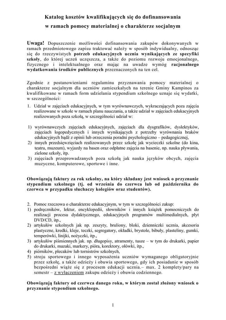 Katalog kosztów kwalifikujących się do dofinansowania w ramach pomocy materialnej o charakterze socjalnym Uwaga! Dopuszczenie możliwości dofinansowania zakupów dokonywanych w ramach przedmiotowego zapisu traktować należy w sposób indywidualny, odnosząc się do rzeczywistych potrzeb edukacyjnych ucznia wynikających ze specyfiki szkoły, do której uczeń uczęszcza, a także do poziomu rozwoju emocjonalnego, fizycznego i intelektualnego oraz mając na uwadze wymóg racjonalnego wydatkowania środków publicznych przeznaczonych na ten cel. Zgodnie z postanowieniami regulaminu przyznawania pomocy materialnej o charakterze socjalnym dla uczniów zamieszkałych na terenie Gminy Kampinos za kwalifikowane w ramach form udzielania stypendium szkolnego uznaje się wydatki, w szczególności: 1. Udział w zajęciach edukacyjnych, w tym wyrównawczych, wykraczających poza zajęcia realizowane w szkole w ramach planu nauczania, a także udział w zajęciach edukacyjnych realizowanych poza szkołą, w szczególności udział w: 1) wyrównawczych zajęciach edukacyjnych, zajęciach dla dysgrafików, dyslektyków, zajęciach logopedycznych i innych wynikających z potrzeby wyrównania braków edukacyjnych bądź z opinii lub orzeczenia poradni psychologiczno – pedagogicznej, 2) innych przedsięwzięciach realizowanych przez szkołę jak wycieczki szkolne (do kina, teatru, muzeum), wyjazdy na basen oraz odpłatne zajęcia na basenie, np. nauka pływania, zielone szkoły, itp. 3) zajęciach przeprowadzanych poza szkołą jak nauka języków obcych, zajęcia muzyczne, komputerowe, sportowe i inne. Obowiązują faktury za rok szkolny, na który składany jest wniosek o przyznanie stypendium szkolnego (tj. od września do czerwca lub od października do czerwca w przypadku słuchaczy kolegiów oraz studentów). 2. Pomoc rzeczowa o charakterze edukacyjnym, w tym w szczególności zakup: 1) podręczników, lektur, encyklopedii, słowników i innych książek pomocniczych do realizacji procesu dydaktycznego, edukacyjnych programów multimedialnych, płyt DVD/CD, itp., 2) artykułów szkolnych jak np. zeszyty, bruliony, bloki, dzienniczki ucznia, akcesoria plastyczne, kredki, kleje, teczki, segregatory, okładki, brystole, bibuły, plasteliny, gumki, temperówki, linijki, nożyczki, itp., 3) artykułów piśmiennych jak. np. długopisy, atramenty, tusze – w tym do drukarki, papier do drukarki, mazaki, markery, pióra, korektory, ołówki, itp., 4) piórników, plecaków lub tornistrów szkolnych, 5) stroju sportowego i innego wyposażenia uczniów wymaganego obligatoryjnie przez szkołę, a także odzieży i obuwia sportowego, gdy ich posiadanie w sposób bezpośredni wiąże się z procesem edukacji ucznia.– max. 2 komplety/pary na semestr – z wyłączeniem zakupu odzieży i obuwia codziennego. Obowiązują faktury od czerwca danego roku, w którym został złożony wniosek o przyznanie stypendium szkolnego. 1 3. Dostęp do Internetu: 1) instalacja, 2) abonament. Obowiązują faktury za rok szkolny, na który składany jest wniosek o przyznanie stypendium szkolnego (tj. od września do czerwca lub od października do czerwca w przypadku słuchaczy kolegiów oraz studentów). 4. Wydatki związane z pobieraniem nauki poza miejscem zamieszkania w odniesieniu do ucznia w rozumieniu § 3 ust. 1 pkt 1 c) – g) oraz pkt. 3 i 4 regulaminu, a także ucznia szkoły ponadgimnazjalnej w szczególności: 1) opłat za naukę (czesnego) uiszczanych na rzecz szkół i kolegiów, 2) zakwaterowania w bursie, internacie, 3) dojazdu do szkoły, kolegium środkami komunikacji zbiorowej (bilety miesięczne), 4) wyżywienia w stołówce szkolnej lub studenckiej. Obowiązują faktury za rok szkolny, na który składany jest wniosek o przyznanie stypendium szkolnego (tj. od września do czerwca lub od października do czerwca w przypadku słuchaczy kolegiów oraz studentów). WAŻNE! Faktury bądź rachunki muszą być wystawione imiennie na wnioskodawcę lub ucznia. Istotne jest także, aby na fakturze w przypadku zakupu kostiumu gimnastycznego (koszulki, spodenek czy dresu) widoczna była adnotacja „szkolne” lub „sportowe”. Sprzedawca może również dokonać takiego potwierdzenia na odwrocie dokumentu. UWAGA! Zakup codziennej odzieży lub obuwia, umożliwiającego uczniowi dotarcie do szkoły (kurtka, buty, bluzki, spodnie) leży w kompetencjach resortu polityki społecznej i nie jest finansowany w ramach stypendium szkolnego. 2