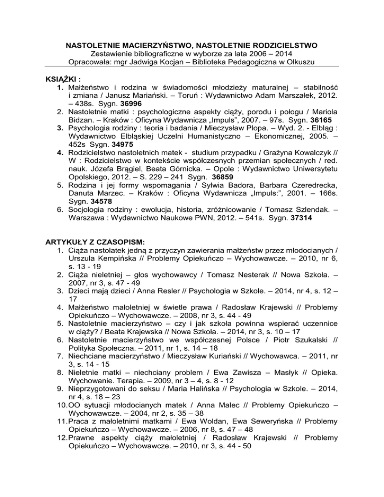 NASTOLETNIE MACIERZYŃSTWO, NASTOLETNIE RODZICIELSTWO Zestawienie bibliograficzne w wyborze za lata 2006 – 2014 Opracowała: mgr Jadwiga Kocjan – Biblioteka Pedagogiczna w Olkuszu KSIĄŻKI : 1. Małżeństwo i rodzina w świadomości młodzieży maturalnej – stabilność i zmiana / Janusz Mariański. – Toruń : Wydawnictwo Adam Marszałek, 2012. – 438s. Sygn. 36996 2. Nastoletnie matki : psychologiczne aspekty ciąży, porodu i połogu / Mariola Bidzan. – Kraków : Oficyna Wydawnicza „Impuls”, 2007. – 97s. Sygn. 36165 3. Psychologia rodziny : teoria i badania / Mieczysław Plopa. – Wyd. 2. - Elbląg : Wydawnictwo Elbląskiej Uczelni Humanistyczno – Ekonomicznej, 2005. – 452s Sygn. 34975 4. Rodzicielstwo nastoletnich matek - studium przypadku / Grażyna Kowalczyk // W : Rodzicielstwo w kontekście współczesnych przemian społecznych / red. nauk. Józefa Brągiel, Beata Górnicka. – Opole : Wydawnictwo Uniwersytetu Opolskiego, 2012. – S. 229 – 241 Sygn. 36859 5. Rodzina i jej formy wspomagania / Sylwia Badora, Barbara Czeredrecka, Danuta Marzec. – Kraków : Oficyna Wydawnicza „Impuls:”, 2001. – 166s. Sygn. 34578 6. Socjologia rodziny : ewolucja, historia, zróżnicowanie / Tomasz Szlendak. – Warszawa : Wydawnictwo Naukowe PWN, 2012. – 541s. Sygn. 37314 ARTYKUŁY Z CZASOPISM: 1. Ciąża nastolatek jedną z przyczyn zawierania małżeństw przez młodocianych / Urszula Kempińska // Problemy Opiekuńczo – Wychowawcze. – 2010, nr 6, s. 13 - 19 2. Ciąża nieletniej – głos wychowawcy / Tomasz Nesterak // Nowa Szkoła. – 2007, nr 3, s. 47 - 49 3. Dzieci mają dzieci / Anna Resler // Psychologia w Szkole. – 2014, nr 4, s. 12 – 17 4. Małżeństwo małoletniej w świetle prawa / Radosław Krajewski // Problemy Opiekuńczo – Wychowawcze. – 2008, nr 3, s. 44 - 49 5. Nastoletnie macierzyństwo – czy i jak szkoła powinna wspierać uczennice w ciąży? / Beata Krajewska // Nowa Szkoła. – 2014, nr 3, s. 10 – 17 6. Nastoletnie macierzyństwo we współczesnej Polsce / Piotr Szukalski // Polityka Społeczna. – 2011, nr 1, s. 14 – 18 7. Niechciane macierzyństwo / Mieczysław Kuriański // Wychowawca. – 2011, nr 3, s. 14 - 15 8. Nieletnie matki – niechciany problem / Ewa Zawisza – Masłyk // Opieka. Wychowanie. Terapia. – 2009, nr 3 – 4, s. 8 - 12 9. Nieprzygotowani do seksu / Maria Halińska // Psychologia w Szkole. – 2014, nr 4, s. 18 – 23 10. OO sytuacji młodocianych matek / Anna Malec // Problemy Opiekuńczo – Wychowawcze. – 2004, nr 2, s. 35 – 38 11. Praca z małoletnimi matkami / Ewa Woldan, Ewa Seweryńska // Problemy Opiekuńczo – Wychowawcze. – 2006, nr 8, s. 47 – 48 12. Prawne aspekty ciąży małoletniej / Radosław Krajewski // Problemy Opiekuńczo – Wychowawcze. – 2010, nr 3, s. 44 - 50 13. Program „Dobra Mama” / Wanda Masalska – Szymanek // Problemy Opiekuńczo – Wychowawcze. – 2013, nr 7, s. 26 – 30 14. Przyszłość młodych samotnych matek / Daria Becker – Pestka // Edukacja i Dialog. – 2006, nr 9, s. 62 – 64 15. Rozwody małżeństw młodocianych / Urszula Kempińska // Problemy Opiekuńczo – Wychowawcze. – 2010, nr 10, s. 23 – 28 16. Spór o instynkt macierzyński / Mariola Bieńko // Problemy Opiekuńczo – Wychowawcze. – 2003, nr 3, s. 13 - 16 17. Wybór zawodu i stosunek do pracy małżeństw młodocianych – komunikat z badań / Urszula Kempińska // Wychowanie na co Dzień. – 2012, nr 3, s. 24 – 28 18. Z doświadczeń hostelu dla małoletnich w ciąży / Jarosław Pułanecki // Problemy Opiekuńczo – Wychowawcze. – 2010, nr 6, s. 19 - 21