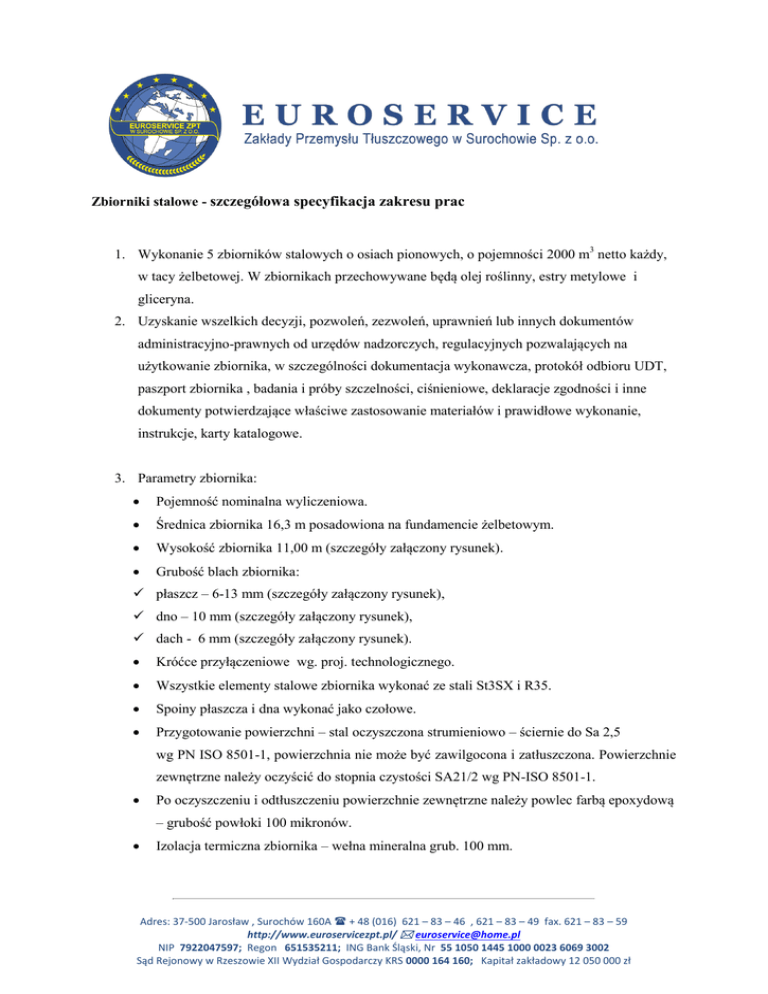 Zbiorniki stalowe - szczegółowa specyfikacja zakresu prac 1. Wykonanie 5 zbiorników stalowych o osiach pionowych, o pojemności 2000 m3 netto każdy, w tacy żelbetowej. W zbiornikach przechowywane będą olej roślinny, estry metylowe i gliceryna. 2. Uzyskanie wszelkich decyzji, pozwoleń, zezwoleń, uprawnień lub innych dokumentów administracyjno-prawnych od urzędów nadzorczych, regulacyjnych pozwalających na użytkowanie zbiornika, w szczególności dokumentacja wykonawcza, protokół odbioru UDT, paszport zbiornika , badania i próby szczelności, ciśnieniowe, deklaracje zgodności i inne dokumenty potwierdzające właściwe zastosowanie materiałów i prawidłowe wykonanie, instrukcje, karty katalogowe. 3. Parametry zbiornika: Pojemność nominalna wyliczeniowa. Średnica zbiornika 16,3 m posadowiona na fundamencie żelbetowym. Wysokość zbiornika 11,00 m (szczegóły załączony rysunek). Grubość blach zbiornika: płaszcz – 6-13 mm (szczegóły załączony rysunek), dno – 10 mm (szczegóły załączony rysunek), dach - 6 mm (szczegóły załączony rysunek). Króćce przyłączeniowe wg. proj. technologicznego. Wszystkie elementy stalowe zbiornika wykonać ze stali St3SX i R35. Spoiny płaszcza i dna wykonać jako czołowe. Przygotowanie powierzchni – stal oczyszczona strumieniowo – ściernie do Sa 2,5 wg PN ISO 8501-1, powierzchnia nie może być zawilgocona i zatłuszczona. Powierzchnie zewnętrzne należy oczyścić do stopnia czystości SA21/2 wg PN-ISO 8501-1. Po oczyszczeniu i odtłuszczeniu powierzchnie zewnętrzne należy powlec farbą epoxydową – grubość powłoki 100 mikronów. Izolacja termiczna zbiornika – wełna mineralna grub. 100 mm. Adres: 37-500 Jarosław , Surochów 160A + 48 (016) 621 – 83 – 46 , 621 – 83 – 49 fax. 621 – 83 – 59 http://www.euroservicezpt.pl/ [email protected] NIP 7922047597; Regon 651535211; ING Bank Śląski, Nr 55 1050 1445 1000 0023 6069 3002 Sąd Rejonowy w Rzeszowie XII Wydział Gospodarczy KRS 0000 164 160; Kapitał zakładowy 12 050 000 zł Okładzina zewnętrzna ścian zbiornika i dachu blacha fałdowa powlekana na kolor biały TR 18 grub. 0,5 mm. Po oczyszczeniu i odtłuszczeniu powierzchnie wewnętrzne zabezpieczyć powłoką odporną na: pH- 3 – 12, temperaturę do 70 oC, działanie wodnych roztworów kwasów karboksylowych, estrów metylowe kwasów tłuszczowych (FAME) ( UWAGA : estry są dobrym rozpuszczalnikiem organicznym). Wykonanie elementu grzejnego (wężownica) w celu podgrzania produktu do 25 – 30oC czynnik grzewczy glikol o temperaturze 60 oC. 4. Pomosty obsługowe Wejście do tacy o głębokości 3,0 m schodami z krat pomostowych antypoślizgowych. Belki policzkowe schodów wykonać z [140 opartego na konstrukcjach wsporczych ustawionych na ścianach wanny żelbetowej. Elementy podparć wykonać z [120 i [100. Wejście na dach zbiornika drabinką zgodna z wymaganiami BHP. Podesty nad i dookoła zbiorników wykonane z krat pomostowych antypoślizgowych, belki główne z [120 i [100 stężenia [100 i kątowników 50x50x5. Podesty między zbiornikami wykonane z krat pomostowych antypoślizgowych, belki główne z [120 i [100 stężenia [100 i kątowników 50x50x5, łączyć z pozostałymi podestami na połączenia śrubowe umożliwiające wzajemne przemieszczanie się. Balustrady wys. 1,10 m z rur 42,4x 2,9. Słupki z płaskownika 60x6 mm co 1,50 m. Poręcze, barierki, drabinki, balustrady malowane na żółto. Adres: 37-500 Jarosław , Surochów 160A + 48 (016) 621 – 83 – 46 , 621 – 83 – 49 fax. 621 – 83 – 59 http://www.euroservicezpt.pl/ [email protected] NIP 7922047597; Regon 651535211; ING Bank Śląski, Nr 55 1050 1445 1000 0023 6069 3002 Sąd Rejonowy w Rzeszowie XII Wydział Gospodarczy KRS 0000 164 160; Kapitał zakładowy 12 050 000 zł
