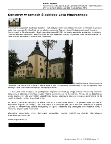 Radio Opole http://www.radio.opole.pl/2011/sierpien/kultura-i-rozrywka/konc erty-w-ramach-slaskiego-lata-muzycznego.html Koncerty w ramach Śląskiego Lata Muzycznego "Muzyka w zabytkach śląskiego baroku" – tak zatytułowany jest kolejny koncert w ramach Śląskiego Lata Muzycznego. Festiwal już po raz piąty organizuje Towarzystwo Międzynarodowych Kursów Muzycznych w Głuchołazach. – Podczas sobotniego (13.08) koncertu wystąpią: wspaniały organista Dariusz Bąkowski-Kois oraz Kenji Tamiya, którzy wykonają utwory organowe Jana Sebastiana Bacha oraz utwory na trąbkę – mówi Anna Gościńska. Koncert zostanie powtórzony w niedzielę (14.08) w Głuchołazach. Natomiast w sali koncertowej Państwowej Szkoły muzycznej tego samego dnia zaplanowano wystąp pedagogów kursu. – U nas jest taka tradycja, że pedagodzy najpierw przekazują swoją wiedzę muzyczną młodym adeptom, a później prezentują swoje własne umiejętności na koncercie. Myślę, że to dodatkowy walor edukacyjny dla wszystkich uczestników kursu. Uczniowie zawsze czekają niecierpliwie na tę część festiwalu – mówi Anna Gościńska. W ramach festiwalu odbędą się także koncerty uczestników kursu – w poniedziałek (15.08) w Kamieniu Śląskim, w środę (17.08) w Brzegu, a w czwartek (18.08) w Mosznej. Natomiast w piątek (19.08) w Państwowej Szkole Muzycznej w Opolu odbędzie się uroczyste zakończenie kursu i festiwalu Śląskie Lato Muzyczne. Wszystkie informacje, m.in. dotyczące koncertów, można znaleźć na stronie internetowej: www.kurs.glucholazy.pl . Posłuchaj informacji: Wydrukowano dn. 2011-09-13 22:20:48, strona: 1/2 Radio Opole http://www.radio.opole.pl/2011/sierpien/kultura-i-rozrywka/konc erty-w-ramach-slaskiego-lata-muzycznego.html Justyna Maćkowiak (oprac. Karolina Kopacz) Wydrukowano dn. 2011-09-13 22:20:48, strona: 2/2