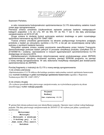 Szanowni Państwo, w celu rozszerzenia funkcjonalności opóźnieniomierza CL170 dokonaliśmy ostatnio trzech zmian jego oprogramowania. Pierwsza zmiana umożliwia Użytkownikowi wpisanie podczas badania następujących kategorii pojazdów: L1e do L7e, M1 do M3, N1 do N3, T lub C dla daty pierwszego zarejestrowania od 2010-07-28. Druga zmiana to dodanie funkcji wyliczania wartości średniego w pełni rozwiniętego opóźnienia hamowania wg ISO/TR 13487:1997. Trzecia zmiana umożliwia generowanie na ekranie podłączonego komputera podglądu protokołu z badań po odczytaniu wyników z CL170, a nie jak we wcześniejszej wersji tylko wykresu z wynikami badania hamulca. Wszystkie opisane zmiany zostały pozytywnie zweryfikowane przez Instytut Transportu Samochodowego podczas badań pełnych w procesie certyfikacji produktu (certyfikat ITS nr Z/15/056/14) i zostaną wprowadzone w nowych egzemplarzach opóźnieniomierza CL170 dostępnego od stycznia 2015. Zainteresowanym Użytkownikom dotychczasowej wersji produkowanego przez ZEPWN opóźnieniomierza oferujemy możliwość wymiany pamięci EPROM programu na pamięć z nową wersją oprogramowania. W celu dokonania modyfikacji niezbędne jest dostarczenie opóźnieniomierza do ZEPWN. Poniżej fragmenty z instrukcji do CL170 z nową wersją oprogramowania: 1) do zmiany pierwszej: „Opóźnieniomierz CL170 oblicza dla każdego pomiaru maksymalną wartość opóźnienia hamowania oraz wartość średniego w pełni rozwiniętego opóźnienia hamowania (zgodnie z Raportem Technicznym ISO/TR 13487:1997).” 2) do zmiany drugiej: „Po wyborze przedziału daty pierwszego zarejestrowania, na wyświetlaczu pojawia się ekran umożliwiający wybór rodzaju pojazdu: Pojazd: Rodzaj pojazdu: Sam.ciężarowy >3,5t W górnej linii ekranu pokazywany jest identyfikator pojazdu. Operator musi wybrać rodzaj badanego pojazdu. Dla daty pierwszego zarejestrowania do 2010-07-27 do wyboru jest jedna z poniższych możliwości: – „ Motorower ”, – „ Motocykl ”, – „ Motocykl z wózkiem ”, – „ 3-kołowy poj. < 1t ”, – „Sam.osob./Poj.sanit.”, – „ Autobus ”, – „Sam.ciężarowy <3,5t ”, – „Sam.ciężarowy >3,5t ”, – „Inny pojazd samoch. ”, – „ Ciągnik rolniczy ”. Dla daty pierwszego zarejestrowania od 2010-07-28 do wyboru jest jedna z poniższych możliwości: – – – – – – – – – – – – – – „ Kategoria L1e „ Kategoria L2e „ Kategoria L3e „ Kategoria L4e „ Kategoria L5e „ Kategoria L6e „ Kategoria L7e „ Kategoria M1 „ Kategoria M2 „ Kategoria M3 „ Kategoria N1 „ Kategoria N2 „ Kategoria N3 „ Kategoria T lub C ”, ”, ”, ”, ”, ”, ”, ”, ”, ”, ”, ”, ”, ”. 3) do zmiany trzeciej: Okno dialogowe o tytule „Wyświetlanie protokołu [XXXXXXXX]” (XXXXXXXX to identyfikator pojazdu) umożliwia przeglądanie i drukowanie zawartości protokołu pomiaru opóźnienia hamowania. Okno zawiera pole wyświetlające podgląd wydruku wybranej strony protokołu pomiaru opóźnienia hamowania.