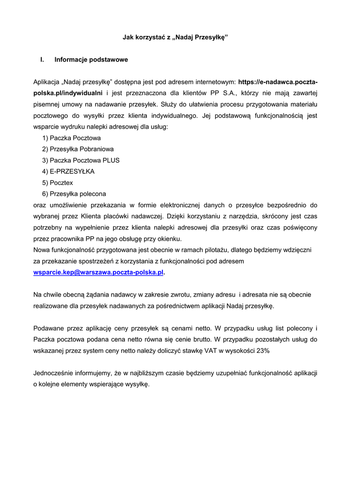 Jak korzystać z „Nadaj Przesyłkę” I. Informacje podstawowe Aplikacja „Nadaj przesyłkę” dostępna jest pod adresem internetowym: https://e-nadawca.pocztapolska.pl/indywidualni i jest przeznaczona dla klientów PP S.A., którzy nie mają zawartej pisemnej umowy na nadawanie przesyłek. Służy do ułatwienia procesu przygotowania materiału pocztowego do wysyłki przez klienta indywidualnego. Jej podstawową funkcjonalnością jest wsparcie wydruku nalepki adresowej dla usług: 1) Paczka Pocztowa 2) Przesyłka Pobraniowa 3) Paczka Pocztowa PLUS 4) E-PRZESYŁKA 5) Pocztex 6) Przesyłka polecona oraz umożliwienie przekazania w formie elektronicznej danych o przesyłce bezpośrednio do wybranej przez Klienta placówki nadawczej. Dzięki korzystaniu z narzędzia, skrócony jest czas potrzebny na wypełnienie przez klienta nalepki adresowej dla przesyłki oraz czas poświęcony przez pracownika PP na jego obsługę przy okienku. Nowa funkcjonalność przygotowana jest obecnie w ramach pilotażu, dlatego będziemy wdzięczni za przekazanie spostrzeżeń z korzystania z funkcjonalności pod adresem [email protected]. Na chwile obecną żądania nadawcy w zakresie zwrotu, zmiany adresu i adresata nie są obecnie realizowane dla przesyłek nadawanych za pośrednictwem aplikacji Nadaj przesyłkę. Podawane przez aplikację ceny przesyłek są cenami netto. W przypadku usług list polecony i Paczka pocztowa podana cena netto równa się cenie brutto. W przypadku pozostałych usług do wskazanej przez system ceny netto należy doliczyć stawkę VAT w wysokości 23% Jednocześnie informujemy, że w najbliższym czasie będziemy uzupełniać funkcjonalność aplikacji o kolejne elementy wspierające wysyłkę. II. Obsługa aplikacji Po uruchomieniu programu na ekranie pojawia się okno Profil Nadawcy (Rys. 1), który należy zasilić danymi nadawcy. Wypełnienie wszystkich wymaganych pól umożliwi korzystanie z aplikacji. Wymagane pola zaznaczone są kolorem czerwonym. Rys. 1. Okno Profil nadawcy po uruchomieniu Nadaj przesyłkę Po zakończeniu wprowadzania danych konieczne jest każdorazowe wprowadzenie żądanej przez system informacji do mechanizmu „Captcha”, w celu ich potwierdzenia. -2- Rys. 2. Okno po ustawieniu Profilu nadawcy W wymaganych polach formularza należy podać dziewięć cyfr numeru telefonu w sieci operatora krajowego z tym, że w przypadku numeru telefonu w sieci telefonii stacjonarnej należy podać numer telefonu wraz z numerem kierunkowym. Po wypełnieniu wszystkich wymaganych pozycji w oknie Profil nadawcy możliwe jest przejście do zakładki Nowa przesyłka, w której możliwe jest przygotowanie przesyłki do nadania (Rys. 3). -3- Rys. 3. Okno Nowa przesyłka W celu przygotowania nalepki adresowej i wysłania informacji do PP S.A. konieczne jest wybranie rodzaju usługi (Rys. 3a) ewentualnych usług komplementarnych oraz wypełnienia danych adresata (Rys. 4). -4- Rys. 3a. Okno Nowa przesyłka -5- Rys. 4. Okno Nowa przesyłka po wybraniu usługi i uzupełnieniu wymaganych pozycji Po zakończeniu wprowadzania danych przesyłki poprzez wybór przycisku „Pobierz nalepkę & Wyślij” dokonuje się wysłanie danych do PP S.A. oraz wydruk nalepki adresowej. Operacje te poprzedzone są pojawieniem się komunikatu potwierdzającego chęć pobrania nalepki adresowej i wysłania danych do UP (Rys.5). Plik nalepki adresowej może być otwarty lub zapisany (Rys. 6) do późniejszego wydruku (Rys. 7). -6- Rys. 5. Komunikat o przekazaniu danych do UP Rys. 6. Okno pobierania pliku PDF -7- Rys. 7. Widok nalepki adresowej Po wprowadzeniu danych o przesyłce i wyborze przycisku Dalej, wprowadzona przesyłka zostaje uwidoczniona w panelu Przesyłki znajdującym się po lewej stronie okna. Przesyłki do momentu wyboru przycisku „Pobierz nalepkę & Wyślij” można dowolnie edytować. Po przekazaniu danych do UP możliwy jest wyłącznie podgląd wprowadzonej przesyłki (Rys. 8). -8- Rys. 8. Okno podglądu wprowadzonej przesyłki Po wypełnieniu wszystkich wymaganych pól i akceptacji ich zawartości Klient we własnym zakresie drukuje właściwą nalepkę adresową. Przesyłkę oraz nalepkę adresową Klient dostarcza do wskazanej przez siebie placówki pocztowej w terminie siedmiu dni, licząc od dnia dokonania wydruku nalepki adresowej. Przekroczenie terminu skutkować będzie usunięciem informacji z Nadaj Przesyłkę i brakiem możliwości nadania przesyłki przy zastosowaniu wydrukowanej nalepki adresowej. -9- III. Ogólne zasady użytkowania Klient ma obowiązek korzystania z Nadaj Przesyłkę zgodnie z powszechnie obowiązującymi przepisami prawa, w sposób nieutrudniający jej funkcjonowania, w tym poprzez użycie oprogramowań lub urządzeń niepowodujących zakłócenia pracy aplikacji lub jej uszkodzenia. Placówce pocztowej nadawczej przysługuje prawo do zmian treści nalepki adresowej w zakresie masy i opłaty przesyłki tak, aby jej treść była zgodna ze stanem faktycznym. Potwierdzeniem nadania przesyłki jest przekazanie Klientowi z Nadaj Przesyłkę raportu dziennego. Przekazanie następuje w dniu następnym po dniu nadania przesyłki drogą elektroniczną. Na żądanie Klienta, placówka pocztowa nadawcza dokonuje potwierdzenia nadania przesyłki, przy zastosowaniu odcinka nalepki adresowej. W tym celu Klient ma obowiązek dostarczyć dwa egzemplarze nalepki adresowej. Przy ponownym korzystaniu z funkcjonalności Nadaj przesyłkę system wykorzystuje mechanizm plików cookie dla ułatwienia procesu nadawania. Nieprawidłowości związane z funkcjonowaniem Nadaj Przesyłkę Klient winien przekazywać pocztą elektroniczną na adres: [email protected] W sprawach nieuregulowanych powyższymi zapisami mają zastosowanie przepisy powszechnie obowiązujące oraz regulaminy i cenniki Poczty Polskiej S.A. dotyczące usług pocztowych obsługiwanych przez funkcjonalność Nadaj przesyłkę. - 10 -