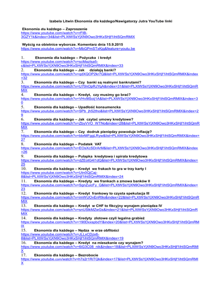 Izabela Litwin Ekonomia dla każdego/Nawigatorzy Jutra YouTube linki Ekonomia dla każdego – Zaproszenie https://www.youtube.com/watch?v=rFIB3GZY1k&index=34&list=PLXtWSsYjXN9Owo3HKxSHjf1ihtSQmRMlX Wyścig na obietnice wyborcze. Komentarz dnia 15.9.2015 https://www.youtube.com/watch?v=MbGPmSTxKjg&feature=youtu.be Ekonomia dla każdego – Pożyczka i kredyt https://www.youtube.com/watch?v=scMazIsa5c&list=PLXtWSsYjXN9Owo3HKxSHjf1ihtSQmRMlX&index=33 2. Ekonomia dla każdego – Jak działają banki? https://www.youtube.com/watch?v=qdXQOP2kr7Q&list=PLXtWSsYjXN9Owo3HKxSHjf1ihtSQmRMlX&index =32 3. Ekonomia dla każdego – Czy banki są realnymi bankrutami? https://www.youtube.com/watch?v=U70nOpRJYqA&index=31&list=PLXtWSsYjXN9Owo3HKxSHjf1ihtSQmR MlX 4. Ekonomia dla każdego – Kredyt, czy musimy go brać? https://www.youtube.com/watch?v=VHv9lSoij1A&list=PLXtWSsYjXN9Owo3HKxSHjf1ihtSQmRMlX&index=3 0 5. Ekonomia dla każdego – Upadłość konsumencka https://www.youtube.com/watch?v=SPb_jh52tho&list=PLXtWSsYjXN9Owo3HKxSHjf1ihtSQmRMlX&index=2 9 6. Ekonomia dla każdego – Jak czytać umowy kredytowe? https://www.youtube.com/watch?v=ZbyVVO_WTNo&index=28&list=PLXtWSsYjXN9Owo3HKxSHjf1ihtSQmR MlX 7. Ekonomia dla każdego – Czy dodruk pieniędzy powoduje inflację? https://www.youtube.com/watch?v=bbrMFggLRyw&list=PLXtWSsYjXN9Owo3HKxSHjf1ihtSQmRMlX&index= 27 8. Ekonomia dla każdego – Podatek VAT https://www.youtube.com/watch?v=EOsXcSDrArM&list=PLXtWSsYjXN9Owo3HKxSHjf1ihtSQmRMlX&index =26 9. Ekonomia dla każdego – Pułapka kredytowa i spirala kredytowa https://www.youtube.com/watch?v=dZEotG4l1dQ&list=PLXtWSsYjXN9Owo3HKxSHjf1ihtSQmRMlX&index= 25 10. Ekonomia dla każdego – Kredyt we frakach to gra w trzy karty I https://www.youtube.com/watch?v=Utn0QjCaj8&list=PLXtWSsYjXN9Owo3HKxSHjf1ihtSQmRMlX&index=24 11. Ekonomia dla każdego – Kredyty we frankach a zmowa banków II https://www.youtube.com/watch?v=SgnZuicFy_Q&list=PLXtWSsYjXN9Owo3HKxSHjf1ihtSQmRMlX&index= 23 12. Ekonomia dla każdego – Kredyt frankowy to czysta spekulacja III https://www.youtube.com/watch?v=imWUOvEnR9o&index=22&list=PLXtWSsYjXN9Owo3HKxSHjf1ihtSQmR MlX 13. Ekonomia dla każdego – Kredyt w CHF to fikcyjny wynajem pieniądza IV https://www.youtube.com/watch?v=snUSlkMZwGs&index=21&list=PLXtWSsYjXN9Owo3HKxSHjf1ihtSQmR MlX 14. Ekonomia dla każdego – Kredyty złotowe czyli legalna grabież https://www.youtube.com/watch?v=190DxxspbdY&index=20&list=PLXtWSsYjXN9Owo3HKxSHjf1ihtSQmRM lX 15. Ekonomia dla każdego – Nędza w erze obfitości https://www.youtube.com/watch?v=JLLxCDzx68&list=PLXtWSsYjXN9Owo3HKxSHjf1ihtSQmRMlX&index=19 16. Ekonomia dla każdego – Kredyt na mieszkanie czy wynajem? https://www.youtube.com/watch?v=6iG3C08_nik&index=18&list=PLXtWSsYjXN9Owo3HKxSHjf1ihtSQmRMl X 17. Ekonomia dla każdego – Bezrobocie https://www.youtube.com/watch?v=h7s2r1RiTQk&index=17&list=PLXtWSsYjXN9Owo3HKxSHjf1ihtSQmRMl X 1. Ekonomia dla każdego – Pieniądz lokalny https://www.youtube.com/watch?v=dUcBSIU4nA&list=PLXtWSsYjXN9Owo3HKxSHjf1ihtSQmRMlX&index=16 19. Ekonomia dla każdego – Bankowość Islamska https://www.youtube.com/watch?v=dc8zVURPNNU&list=PLXtWSsYjXN9Owo3HKxSHjf1ihtSQmRMlX&index =14 20. Ekonomia dla każdego – Jak wygrać z nieuczciwymi bankami? https://www.youtube.com/watch?v=dc8zVURPNNU&list=PLXtWSsYjXN9Owo3HKxSHjf1ihtSQmRMlX&index =14 21. Ekonomia dla każdego – Czy złoty jest walutą suwerenną? https://www.youtube.com/watch?v=tL2R7JoHhMo&index=13&list=PLXtWSsYjXN9Owo3HKxSHjf1ihtSQmR MlX 22. Ekonomia dla każdego – To my rządzimy bankami! https://www.youtube.com/watch?v=wPuqOVTecKo&index=12&list=PLXtWSsYjXN9Owo3HKxSHjf1ihtSQmR MlX 23. Ekonomia dla każdego – Krąg obfitości https://www.youtube.com/watch?v=uRhHtiRGJ4E&index=11&list=PLXtWSsYjXN9Owo3HKxSHjf1ihtSQmRM lX 24. Ekonomia dla każdego – Skąd państwo ma wziąć pieniądze? https://www.youtube.com/watch?v=A8h_HfDw6H4&index=10&list=PLXtWSsYjXN9Owo3HKxSHjf1ihtSQmR MlX 25. Ekonomia dla każdego – Co to jest pieniądz? https://www.youtube.com/watch?v=IWFpYv0pMwY&list=PLXtWSsYjXN9Owo3HKxSHjf1ihtSQmRMlX&index =9 26. Ekonomia dla każdego – Kryzys i straszak inflacji https://www.youtube.com/watch?v=oOIYGbZhxec&list=PLXtWSsYjXN9Owo3HKxSHjf1ihtSQmRMlX&index= 8 27. Ekonomia dla każdego – Wstęp do zmian https://www.youtube.com/watch?v=1SfDFRBrKck&list=PLXtWSsYjXN9Owo3HKxSHjf1ihtSQmRMlX&index= 7 28. Ekonomia dla każdego – Idea waluty równoległej https://www.youtube.com/watch?v=J2UuYaXjDM8&index=6&list=PLXtWSsYjXN9Owo3HKxSHjf1ihtSQmRMl X 29. Ekonomia dla każdego – Podstawowy dochód gwarantowany https://www.youtube.com/watch?v=SP4dV0BOGo&index=5&list=PLXtWSsYjXN9Owo3HKxSHjf1ihtSQmRMlX 30. Ekonomia dla każdego – Pytania i odpowiedzi https://www.youtube.com/watch?v=nozRBpJqzKI&list=PLXtWSsYjXN9Owo3HKxSHjf1ihtSQmRMlX&index= 4 31. Ekonomia dla każdego – Trzecia droga https://www.youtube.com/watch?v=qpp2azhu9Nw&index=3&list=PLXtWSsYjXN9Owo3HKxSHjf1ihtSQmRMl X 32. Ekonomia dla każdego – Jak zmienić podatek VAT? https://www.youtube.com/watch?v=keLSxb0OH50&index=2&list=PLXtWSsYjXN9Owo3HKxSHjf1ihtSQmRMl X 33. Ekonomia dla każdego – Podatek dochodowy, propozycje zmian https://www.youtube.com/watch?v=wDeyP6ifcrw&list=PLXtWSsYjXN9Owo3HKxSHjf1ihtSQmRMlX 34. Ekonomia dla każdego – Proste sposoby na wzbogacenie całego społeczeństwa. Skąd wziąć pieniądze w budżecie? https://www.youtube.com/watch?v=0uEt8W9OiBU 35. Ekonomia dla każdego – Czy może istnieć państwo wolne od podatków https://www.youtube.com/watch?v=7P21lO8qCqY&feature=youtu.be 36. Program gospodarczy Nawigatorów Jutra punkt 1 – Wolność finansowa dla Polaków – dwuwalutowość https://www.youtube.com/watch?v=dWPAsjrzK3E&feature=youtu.be 37. Program gospodarczy Nawigatorów Jutra punkt 2 – Wolność finansowa dla Polaków – Dywidenda narodowa bezwarunkowy dochód podstawowy https://www.youtube.com/watch?v=eue57qQaJ7I&feature=youtu.be 38. Program gosp
