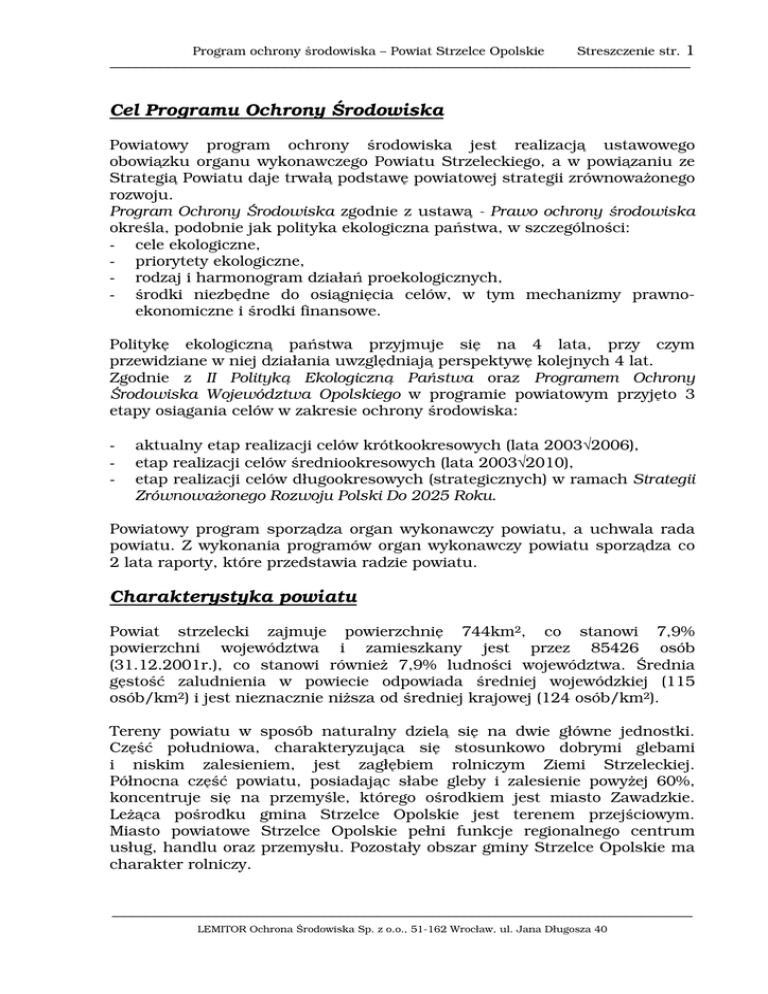 Program ochrony środowiska – Powiat Strzelce Opolskie Streszczenie str. 1 ––––––––––––––––––––––––––––––––––––––––––––––––––––––––––––––––––––––––––– Cel Programu Ochrony Środowiska Powiatowy program ochrony środowiska jest realizacją ustawowego obowiązku organu wykonawczego Powiatu Strzeleckiego, a w powiązaniu ze Strategią Powiatu daje trwałą podstawę powiatowej strategii zrównoważonego rozwoju. Program Ochrony Środowiska zgodnie z ustawą - Prawo ochrony środowiska określa, podobnie jak polityka ekologiczna państwa, w szczególności: - cele ekologiczne, - priorytety ekologiczne, - rodzaj i harmonogram działań proekologicznych, - środki niezbędne do osiągnięcia celów, w tym mechanizmy prawnoekonomiczne i środki finansowe. Politykę ekologiczną państwa przyjmuje się na 4 lata, przy czym przewidziane w niej działania uwzględniają perspektywę kolejnych 4 lat. Zgodnie z II Polityką Ekologiczną Państwa oraz Programem Ochrony Środowiska Województwa Opolskiego w programie powiatowym przyjęto 3 etapy osiągania celów w zakresie ochrony środowiska: - aktualny etap realizacji celów krótkookresowych (lata 2003÷2006), etap realizacji celów średniookresowych (lata 2003÷2010), etap realizacji celów długookresowych (strategicznych) w ramach Strategii Zrównoważonego Rozwoju Polski Do 2025 Roku. Powiatowy program sporządza organ wykonawczy powiatu, a uchwala rada powiatu. Z wykonania programów organ wykonawczy powiatu sporządza co 2 lata raporty, które przedstawia radzie powiatu. Charakterystyka powiatu Powiat strzelecki zajmuje powierzchnię 744km2, co stanowi 7,9% powierzchni województwa i zamieszkany jest przez 85426 osób (31.12.2001r.), co stanowi również 7,9% ludności województwa. Średnia gęstość zaludnienia w powiecie odpowiada średniej wojewódzkiej (115 osób/km2) i jest nieznacznie niższa od średniej krajowej (124 osób/km2). Tereny powiatu w sposób naturalny dzielą się na dwie główne jednostki. Część południowa, charakteryzująca się stosunkowo dobrymi glebami i niskim zalesieniem, jest zagłębiem rolniczym Ziemi Strzeleckiej. Północna część powiatu, posiadając słabe gleby i zalesienie powyżej 60%, koncentruje się na przemyśle, którego ośrodkiem jest miasto Zawadzkie. Leżąca pośrodku gmina Strzelce Opolskie jest terenem przejściowym. Miasto powiatowe Strzelce Opolskie pełni funkcje regionalnego centrum usług, handlu oraz przemysłu. Pozostały obszar gminy Strzelce Opolskie ma charakter rolniczy. ––––––––––––––––––––––––––––––––––––––––––––––––––––––––––––––––––––––––––– LEMITOR Ochrona Środowiska Sp. z o.o., 51-162 Wrocław, ul. Jana Długosza 40 Program ochrony środowiska – Powiat Strzelce Opolskie Streszczenie str. 2 ––––––––––––––––––––––––––––––––––––––––––––––––––––––––––––––––––––––––––– W powiecie strzeleckim użytki rolne stanowią jedynie 49% powierzchni (kraj 59%, województwo - 62%), występuje jednak duża rozbieżność pomiędzy poszczególnymi gminami - w części południowej udział terenów rolnych jest zdecydowanie większy od średniej wojewódzkiej (gmina Leśnica - 75%, gmina Ujazd - 67%), w części północnej zdecydowanie niższy (gmina Kolonowskie 20%, gmina Zawadzkie 27%). Udział lasów dla powiatu strzeleckiego wynosi średnio aż 42% powierzchni (kraj - 28%, województwo - 27%), występuje analogiczna rozbieżność pomiędzy poszczególnymi gminami - w części południowej lesistość jest mniejsza od średniej wojewódzkiej (gmina Leśnica - 16%, gmina Ujazd 24%), w części północnej jest bardzo duża (gmina Kolonowskie - 73%, gmina Zawadzkie 62%). Powiat strzelecki posiada liczne obiekty dziedzictwa kulturowego, zasługujące na szczególna ochronę. Są to zabytkowe kościoły, cmentarze oraz budowle z przylegającymi do nich założeniami parkowymi, będącymi pozostałością po pałacach i parkach dworskich wchodzących w skład majątków ziemskich. Powiat strzelecki to również obszar cenny turystycznie. Najciekawsze pod względem przyrodniczym są tereny Parku Krajobrazowego Góra Św. Anny, obejmujące kilka rezerwatów oraz monumentalny amfiteatr. Najważniejsze tereny dla celów rekreacyjnych stanowią kompleksy leśne Obszaru Chronionego Krajobrazu „Lasów Stobrawsko – Turawskich” oraz dolina rzeki Małej Panwi. W gospodarce powiatu najważniejsze miejsce pod względem generowanych miejsc pracy, jak i ilości podmiotów, zajmuje handel i usługi. Rolnictwo i przemysł zajmują zbliżone do siebie pozycje. Przemysł dominuje w rejonie centralnym i północnym, z kolei tereny południowe i zachodnie powiatu mają charakter rolniczy. Przemysł powiatu strzeleckiego skupia się praktycznie w trzech ośrodkach, jakimi są Strzelce Opolskie, Zawadzkie i Kolonowskie. Dominujące branże to przemysł cementowo - wapienniczy, hutnictwo oraz przemysł metalowy. W ostatnim okresie upadły lub zawiesiły działalność praktycznie największe obiekty przemysłowe Powiatu Strzeleckiego: Cementownia „Strzelce Opolskie” należąca do GÓRAŻDŻE CEMENT S.A., Śląskie Zakłady Przemysłu Wapienniczego OPOLWAP S.A. - Zakład „Strzelce Opolskie”, Fabryka Maszyn i Urządzeń AGROMET-PIONIER w Strzelcach Opolskich, Huta „ANDRZEJ” w Zawadzkiem, Opolskie Fabryki Mebli - Fabryka Mebli nr 3 Sp. z o.o. Strzelce Opolskie. Najistotniejszym ze względu na oddziaływanie na środowisko, funkcjonującym zakładem przemysłowych jest obecnie PACKPROFIL Sp. z o.o. Kolonowskie (oraz potencjalnie w/w zakłady, które