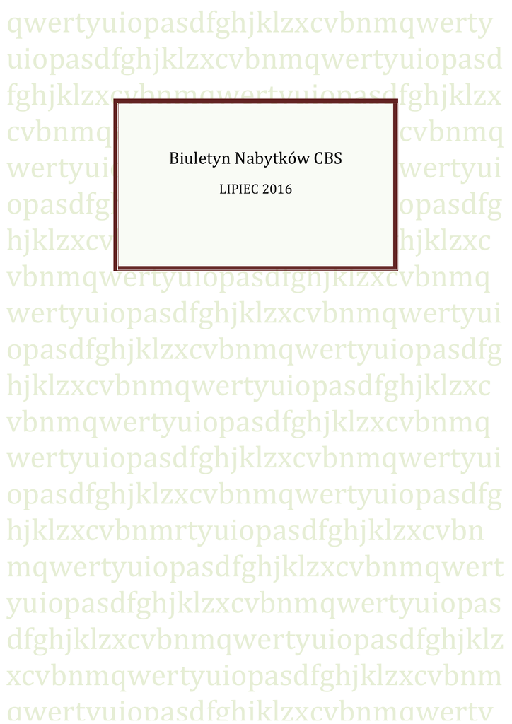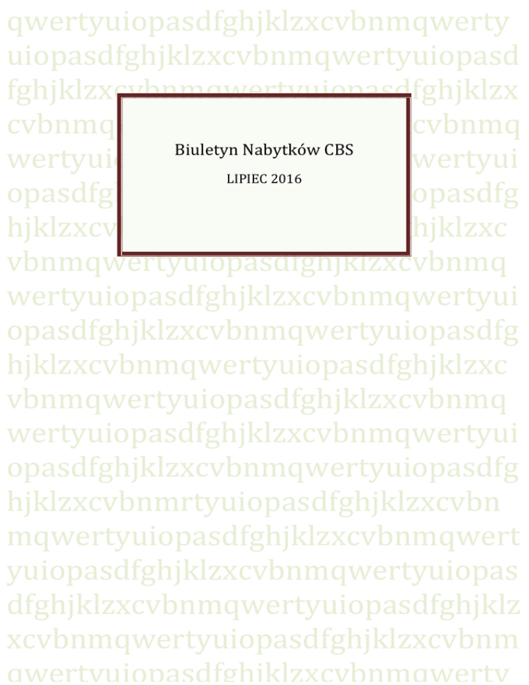 qwertyuiopasdfghjklzxcvbnmqwerty uiopasdfghjklzxcvbnmqwertyuiopasd fghjklzxcvbnmqwertyuiopasdfghjklzx cvbnmqwertyuiopasdfghjklzxcvbnmq BiuletynNabytkówCBS wertyuiopasdfghjklzxcvbnmqwertyui LIPIEC2016 opasdfghjklzxcvbnmqwertyuiopasdfg hjklzxcvbnmqwertyuiopasdfghjklzxc vbnmqwertyuiopasdfghjklzxcvbnmq wertyuiopasdfghjklzxcvbnmqwertyui opasdfghjklzxcvbnmqwertyuiopasdfg hjklzxcvbnmqwertyuiopasdfghjklzxc vbnmqwertyuiopasdfghjklzxcvbnmq wertyuiopasdfghjklzxcvbnmqwertyui opasdfghjklzxcvbnmqwertyuiopasdfg hjklzxcvbnmrtyuiopasdfghjklzxcvbn mqwertyuiopasdfghjklzxcvbnmqwert yuiopasdfghjklzxcvbnmqwertyuiopas dfghjklzxcvbnmqwertyuiopasdfghjklz xcvbnmqwertyuiopasdfghjklzxcvbnm qwertyuiopasdfghjklzxcvbnmqwerty BiuletynNabytkówCBS 1 2016 BiuletynNabytkówCBS 2016 16 Regionalnych Programów Operacyjnych : broszura informacyjna / Ministerstwo Rozwoju Regionalnego. ‐‐ Warszawa : Instytucja Koordynująca Regionalne Programy Operacyjne (IK RPO). Ministerstwo Rozwoju Regionalnego. Departament Koordynacji Programów Regionalnych, [2007]. ‐‐ 18 s. : il. ; 21 cm. ‐‐ ( Dla Rozwoju Regionów 1 ) Syg. 207595 regionalizacja polityka regionalna rozwój regionalny gospodarka terenowa program operacyjny Polska 80 lat statystyki litewskiej / Główny Urząd Statystyczny. ‐‐ Warszwa : Główny Urząd Statystyczny, 1999. ‐‐ 94, [6] s. : il. ; 21 cm. Syg. 207609 statystyka urzędowa Litwa Absencja chorobowa w 2015 roku / [opracowanie Ewa Karczewicz, Agnieszka Sikora] ; Zakład Ubezpieczeń Społecznych. Departament Statystyki i Prognoz Aktuarialnych. ‐‐ Warszawa : Zakład Ubezpieczeń Społecznych, 2016. ‐‐ 147 s. : il. kolor. ; 25 cm. Syg. 207636 praca absencja choroba niezdolność do pracy koszty społeczne dane statystyczne Polska Administracja publiczna : stan i kierunki zmian / [oprac. i red. naukowa: Jan Mujżel, Jerzy Osiatyński, Elżbieta Mączyńska]. ‐‐ Warszawa : Rada Strategii Społeczno‐Gospodarczej przy Radzie Ministrów, 2005. ‐‐ 411, [1] s. ; 21 cm. ‐‐ ( Raport ‐ Rada Strategii Społeczno‐ Gospodarczej przy Radzie Ministrów, 1233‐5711 ; nr 31 ) Syg. 207466 administracja publiczna instytucja publiczna polityka rządowa konferencja Agencje Unii Europejskiej : [informator] / pod red. Andrzeja Dumały. ‐‐ Warszawa : Urząd Komitetu Integracji Europejskiej, 2002.‐ 269 s. : il. ; 24 cm.‐ ( Biblioteka Europejska 22 ) 2 BiuletynNabytkówCBS 2016 Syg. 137724 ,206304 ,207425 organy i agencje WE Cedefob Europejska Agencja Ochrony Środowiska Europejska Agencja ds. Leków Europejska Fundacja Szkoleniowa Europejskie Centrum ds. Narkotyków i Uzależnień od Narkotyków Europejska Agencja Bezpieczeństwa i Higieny Pracy Europejskie Centrum ds. Rasizmu i Ksenofobii Europejska Fundacja Poprawy Warunków Życia i Pracy Urząd Harmonizacji Rynku Wewnętrznego Wspólnotowy Urząd Odmian Roślin Centrum Tłumaczeń dla Organów Unii Europejskiej Europejska Agencja Odbudowy Europejski Urząd Bezpieczeństwa Żywności wydawnictwo informacyjne Czapiński, Janusz (1951‐ ). Aktywność społeczna osób starszych w kontekście percepcji Polaków : diagnoza społeczna 2013 : raport tematyczny / aut.: Janusz Czapiński, Piotr Błędowski. ‐‐ Warszawa : Ministerstwo Pracy i Polityki Społecznej Centrum Rozwoju Zasobów Ludzkich, 2014. ‐‐ 100 s. ; : il. kolor. ; 30 cm + CD‐ROM Syg. 202802, 207149, 207484 osoba starsza działalność społeczna sprawozdanie Polska Slany, Krystyna. Alternatywne formy życia małżeńsko‐rodzinnego w ponowoczesnym świecie / Krystyna Slany. ‐‐ Kraków : Nomos, 2002. ‐‐ 281 s. : wykr. ; 21 cm. Syg. 207562 rodzina rola rodziny małżeństwo jakość życia Analiza kosztów i korzyści projektów inwestycyjnych: przewodnik : (Fundusz Strukturalny‐ EFRR, Fundusz Spójności i ISPA) / dokument opracowany przez: Jednostkę ds. Ewaluacji Dyrekcja Generalna ‐ Polityka Regionalna Komisja Europejska. ‐‐ Warszawa : Ministerstwo Gospodarki, Pracy i Polityki Społecznej, 2003. Syg. 207610 projekt inwestycyjny 3 BiuletynNabytkówCBS 2016 analiza kosztów Europejski Fundusz Inwestycyjny Europejski Fundusz Rozwoju przewodnik Barczyk, Ryszard (1954‐ ). Analiza porównawcza kształtowania się wybranych wskaźników jakościowych i ilościowych oszacowanych dla polskiego przemysłu przetwórczego w latach 1988‐1991 / Ryszard Barczyk, Małgorzata Kokocińska, Wiesława Przybylska‐Kapuścińska ; Zakład Badań Statystyczno‐Ekonomicznych Głównego Urzędu Statystycznego i Polskiej Akademii Nauk, Pracownia Analiz Gospodarczych Akademii Ekonomicznej w Poznaniu. ‐ Warszawa : GUS. ZBSE, 1992. ‐‐ 35, [1] s. : il. ; 29 cm. ‐‐ ( Z Prac Zakładu Badań Statystyczno‐ Ekonomicznych z. 202 ) Syg. 116463‐ 116465 przemysł przetwórczy Polska statystyka gospodarcza metoda statystyczna wahania cykliczne Panek, Tomasz (1953‐ ). Analiza poziomu i struktury zaspokojenia wybranych grup potrzeb gospodarstw domowych / Tomasz Panek ; Zakład Badań Statystyczno‐Ekonomicznych Głównego Urzędu Statystycznego i Polskiej Akademii Nauk. ‐‐ Warszawa : ZBSE GUS i PAN, 1991. ‐‐ 118 s. ; 30 cm. ‐‐ (Z Prac Zakładu Badań Statystyczno‐Ekonomicznych. Studia i Materiały z. 38 ) Syg. 115529‐ 115531 gospodarstwo domowe poziom życia budżet rodzinny potrzeby mieszkaniowe analiza statystyczna Śliwa, Tadeusz. Analiza procesu dekapitalizacji środków trwałych w przemyśle na bazie teorii odnowy / Tadeusz Śliwa. ‐‐ Warszawa : Główny Urząd Statytstyczny. Zakład Badań Statystyczno‐ Ekonomicznych, 1991. ‐‐ 79, [1] s. : il. ; 30 cm. ‐‐ ( Z Prac Zakładu Badań Statystyczno‐ Ekonomicznych, 0208‐9734 ; z. 192 ) Syg. 115566 ‐115568 dobra kapitałowe majątek trwały przemysł analiza statystyczna 4 BiuletynNabytkówCBS Draper, Norman Richard (1931‐ ). [Applied regression analysis(pol.)] Analiza regresji stosowana / N. R. Draper, H. Smith ; [z jęz. ang. tł. Andrzej Markowski i Edward Zaborowski]. ‐‐ W