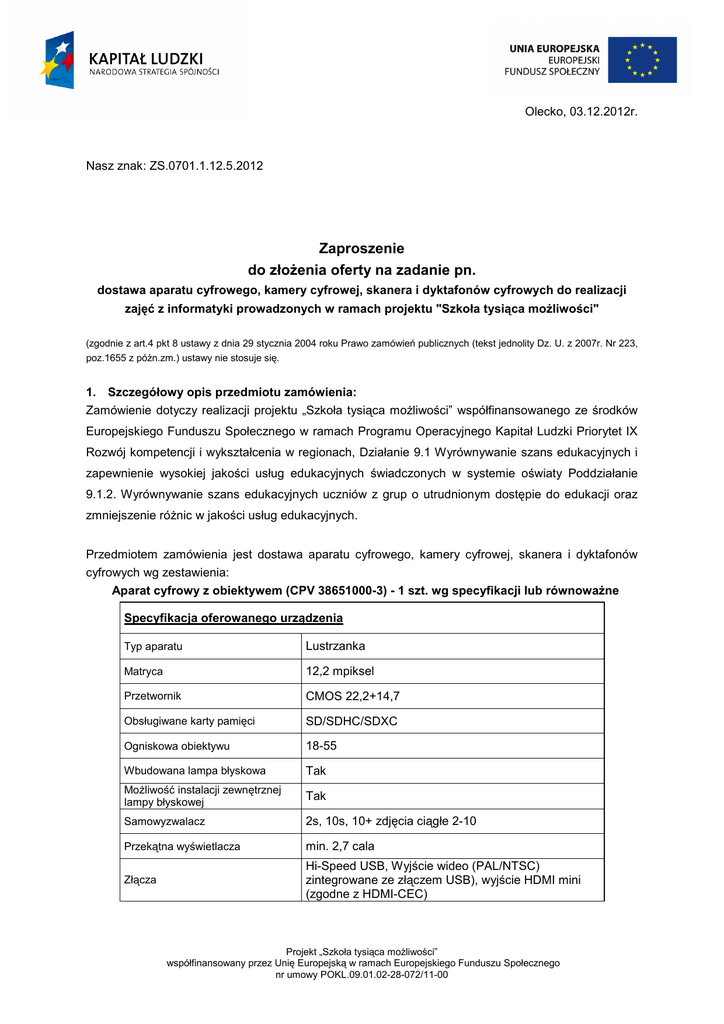Olecko, 03.12.2012r. Nasz znak: ZS.0701.1.12.5.2012 Zaproszenie do złoŜenia oferty na zadanie pn. dostawa aparatu cyfrowego, kamery cyfrowej, skanera i dyktafonów cyfrowych do realizacji zajęć z informatyki prowadzonych w ramach projektu "Szkoła tysiąca moŜliwości" (zgodnie z art.4 pkt 8 ustawy z dnia 29 stycznia 2004 roku Prawo zamówień publicznych (tekst jednolity Dz. U. z 2007r. Nr 223, poz.1655 z późn.zm.) ustawy nie stosuje się. 1. Szczegółowy opis przedmiotu zamówienia: Zamówienie dotyczy realizacji projektu „Szkoła tysiąca moŜliwości” współfinansowanego ze środków Europejskiego Funduszu Społecznego w ramach Programu Operacyjnego Kapitał Ludzki Priorytet IX Rozwój kompetencji i wykształcenia w regionach, Działanie 9.1 Wyrównywanie szans edukacyjnych i zapewnienie wysokiej jakości usług edukacyjnych świadczonych w systemie oświaty Poddziałanie 9.1.2. Wyrównywanie szans edukacyjnych uczniów z grup o utrudnionym dostępie do edukacji oraz zmniejszenie róŜnic w jakości usług edukacyjnych. Przedmiotem zamówienia jest dostawa aparatu cyfrowego, kamery cyfrowej, skanera i dyktafonów cyfrowych wg zestawienia: Aparat cyfrowy z obiektywem (CPV 38651000-3) - 1 szt. wg specyfikacji lub równowaŜne Specyfikacja oferowanego urządzenia Typ aparatu Lustrzanka Matryca 12,2 mpiksel Przetwornik CMOS 22,2+14,7 Obsługiwane karty pamięci SD/SDHC/SDXC Ogniskowa obiektywu 18-55 Wbudowana lampa błyskowa Tak MoŜliwość instalacji zewnętrznej lampy błyskowej Tak Samowyzwalacz 2s, 10s, 10+ zdjęcia ciągłe 2-10 Przekątna wyświetlacza min. 2,7 cala Złącza Hi-Speed USB, Wyjście wideo (PAL/NTSC) zintegrowane ze złączem USB), wyjście HDMI mini (zgodne z HDMI-CEC) Projekt „Szkoła tysiąca moŜliwości” współfinansowany przez Unię Europejską w ramach Europejskiego Funduszu Społecznego nr umowy POKL.09.01.02-28-072/11-00 Kamera cyfrowa (CPV 38651600-9) - 1 szt. wg specyfikacji lub równowaŜne Specyfikacja oferowanego urządzenia Zapis Standard Video (SD) Tak Zapis High Definition (HD 1080i) Tak Rodzaj nośnika SDXC/SDHC/SD Obiektyw Przetwornik Jasność F1.2 oraz matryca CMOS z tylnym podświetleniem CMOS 1/4.1 - calowa matryca CMOS z tylnym podświetleniem , rozdzielczość 3.32 Megapikseli MoŜliwość instalacji zewnętrznej lampy błyskowej Tak Zoom optyczny 27x Zoom cyfrowy 200x Stabilizator obrazu Tak Tryb nagrywania AVCHD (UXP/XP/SP/EP), Standard Definition (SSW/SEW) Tryb nocny Tak Wyświetlacz LCD Min. 3 cale Wyjście HDMI Tak Port USB 2.0 Tak Wbudowana lampa błyskowa Tak Wbudowana lampa video Tak Skaner (CPV 30216110-0) - 1 szt. wg specyfikacji lub równowaŜne Specyfikacja oferowanego urządzenia Interfejs USB 2.0 Typ skanera Płaski Maks. format skanowania A4 Obszar skanowania 216x297 mm Szybkość skanowania max. formatu Rozdzielczość dla podanej prędkości 2,5s. 300 Typ sensora Cis Źródło światła LED Przystawka do slajdów/negatywów Tak Rozdzielczość interpolowa 25-19 200 dpi Rozdzielczość optyczna 4800x9600 dpi Projekt „Szkoła tysiąca moŜliwości” współfinansowany przez Unię Europejską w ramach Europejskiego Funduszu Społecznego nr umowy POKL.09.01.02-28-072/11-00 Głębia szrości/głębia koloru 48bit Dołączone oprogramowanie Programy ScanGear, MP Navigator EX, ArcSoft PhotoStudio Dyktafon cyfrowy (CPV 32342450-1) - 3 szt. wg specyfikacji lub równowaŜne Specyfikacja oferowanego urządzenia Wewnętrzna pamięć Min. 4GB MoŜliwość podłączenia do komputera Tak Wbudowany mikrofon Stereofoniczny Format zapisu Linear PCM / mp3 Format odtwarzania mp3 / AAC / WMA / WAV Wyjście słuchawkowe Tak Port USB Tak Nagrywanie sterowane głosem (VOR) Tak Monitor nagrania Tak Cyfrowa regulacja prędkości odtwarzania Tak Technologia Noise Cut Tak Funkcja cyfrowego uwydatniania głosów (Digital Voice Up) Tak Ładowanie przez interfejs USB Tak Oprogramowanie komputerowe (Sound Organizer / CD-ROM) Tak Słuchawki stereofoniczne Tak Pokrowiec Tak Przewód USB Tak Tłumik zakłóceń Tak Funkcje edycyjne Korektor Tak Znaczniki utworów Tak Dzielenie Tak 2. Wymagany termin realizacji zamówienia: do 20.12.2012 r. dostarczenie zamówionego sprzętu wraz z oprogramowaniem. 3. Przy wyborze oferty zamawiający będzie się kierował kryterium: cena - 100 % Oferta oceniana będzie całościowo. Nie dopuszcza się ofert częściowych Projekt „Szkoła tysiąca moŜliwości” współfinansowany przez Unię Europejską w ramach Europejskiego Funduszu Społecznego nr umowy POKL.09.01.02-28-072/11-00 4. Opis sposobu przygotowania oferty: a) naleŜy ją złoŜyć na załączonym formularzu, b) ceny w niej podane mają być wyraŜone cyfrowo i słownie, c) ma być napisana w języku polskim, czytelną i trwałą techniką, bez skreśleń, d) moŜe obejmować część zamówienia. 5. Miejsce i termin złoŜenia oferty: Ofertę naleŜy złoŜyć w terminie do dnia 10.12.2012 r. do godziny 12.00, w siedzibie zamawiającego tj. w Zespole Szkół w Olecku, pokój Nr 9. Przyjmuje się równieŜ oferty złoŜone faxem, pod nr 87 523 91 00 oraz e-mail [email protected] 6. Miejsce i termin oceny złoŜonych ofert: Ocena złoŜonych ofert nastąpi w dniu 10.12.2012 r. po godzinie 15.00 w siedzibie zamawiającego, tj. w Zespole Szkół w Olecku, pokój Nr 9A. 7. Osobami uprawnionymi do udzielania informacji w niniejszej sprawie są: Sylwia Wieloch, tel. 509 667 897 8. Informacje dotyczące zawarcia umowy (zlecenia): Niezwłocznie po wyborze najkorzystniejszej oferty z wybranym podmiotem zostanie zawarta umowa na realizację zamówienia określonego w pkt 1. W załączeniu: druk propozycji cenowej. Zamawiający zastrzega sobie prawo do podjęcia negocjacji przed podpisaniem umowy. Prowadzący postępowanie: Zatwierdził: Anna Mitin Stanisław Kopycki Kierownik projektu Dyrektor Zespołu Szkół w Olecku Sylwia Wieloch Ekspert ds. finansowych Projekt „Szkoła tysiąca moŜliwości” współfinansowany przez Unię Europejską w ramac