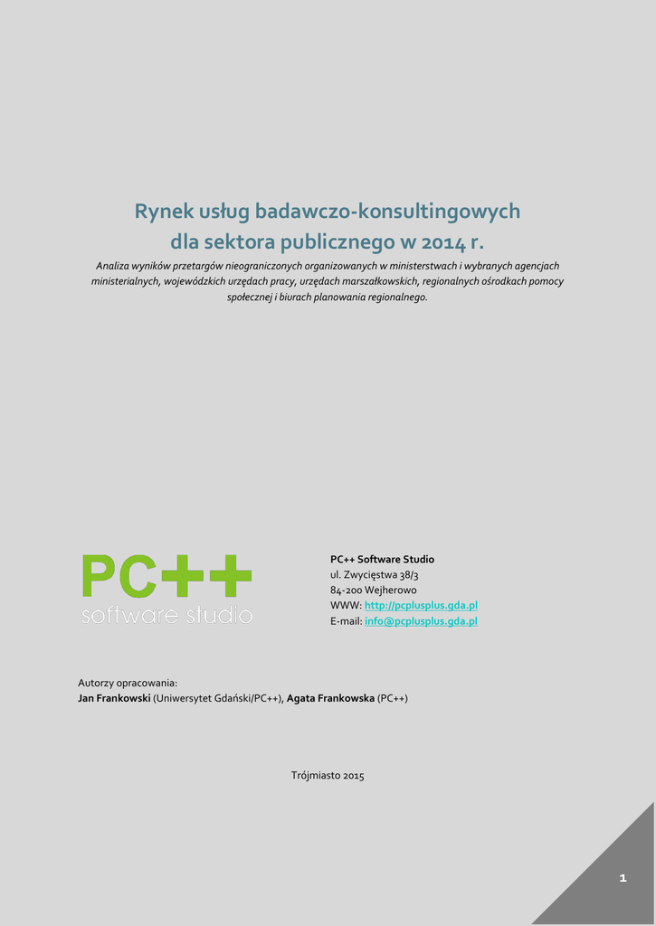 Rynek usług badawczo-konsultingowych dla sektora publicznego w 2014 r. Analiza wyników przetargów nieograniczonych organizowanych w ministerstwach i wybranych agencjach ministerialnych, wojewódzkich urzędach pracy, urzędach marszałkowskich, regionalnych ośrodkach pomocy społecznej i biurach planowania regionalnego. PC++ Software Studio ul. Zwycięstwa 38/3 84-200 Wejherowo WWW: http://pcplusplus.gda.pl E-mail: [email protected] Autorzy opracowania: Jan Frankowski (Uniwersytet Gdański/PC++), Agata Frankowska (PC++) Trójmiasto 2015 1 Streszczenie Rynek usług badawczo-konsultingowych dla sektora publicznego w 2014 r. jest pierwszym raportem, który przedstawia tę branżę przy wykorzystaniu dokumentacji przetargów nieograniczonych. Zakres podmiotowy raportu obejmuje wszystkie ministerstwa, wybrane agencje i instytucje rządowe, urzędy marszałkowskie, regionalne ośrodki pomocy społecznej, wojewódzkie urzędy pracy i biura planowania regionalnego, których Biuletyny Informacji Publicznej monitorowano w 2014 r. W badaniu uwzględniono wszystkie usługi wymagające działań nierutynowych, związane ze zbiorem, analizą lub syntezą danych. Analiza nie obejmuje instytucji zdrowotnych oraz instytucji otoczenia biznesu, ze względu na ich bardzo duże zróżnicowanie regionalne. Badana próba wyniosła 305 przetargów, z czego w 2014 r. udało się rozstrzygnąć jedynie 282, zaś jedynie dla 261 udało się wydobyć kompletne wyniki o startujących firmach. Pamiętając o przyjętych ograniczeniach, wartość rynku usług dla instytucji krajowych i regionalnych wyniosła 37,4 miliona zł, zaś mediana wartości pojedynczego badania 73,1 tys. zł. Dominowały usługi związane z przedsiębiorczością, rynkiem pracy, wykluczeniem społecznym i edukacją, przy czym dla edukacji były to zlecenia najbardziej lukratywne. Największą liczbę usług zleciły urzędy marszałkowskie, następnie instytucje ministerialne, ministerstwa i urzędy pracy. Porównując strukturę zamawiających przez pryzmat wartości zamówień, najwięcej zlecały instytucje rządowe (13,4 mln zł), przeważając nad urzędami marszałkowskimi (12,3 mln zł), Mocno rzutowało to na rozkład geograficzny. Warszawskie instytucje zleciły 95 usług (36% wszystkich zlecanych usług) o łącznej wartości 22,2 mln zł (aż 59% udziału całości rynku). Rynek badawczo-konsultingowy w 2014 r. cechował się raczej umiarkowaną konkurencją. W przetargach nieograniczonych przeciętnie brało udział od 4 do 5 firm. Pozytywnym zjawiskiem było coraz częstsze uwzględnianie kryteriów merytorycznych w ocenie ofert (ponad 60% przetargów). Niestety, nadal istniały pewne obszary polityk publicznych, dla których bardzo rzadko stosowano kryteria inne niż cena. Patrząc przez pryzmat terminów składania ofert, rynek należy określić jako delikatnie sezonowy. Między lutym a kwietniem firmy najbardziej intensywnie „walczyły” o zamówienia, które w największej liczbie pojawiły się w II kwartale roku. Może to wskazywać na pewną zależność podaży usług od decyzji politycznych (przygotowania do perspektywy 2014-2020), jak i powszechnych zwyczajów pracy instytucji publicznych (miesiące wakacyjne oraz grudzień są mniej intensywne). W 2014 r. jedynie 124 firmy realizowały przynajmniej jedną usługę badawczo-konsultingową w trybie przetargu nieograniczonego. Rynek ten można podzielić na cztery dość rozłączne segmenty: usługi konsultingowo-badawcze dedykowane ocenie interwencji publicznej, badania rynkowe (posiadające największy udział), a także konsulting o charakterze typowo środowiskowym lub infrastrukturalnym, który niniejsze opracowanie obejmuje jedynie częściowo. W przypadku polskich firm badawczo-konsultingowych trudno mówić o specjalizacji – to rynek zazwyczaj dyktował rodzaj zleceń. Największy udział w nim (ponad 5%) miały firmy PBS, WYG PSDB oraz Millward/Brown, przy czym przychody ze startów w konsorcjach podzielono proporcjonalnie do liczby ich członków. Firmy cechowały się różną aktywnością składania ofert. Wśród tych, które zdobyły 3 zlecenia lub więcej istniała grupa podmiotów bardzo aktywnych, potrafiących wysłać średnio jedną ofertę w tygodniu. Zazwyczaj osiągały one jednak dość niski wskaźnik sukcesu. Więcej niż co druga złożona oferta kończyła się zleceniem w przypadku Zachodniopomorskiej Pracowni Doradczej, firmy Geoprofit oraz PAG Uniconsult. Dwie ostatnie firmy wraz z WYG PSDB stanowiły także istotne węzły „usieciowienia branży”, które zmierzono liczbą startów w konsorcjach z innymi firmami. Pomimo intensywnego sieciowania szczególnie firm ewaluacyjnych, w 2014 r. nie pojawiło się zbyt wiele nowych podmiotów na rynku. Być może podwyższenie obowiązkowego progu przetargów nieograniczonych do 30.000 EUR nieco „urozmaici” rynek, choć prawdopodobnym scenariuszem jest silniejsza współpraca firm o stabilnej pozycji przy utrzymaniu się relatywnie niewielkiej konkurencji. W najbliższym czasie liczba i wartość zlecanych usług badawczych prawdopodobnie się zwiększy – ze względu na rozpoczęcie perspektywy 2014-2020, jak też coraz większe potrzeby informacyjne urzędów. Nie jest też wykluczone, że nastąpi lekka reorientacja wykonawców na miasta wojewódzkie, które ze względu na zintegrowane inwestycje terytorialne chętniej zlecały usługi doradcze. Niestety, negatywnym zjawiskiem dla całego rynku jest coraz mniejsza transparentność informacji o kosztach zlecanych usług – stąd też, gdyby nie portale egospodarka.pl oraz money.pl, publikujące te informacje, realizacja niniejszego opracowania byłaby niemożliwa. 2 Executive Summary Research and consulting services for the public sector market in 2014 is the first report that presents research and consulting area using open tenders documentation. Thematic scope of the study includes ministries, selected government agencies an