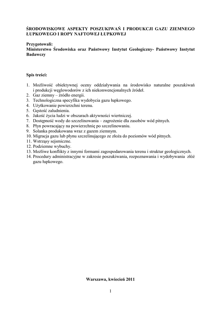 ŚRODOWISKOWE ASPEKTY POSZUKIWAŃ I PRODUKCJI GAZU ZIEMNEGO ŁUPKOWEGO I ROPY NAFTOWEJ ŁUPKOWEJ Przygotowali: Ministerstwo Środowiska oraz Państwowy Instytut Geologiczny- Państwowy Instytut Badawczy Spis treści: 1. MoŜliwość obiektywnej oceny oddziaływania na środowisko naturalne poszukiwań i produkcji węglowodorów z ich niekonwencjonalnych źródeł. 2. Gaz ziemny – źródło energii. 3. Technologiczna specyfika wydobycia gazu łupkowego. 4. UŜytkowanie powierzchni terenu. 5. Gęstość zaludnienia. 6. Jakość Ŝycia ludzi w obszarach aktywności wiertniczej. 7. Dostępność wody do szczelinowania – zagroŜenie dla zasobów wód pitnych. 8. Płyn powracający na powierzchnię po szczelinowaniu. 9. Solanka produkowana wraz z gazem ziemnym. 10. Migracja gazu lub płynu szczelinującego ze złoŜa do poziomów wód pitnych. 11. Wstrząsy sejsmiczne. 12. Podziemne wybuchy. 13. MoŜliwe konflikty z innymi formami zagospodarowania terenu i struktur geologicznych. 14. Procedury administracyjne w zakresie poszukiwania, rozpoznawania i wydobywania złóŜ gazu łupkowego. Warszawa, kwiecień 2011 1 1. MoŜliwość obiektywnej oceny oddziaływania na środowisko naturalne poszukiwań i produkcji węglowodorów z ich niekonwencjonalnych źródeł Specyfikę europejskiej perspektywy na zagadnienia związane z poszukiwaniami i wydobyciem gazu łupkowego stanowi to, Ŝe brak jest do dziś na naszym kontynencie doświadczenia w tym zakresie, a przez to wszelkie oceny oddziaływania na środowisko muszą być prowadzone w odniesieniu do poszczególnych przypadków basenów amerykańskich i kanadyjskich. Krótka historia tego typu prac poszukiwawczych w Europie powoduje, Ŝe wciąŜ brak jeszcze na Starym Kontynencie odpowiedniej ilości doświadczonych i kompetentnych zespołów eksperckich. Zrozumienie wpływu procesu technologicznego związanego z wydobyciem węglowodorów z niekonwencjonalnych złóŜ na środowisko naturalne wymaga bowiem, oprócz odpowiedniej ekspertyzy ekologicznej, równieŜ znajomości tego zagadnienia z praktycznej perspektywy wiertników, inŜynierów złoŜowych, geochemików, geofizyków itd. Bardzo istotny w europejskich realiach jest brak moŜliwość analizy rzeczywistych, lokalnych przypadków. Nieomal wszystkie naturalne poligony badawcze dostępne do dziś znajdują się w USA i Kanadzie. W Europie jedynie Polska i Niemcy mają w tym zakresie wstępne doświadczenia, przy czym w Polsce poszukiwania rozwijają się zdecydowanie najszybciej. W ciągu ostatnich kilkunastu miesięcy wywiercono w Polsce juŜ blisko 8 otworów poszukiwawczych za niekonwencjonalnymi złoŜami gazu (5 za gazem łupkowym oraz 3 za gazem zamkniętym), a w ciągu najbliŜszych 3-4 lat ich liczba moŜe zbliŜy się do 100. W przypadku Europy fakt, Ŝe jest to zagadnienie nowe i nie obudowane jeszcze w pełni doświadczeniem środowisk eksperckich, naukowych, decydenckich i politycznych powoduje zagroŜenie tym, Ŝe rozpoczynająca dyskusja moŜe obecnie być prowadzona w sposób nie w pełni obiektywny. Obecnie obserwuje się specyficzną sytuację, gdzie źródłem większości technicznych informacji dla publicznej debaty o efektach około 10-letniej eksploatacji gazu łupkowego w Północnej Ameryce są dwie wzajemnie odmiennie umotywowane grupy podmiotów. Z jednej strony jest przemysł naftowy, bazujący na swoich doświadczeniach, który jednak nie moŜe być w tym przypadku traktowany jako obiektywny. Z drugiej zaś strony aktywnym źródłem informacji stanowiących przeciwwagę w dyskusji są dotychczasowi główni dostawcy konwencjonalnego gazu, którzy zaniepokojeni moŜliwością tworzenia się alternatywnych źródeł gazu wykorzystują czarny PR ekologiczny jako sposób na przeciwdziałanie rozwoju tego sektora energetyki. W efekcie aby uniemoŜliwić wykorzystywania środowisk ekologicznych i eksperckich z motywacji biznesowych, bądź politycznych przez którąkolwiek stronę dysputy konieczne jest rozpoczęcie programów intensywnych szkoleń, a takŜe badań w oparciu zamorskie doświadczenia. Postulaty te od kilku miesięcy są juŜ intensywnie realizowane w Polsce. 2. Gaz ziemny – źródło energii Gaz ziemny (głównie metan) jest najczystszym ekologicznie źródłem energii spośród paliw kopalnych. Cechuje się w szczególności niską emisją gazów cieplarnianych (por. z węglem kamiennym i brunatnym, ropą naftową), a takŜe brakiem niebezpiecznych odpadów (por. energia jądrowa). Z tego powodu w przypadku krajów takich jak Polska, których zapotrzebowanie na energię zaspakajane jest przez węgiel kamienny i brunatny, gaz ziemny jest atrakcyjną ekologicznie alternatywą. Dla krajów pozbawionych konwencjonalnych złóŜ gazu warunkiem wykorzystania gazu jako alternatywnego, czystego źródła energii, jest jednakŜe dostępność nowych, a jednocześnie długoterminowo przewidywalnych i wiarygodnych źródeł gazu. W przypadku Polski źródłem gazu ziemnego, potencjalnie umoŜliwiającym ograniczenie emisji gazów cieplarnianych pochodzących ze spalania węgla, moŜe być gaz łupkowy, w mniejszym stopniu gaz zamknięty (tight gas). 2 NaleŜy pamiętać, Ŝe niezaleŜnie od zastosowań w energetyce, gaz ziemny jest surowcem wykorzystywanym w przemyśle chemicznym. Jego całkowite zastąpienie przez np. odnawialne źródła energii, jest zatem niemoŜliwe. Emisja szkodliwych gazów przy produkcji energii z róŜnych źródeł (funty/bilion BTU). Źródło EIA, 1998. zanieczyszczenie gaz ziemny ropa naftowa węgiel dwutlenek węgla 117 000 164 000 208 000 tlenek węgla 40 33 208 tlenki azotu 92 448 457 dwutlenek siarki 0,6 1122 2591 pyły 7 84 2744 formaldehyd 0,75 0,22 0,22 rtęć 0,0 0,007 0,016 3. Technologiczna specyfika wydobycia gazu łupkowego Technologie poszukiwań i produkcji gazu łupkowego posiadają zarówno wyróŜniające je cechy szczególne, jak i cechy identyczne jak w przypadku produkcji gazu ze złóŜ konwencjonalnych. Pow
