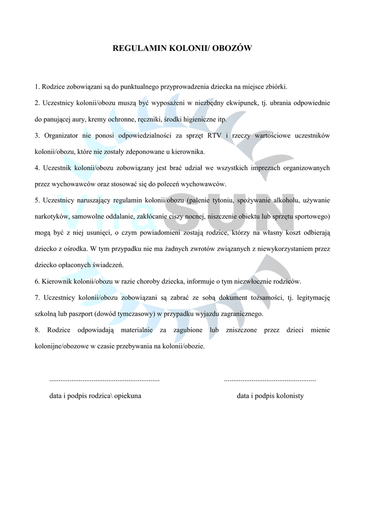 REGULAMIN KOLONII/ OBOZÓW 1. Rodzice zobowiązani są do punktualnego przyprowadzenia dziecka na miejsce zbiórki. 2. Uczestnicy kolonii/obozu muszą być wyposażeni w niezbędny ekwipunek, tj. ubrania odpowiednie do panującej aury, kremy ochronne, ręczniki, środki higieniczne itp. 3. Organizator nie ponosi odpowiedzialności za sprzęt RTV i rzeczy wartościowe uczestników kolonii/obozu, które nie zostały zdeponowane u kierownika. 4. Uczestnik kolonii/obozu zobowiązany jest brać udział we wszystkich imprezach organizowanych przez wychowawców oraz stosować się do poleceń wychowawców. 5. Uczestnicy naruszający regulamin kolonii/obozu (palenie tytoniu, spożywanie alkoholu, używanie narkotyków, samowolne oddalanie, zakłócanie ciszy nocnej, niszczenie obiektu lub sprzętu sportowego) mogą być z niej usunięci, o czym powiadomieni zostają rodzice, którzy na własny koszt odbierają dziecko z ośrodka. W tym przypadku nie ma żadnych zwrotów związanych z niewykorzystaniem przez dziecko opłaconych świadczeń. 6. Kierownik kolonii/obozu w razie choroby dziecka, informuje o tym niezwłocznie rodziców. 7. Uczestnicy kolonii/obozu zobowiązani są zabrać ze sobą dokument tożsamości, tj. legitymację szkolną lub paszport (dowód tymczasowy) w przypadku wyjazdu zagranicznego. 8. Rodzice odpowiadają materialnie za zagubione lub zniszczone przez dzieci mienie kolonijne/obozowe w czasie przebywania na kolonii/obozie. ............................................................ data i podpis rodzica\ opiekuna .................................................. data i podpis kolonisty ................................. Miejsce i data OŚWIADCZENIE My, niżej podpisani , rodzice (prawni opiekunowie) ................................................................................ur. ................................................................ Imię i nazwisko dziecka data i miejsce urodzenia zam. ........................................................................................................................................... dokładny adres wyrażamy zgodę na leczenie szpitalne lub przeprowadzenie koniecznego zabiegu operacyjnego w czasie pobytu dziecka na kolonii Podpis matki (prawnej opiekunki) ............................................................................................. Podpis ojca (prawnego opiekuna) ............................................................................................ VitaSUN BIURO TURYSTYCZNE z siedzibą w 42- 595 Siemonia, ul. Młyńska 5, NIP: 625-215-23-04, tel. 504-053-006, 533 897 483, e-mail: [email protected], ING Bank Śląski S.A. nr konta: 91 1050 1298 1000 0090 7052 8543, Biuro: 42-504 Będzin ul. Świerczewskiego 112a. LICENCJA ORGANIZATORA Marszałka Województwa Śląskiego NR 872