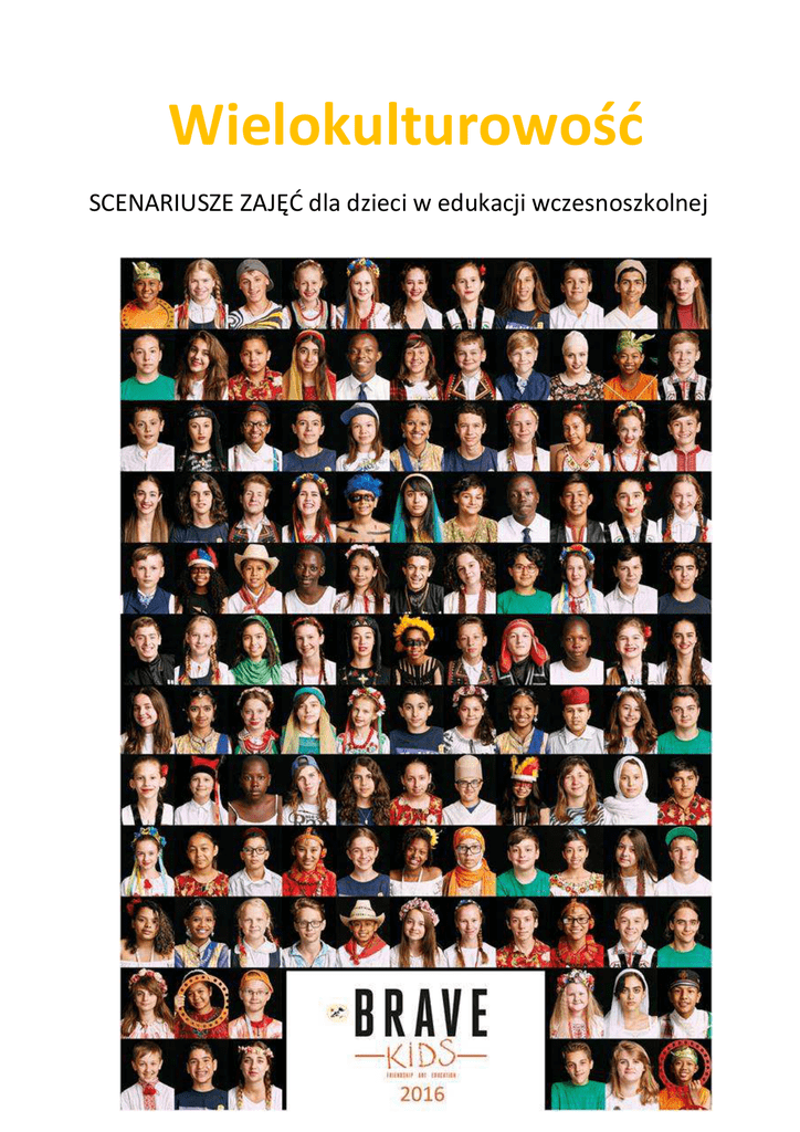 Wielokulturowość SCENARIUSZE ZAJĘĆ dla dzieci w edukacji wczesnoszkolnej Broszura "Wielokulturowość Wielokulturowość – scenariusze zajęć dla dzieci w edukacji wczesnoszkolenej wczesnoszkolenej" jest dostępna na licencji Creative Commons. Uznanie autorstwa 3.0 Polska (CC BY 3.0). Pewne prawa zastrzeżone na rzecz autorek i Stowarzyszenia Kultury Teatralnej Pieśń Kozła. Kozła Utwór powstał w ramach programu polskiej współpracy współpracy rozwojowej realizowanej za pośrednictwem MSZ RP w roku 2016. Zezwala się na dowolne wykorzystanie utworu, pod warunkiem zachowania ww. informacji, w tym informacji o stosowanej licencji, o posiadaczach praw oraz o programie polskiej współpracy rozwojowej rozwojowej. Treść licencji jest dostępna na stronie: http://creativecommons.org/licenses/by/3.0/pl. http://creativecommons.org/licenses/by/3.0/pl Publikacja wyraża wyłącznie poglądy autorek i nie może być utożsamiana z oficjalnym stanowiskiem Ministerstwa Spraw Zagranicznych RP. Autorka treści: Iwona Stankova Autorka scenariuszy: Magdalena Szymańska Konsultacje merytoryczne: Iwona Stankova Wydawca: Stowarzyszenie Kultury Teatralnej Pieśń Kozła ła Słowo wstępu Oddajemy w Wasze ręce dwa scenariusze zajęć, które powstały w ramach projektu „Akademia Dzieci Świata w gminie Oborniki Śląskie”. W przygotowaniu merytorycznym scenariuszy opierałyśmy się na kilkuletnim doświadczeniu zdobytym podczas spotkania dzieci z całego świata podczas międzykulturowego projektu artystyczno-edukacyjnego Brave Kids. Brave Kids organizowany jest w Polsce od 2009 roku. Od tego czasu gościliśmy w Polsce kilkaset dzieci z 34 różnych krajów świata, leżących na 4 kontynentach. Proponujemy dwa warsztaty, jakie możecie przeprowadzić w Waszej szkole lub innej instytucji/organizacji pracującej z dziećmi w wieku wczesnoszkolnym. Celem zajęć jest pokazanie dzieciom różnorodności świata jednocześnie budując w nich przekonanie, że ludzie na całym świecie są do siebie podobni. Mimo, że dzieci w różnych częściach naszego globu różnie się ubierają, jedzą różne potrawy, witają się na różne sposoby, to każde z nich chce być szczęśliwe, chce się śmiać, mieć przyjaciół. Warsztaty składają się z dwóch bloków, z których każdy trwa 1,5 godziny (dwie godziny lekcyjne). Podczas pierwszego bloku dzieci uczą się o różnorodności świata. Drugi blok powinien być przeprowadzony około dwa tygodnie (do miesiąca) po pierwszych zajęciach. Tym razem tematyka skupia się wokół przykładów z życia rówieśników z różnych, odległych krajów (związanych z projektem Brave Kids). Każdy z warsztatów zawiera część prezentacyjną (na której prowadzący pokazuje zdjęcia, rekwizyty) oraz z części kreatywnej (podczas której uczniowie wykonują pracę plastyczną), dzięki czemu dzieci zostają aktywnie zaangażowane w tematykę zajęć. Do wykorzystania w czasie warsztatów warto wykorzystać stworzone przez nas prezentacje Power Point, bogato ilustrowane zdjęciami oraz dostępne na youtube filmy z występami dzieci w ramach BRAVE KIDS. Brave Kids w pigułce: https://www.youtube.com/watch?v=gk4yHGZe9DM Występ finałowy: https://www.youtube.com/watch?v=LDj9SkctLgk