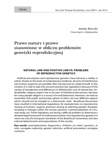 NAUKA Rocznik Teologii Katolickiej, tom XIII/1, rok 2014 Anetta Breczko Uniwersytet w Białymstoku Prawo natury i prawo stanowione w obliczu problemów genetyki reprodukcyjnej NATURAL LAW AND POSITIVE LAW VS. PROBLEMS OF REPRODUCTIVE GENETICS Artificial procreation and reproductive genetics have become a reality in which, thanks to the tools of contemporary medicine, all sorts of interference into human organism are possible. Man has become to create himself. In this context, it is vital to take into account positive law regulations because of the variety of standpoints and differences in defining the core of natural law. Undoubtedly, religious aspect has to be part of bioethical discussions, because for many people religion is a source of moral behaviour. However, we have to remember that public and private sphere of ethics are two different aspects which should not be mingled in a democratic state. Bioethical discussions have resulted in international regulations, for example bans on reproductive cloning of humans, eugenic practices aiming at selecting people, therapies resulting in changes within the human genome, commercialization of a human body, etc. Polish legislators are facing a difficult problem to determine a detailed legal framework of artificial procreation and reproductive genetics to meet not only the European standards of the Bioethical Convention, but also cultural determinants and expectations of the society. Key words: preimplantation diagnostics, children „to order”, genetics, in vitro, surrogate maternity, genetic selection, artificial procreation, surrogate contracts. 20 Nauka Anetta Breczko Wprowadzenie Bioetyka jest zafascynowana futurystycznymi wizjami „człowieka bionicznego” (homo bionicus), czy „człowieka wiecznotrwałego” (homo continuus), a zatem takiego, który ma żyć jak najdłużej i w jak najlepszej kondycji1. W niedalekiej przyszłości prognozuje się istnienie jednostki ludzkiej wręcz nieśmiertelnej: ulepszonej genetycznie, rozmnażającej się przez klonowanie, odpornej na choroby nowotworowe, korzystającej z terapii genowej, wykorzystującej potencjał komórek macierzystych do hodowli „zastępczych” tkanek i organów etc. Oczywiście część z tych wizji to ciągle sfera science fiction, ale wiele z nich stało się realnych dzięki postępowi biotechnologicznemu. Medycyna jest w stanie ziścić (przynajmniej w części) do niedawna całkowicie utopijne wyobrażenia. Pojawiają się jednak pytania: czy lekarze powinni wykorzystywać istniejące technologie i dokonywać wszelkich możliwych ingerencji na organizmie ludzkim? Czy fakt, że prognozowany cel tych działań może się okazać korzystny z perspektywy ogólnospołecznej jest wystarczającym argumentem za zasadnością ich podjęcia? Jak ustalić granice prawne eksperymentów medycznych (a w szczególności genetycznych) na człowieku? Odwieczny dylemat pomiędzy prawem natury a prawem stanowionym (między ius a lex) – w obliczu pojawiających się wraz z postępem biotechnomedycznym możliwości – nabiera nowego znaczenia. Główną przyczyną kontrowersji moralnych i prawnych staje się to, iż biotechnologia wkroczyła do „sanktuarium tajemnicy życia”, zaś człowiek przygotowuje się do przetworzenia samego siebie. Możliwy jest obecnie nowy typ ingerencji medycznych, związanych z rozwojem genetyki. W związku z tym zaciera się granica między naturą, którą jesteśmy i organicznym wyposażeniem, które sobie dajemy; pomiędzy podmiotem a przedmiotem; między czymś naturalnym a artefaktem2. Franz Kamphaus podkreśla, że dziś chodzi nie tylko o nowe techniki medyczne: (...) chodzi o prawo oraz granice projektu, nazywanego nowoczesność. Gdyż badania i technologie genetyczne – jako nauka oraz jako technologiczna realizacja zdobyczy naukowych – należą bez wątpienia do tego epokowego procesu, który najwyraźniej zmierza do punktu zwrotnego3. 1 A. Breczko, Podmiotowość prawna człowieka w warunkach postępu biotechnomedycznego, Białystok 2011, s. 84 i nast. 2 L. Ostasz, Rozumienie człowieka. Antropologia filozoficzna, Olsztyn 2003, s. 503. 3 F. Kamphaus, Boże dzieci. Rozważania o technologii genetycznej, „Tygodnik Powszechny” 2001, nr 48, s. 10. Prawo natury i prawo stanowione w obliczu problemów genetyki... 21 Piotr Morciniec wyraża opinię, że dyskusja o granicach genetyki nie ma na celu kwestionowania dobroczynnych osiągnięć tej dziedziny Nauka ludzkiej wiedzy: (...) ma natomiast uświadomić, że także epokowe osiągnięcia podpadają pod wartościowanie moralne. Nowoczesna medycyna, m.in. opierając się na postępie biologii i genetyki, otworzyła nowe możliwości diagnostyczne i terapeutyczne (...). Niewątpliwie otwarty został nowy rozdział w historii medycyny (...)4. Wydaje się, że logika postępu technicznego wymaga przyjęcia założenia, iż rozwój genetyki będzie nadal postępować. Jednocześnie wzrastać musi jej wpływ na życie jednostek i społeczeństwa5. Zważywszy na nieuchronność tego procesu powinniśmy się przygotować na eliminowanie potencjalnych zagrożeń; tak, by genetyka służyła dobru powszechnemu. Instrumentem do tego powinno stać się odpowiednio skonstruowane prawo. W regulacji spraw bioetycznych, związanych z eksperymentami medycznymi (a w szczególności genetycznymi) samo prawo natury okazuje się niewystarczające, chociaż często przywołuje się je w dyskusjach bioetycznych. Zauważyć należy, że pojęcie „prawo natury” („prawo naturalne”) jest terminem bardzo wieloznacznym. Można zaryzykować tezę, że każdy myśliciel powołujący się na to prawo (od zarania dziejów ludzkich po dzień dzisiejszy) nadawał mu własne, swoiste znaczenie. Przyjmuje się najogólniej, że prawo to ma łączyć wszystkich ludzi, bez względu na różnice kulturowe, a w szczególności religijne. Filozofia przyjęła z prawa natury „złotą regułę”, czyli nakaz, by innych 