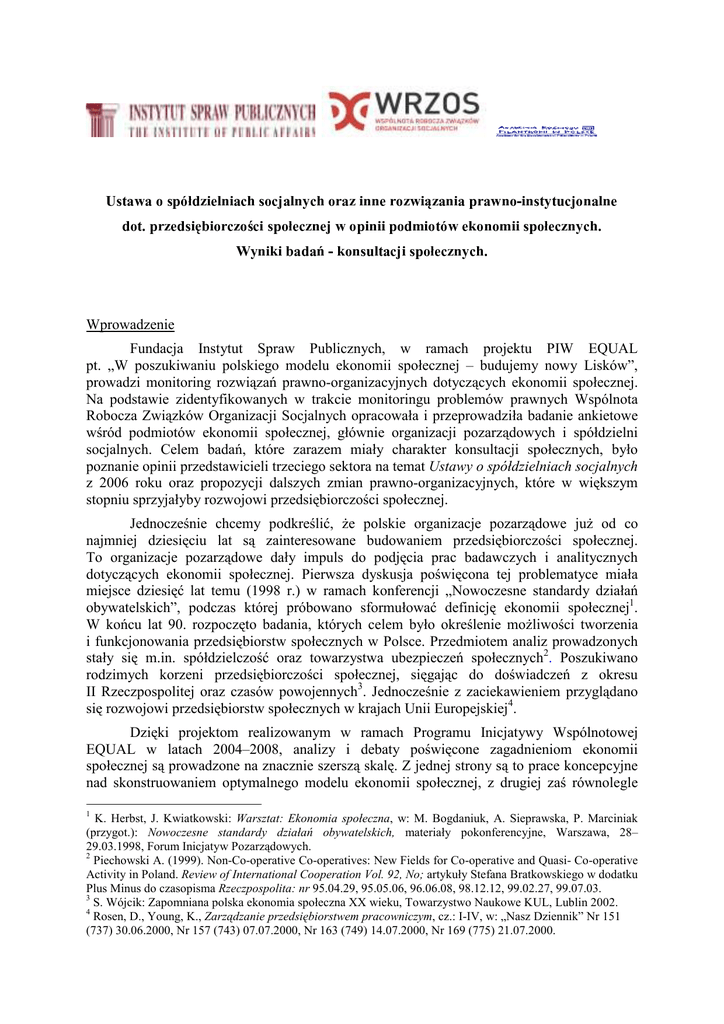 Wprowadzenie Fundacja Instytut Spraw Publicznych, w ramach projektu PIW EQUAL pt. „W poszukiwaniu polskiego modelu ekonomii społecznej – budujemy nowy Lisków”, prowadzi monitoring rozwiązań prawno-organizacyjnych dotyczących ekonomii społecznej. Na podstawie zidentyfikowanych w trakcie monitoringu problemów prawnych Wspólnota Robocza Związków Organizacji Socjalnych opracowała i przeprowadziła badanie ankietowe wśród podmiotów ekonomii społecznej, głównie organizacji pozarządowych i spółdzielni socjalnych. Celem badań, które zarazem miały charakter konsultacji społecznych, było poznanie opinii przedstawicieli trzeciego sektora na temat Ustawy o spółdzielniach socjalnych z 2006 roku oraz propozycji dalszych zmian prawno-organizacyjnych, które w większym stopniu sprzyjałyby rozwojowi przedsiębiorczości społecznej. Jednocześnie chcemy podkreślić, że polskie organizacje pozarządowe już od co najmniej dziesięciu lat są zainteresowane budowaniem przedsiębiorczości społecznej. To organizacje pozarządowe dały impuls do podjęcia prac badawczych i analitycznych dotyczących ekonomii społecznej. Pierwsza dyskusja poświęcona tej problematyce miała miejsce dziesięć lat temu (1998 r.) w ramach konferencji „Nowoczesne standardy działań obywatelskich”, podczas której próbowano sformułować definicję ekonomii społecznej1. W końcu lat 90. rozpoczęto badania, których celem było określenie możliwości tworzenia i funkcjonowania przedsiębiorstw społecznych w Polsce. Przedmiotem analiz prowadzonych stały się m.in. spółdzielczość oraz towarzystwa ubezpieczeń społecznych2. Poszukiwano rodzimych korzeni przedsiębiorczości społecznej, sięgając do doświadczeń z okresu II Rzeczpospolitej oraz czasów powojennych3. Jednocześnie z zaciekawieniem przyglądano się rozwojowi przedsiębiorstw społecznych w krajach Unii Europejskiej4. Dzięki projektom realizowanym w ramach Programu Inicjatywy Wspólnotowej EQUAL w latach 2004–2008, analizy i debaty poświęcone zagadnieniom ekonomii społecznej są prowadzone na znacznie szerszą skalę. Z jednej strony są to prace koncepcyjne nad skonstruowaniem optymalnego modelu ekonomii społecznej, z drugiej zaś równolegle 1 K. Herbst, J. Kwiatkowski: Warsztat: Ekonomia społeczna, w: M. Bogdaniuk, A. Sieprawska, P. Marciniak (przygot.): Nowoczesne standardy działań obywatelskich, materiały pokonferencyjne, Warszawa, 28– 29.03.1998, Forum Inicjatyw Pozarządowych. 2 Piechowski A. (1999). Non-Co-operative Co-operatives: New Fields for Co-operative and Quasi- Co-operative Activity in Poland. Review of International Cooperation Vol. 92, No; artykuły Stefana Bratkowskiego w dodatku Plus Minus do czasopisma Rzeczpospolita: nr 95.04.29, 95.05.06, 96.06.08, 98.12.12, 99.02.27, 99.07.03. 3 S. Wójcik: Zapomniana polska ekonomia społeczna XX wieku, Towarzystwo Naukowe KUL, Lublin 2002. 4 Rosen, D., Young, K., Zarządzanie przedsiębiorstwem pracowniczym, cz.: I-IV, w: „Nasz Dziennik” Nr 151 (737) 30.06.2000, Nr 157 (743) 07.07.2000, Nr 163 (749) 14.07.2000, Nr 169 (775) 21.07.2000. toczą się prace legislacyjne, które zmierzają do stworzenia prawnych podstaw rozwoju przedsiębiorczości społecznej. Obok organizacji pozarządowych uczestniczą w nich przedstawiciele administracji publicznej, a zwłaszcza samorządu terytorialnego oraz lokalnego biznesu. Metodologia badań dot. rozwiązań prawno-organizacyjnych regulujących rozwój przedsiębiorczości społecznej Badania realizowano od czerwca do września 2007 roku za pomocą ankiety online, która była dostępna na kilku stronach internetowych związanych z ekonomią społeczną5. Niezależnie od tego ankiety zostały wysyłane pocztą elektroniczną do około 430 adresatów, m.in. do 15 związków regionalnych WRZOS, 172 organizacji lokalnych związków regionalnych; 97 organizacji realizujących projekty IW EQUAL, 23 spółdzielni socjalnych posiadających adres poczty internetowej. Ponadto ankieta została wysłana tradycyjną pocztą do 70 spółdzielni socjalnych, które nie mają adresu internetowego; w sumie wysłano ankietę do 93 spółdzielni socjalnych, z czego uzyskano 25 ankiet wypełnionych przez spółdzielnie socjalne. W sumie ankietę wypełniło i odesłało 67 organizacji, w tym prawie połowę stanowiły organizacje pozarządowe (47,8%), a co trzecim respondentem była spółdzielnia socjalna (37,3%)6. Polskie ustawodawstwo daje możliwość zakładania i prowadzenia przedsiębiorczości społecznej różnym osobom prawnym: spółdzielniom, w szczególności spółdzielniom socjalnym, stowarzyszeniom i fundacjom oraz spółkom z o.o. Przedmiotem konsultacji były przede wszystkim kwestie związane z funkcjonowaniem spółdzielni socjalnych. Pytaliśmy respondentów o opinie dotyczące niżej wymienionych zagadnień: • Czy obecnie obowiązujące prawo sprzyja rozwojowi przedsiębiorczości społecznej? • Czy istnieje potrzeba wprowadzenia nowych regulacji prawnych, np. dodania nowego typu spółdzielni socjalnych działających tylko w sektorze usług socjalnych i edukacyjnych (na wzór włoskich spółdzielni typu A)? • Jaką część członków zatrudnionych w spółdzielniach socjalnych powinny stanowić osoby wykluczone społecznie? • Jakie uprawnienia i przywileje powinny przysługiwać spółdzielniom socjalnym? • W jaki sposób spółdzielnie socjalne powinny zdobywać środki na finansowanie własnej działalności? Ponadto ankietowani, czyli głównie organizacje pozarządowe, byli proszeni o podanie informacji nt. rodzaju świadczonych usług, problemów, z jakimi się borykają, współpracy z innymi podmiotami, uzyskiwanych dochodów, liczby zatrudnianych pracowników, etc. 5 Ankieta została zamieszczona na stronie projektu „W stronę polskiego modelu gospodarki społecznej – budujemy nowy Lisków” (www.liskow.org.pl), na stronach partnerów krajowych projektu, czyli Wspólnot