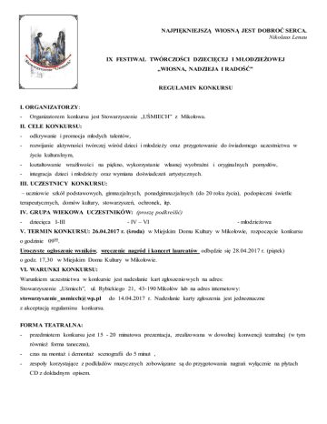 NAJPIĘKNIEJSZĄ WIOSNĄ JEST DOBROĆ SERCA. Nikolaus Lenau IX FESTIWAL TWÓRCZOŚCI DZIECIĘCEJ I MŁODZIEŻOWEJ „WIOSNA, NADZIEJA I RADOŚĆ” REGULAMIN KONKURSU I. ORGANIZATORZY: - Organizatorem konkursu jest Stowarzyszenie „UŚMIECH” z Mikołowa. II. CELE KONKURSU: - odkrywanie i promocja młodych talentów, - rozwijanie aktywności twórczej wśród dzieci i młodzieży oraz przygotowanie do świadomego uczestnictwa w życiu kulturalnym, - kształtowanie wrażliwości na piękno, wykorzystanie własnej wyobraźni i oryginalnych pomysłów, - integracja dzieci i młodzieży oraz wymiana doświadczeń artystycznych. III. UCZESTNICY KONKURSU: – uczniowie szkół podstawowych, gimnazjalnych, ponadgimnazjalnych (do 20 roku życia), podopieczni świetlic terapeutycznych, domów kultury, stowarzyszeń, ochronek, itp. IV. GRUPA WIEKOWA UCZESTNIKÓW: (proszę podkreślić) - dziecięca I-III - IV – VI - młodzieżowa V. TERMIN KONKURSU: 26.04.2017 r. (środa) w Miejskim Domu Kultury w Mikołowie, rozpoczęcie konkursu o godzinie 0900. Uroczyste ogłoszenie wyników, wręczenie nagród i koncert laureatów odbędzie się 28.04.2017 r. (piątek) o godz. 17,30 w Miejskim Domu Kultury w Mikołowie. VI. WARUNKI KONKURSU: Warunkiem uczestnictwa w konkursie jest nadesłanie kart zgłoszeniowych na adres: Stowarzyszenie „Uśmiech”, ul. Rybickiego 21, 43-190 Mikołów lub na adres internetowy: [email protected] do 14.04.2017 r. Nadesłanie karty zgłoszenia jest jednoznaczne z akceptacją regulaminu konkursu. FORMA TEATRALNA: - przedmiotem konkursu jest 15 - 20 minutowa prezentacja, zrealizowana w dowolnej konwencji teatralnej (w tym również forma taneczna), - czas na montaż i demontaż scenografii do 5 minut , - zespoły korzystające z podkładów muzycznych zobowiązane są do przygotowania nagrań wyłącznie na płytach CD z dokładnym opisem. Kryteria oceny: - dobór repertuaru do możliwości wykonawców, - scenariusz i reżyseria, - interpretacja tematu i kultura słowa, - ruch sceniczny, - celowość użycia kostiumów, scenografii, muzyki, - gra aktorska. FORMA MUZYCZNA: - w konkursie mogą wziąć udział soliści, zespoły wokalne, wokalno-instrumentalne i instrumentalne, - łączny czas prezentacji nie może przekroczyć 6 minut, - organizatorzy zapewniają sprzęt nagłaśniający, - w przypadku playbacków, należy przywieźć ze sobą nośnik z nagraną muzyką (dobrej jakości technicznej - CD, pendrive, mini disc, mp3). Kryteria oceny: - intonacja, - interpretacja, - muzykalność, - dykcja, - dobór repertuaru uwzględniający wiek i możliwości wokalne uczestników, - ogólny wyraz artystyczny. VII. POSTANOWIENIA KOŃCOWE: - Przystępując do Konkursu, Uczestnik i jego Opiekun wyrażają zgodę na przetwarzanie przez Organizatora podanych przez niego danych osobowych na potrzeby Konkursu (ustawa o ochronie danych osobowych z dn. 29.08.1997 r. Dz. U. 202 r. Nr 101 poz. 926 z późn. zm.). Dane Uczestników Konkursu wykorzystywane są wyłącznie w związku z wykonaniem postanowień Regulaminu, w celu przeprowadzenia Konkursu, promocji Konkursu oraz informowania o nim. - Postanowienia niniejszego regulaminu są wyłączną podstawą prowadzenia konkursu, a ich wykładnia i interpretacja należy do organizatora. - Przyjazd uczestników na konkurs odbywa się na koszt własny. - Zespoły powinny mieć odpowiednią liczbę opiekunów, gwarantujących porządek i bezpieczeństwo uczestników. Wszelkich informacji dot. festiwalu można uzyskać na stronie internetowej www.stowarzys zenieus miech.eu e-mail: [email protected] ZAPRASZAM Y DO UDZIAŁU W FESTIWALU! Życzymy radosnych, owocnych, wiosennych przygotowań do festiwalu. STOWA R ZY SZENI E „UŚMI EC H” 43-190 Mikołów ul. Rybickiego 21 tel. 601 487 503 NIP 635-16-75-838 Regon 278056611 Konto: Getin Bank 83156000132353689620000004 Powodzenia! Organizatorzy: Stowarzyszenie „Uśmiech” KARTA ZGŁOSZENIA DO IX FESTIWALU TWÓRCZOŚCI DZIECIĘCEJ I MŁODZIEŻOWEJ „WIOSNA, NADZIEJA I RADOŚĆ” I. Imię i nazwisko uczestnika lub nazwa zespołu muzycznego, teatralnego (liczba uczestników) …………………………………………………………………………………………………………………………………..……… ………………………………………………………………………………………………………………………………..…… …………………………………………………………………………………………………………………………………..…… II.Kategoria wiekowa (podkreślić) - dziecięca I-III - IV – VI - młodzieżowa III.Imię i nazwisko instruktora (ADRES , TELEFON , E-MAIL) …………………………………………………………………………………………………………………………………..……… ………………………………………………………………………………………………………………………………..…… IV.Nazwa instytucji macierzystej - szkoła, placówka (ADRES , TELEFON , E-MAIL) …………………………………………………………………………………………………………………………………..……… ………………………………………………………………………………………………………………………………..…… V.Forma prezentacji (podkreślić) MUZYCZNA TEATRALNA MIESZANA (JAKA)................................................................................................. VI.Tytuł i autor przygotowanego przedstawienia teatralnego bądź wokalnego …………………………………………………………………………………………………………………………………..……… ………………………………………………………………………………………………………………………