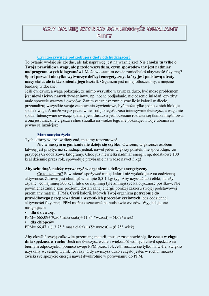 Czy rzeczywiście potrzebujesz diety odchudzającej? To pytanie wydaje się zbędne, ale tak naprawdę jest najważniejsze! Nie chodzi tu tylko o Twoją prawidłową wagę, ale przede wszystkim, czym spowodowany jest nadmiar nadprogramowych kilogramów? Może w ostatnim czasie zaniedbałeś aktywność fizyczną? Sport pozwoli nie tylko wytworzyć deficyt energetyczny, który jest podstawą utraty masy ciała, ale także zmienia jego kształt. Organizm jest mniej otłuszczony, a mięśnie bardziej widoczne. Jeśli ćwiczysz, a waga pokazuje, że mimo wszystko ważysz za dużo, być może problemem jest niewłaściwy nawyk żywieniowy, np. nocne podjadanie, niejedzenie śniadań, czy zbyt małe spożycie warzyw i owoców. Zanim zaczniesz zmniejszać ilość kalorii w diecie, przeanalizuj wszystkie swoje zachowania żywieniowe, być może tylko jedno z nich blokuje spadek wagi. A może wręcz przeciwnie - od jakiegoś czasu intensywnie ćwiczysz, a waga nie spada. Intensywnie ćwicząc spalany jest tłuszcz a jednocześnie rozrasta się tkanka mięśniowa, a ona jest znacznie cięższa i choć strzałka na wadze tego nie pokazuje, Twoje ubrania na pewno są luźniejsze. Matematyka życia Tych, którzy wierzą w diety cud, musimy rozczarować. Nic w naszym organizmie nie dzieje się szybko. Owszem, większości osobom łatwiej jest przytyć niż schudnąć, jednak nawet jeden większy posiłek, nie spowoduje, że przybędą Ci dodatkowe kilogramy. Choć już niewielki nadmiar energii, np. dodatkowe 100 kcal dziennie przez rok, spowoduje przybranie na wadze nawet 5 kg! Aby schudnąć, należy wytworzyć w organizmie deficyt energetyczny. Co to oznacza? Powinieneś spożywać mniej kalorii niż wydatkujesz na codzienną aktywność. Zdrowo jest chudnąć w tempie 0,5-1 kg/ tyg. Aby uzyskać taki efekt, należy „spalić” co najmniej 500 kcal lub o co najmniej tyle zmniejszyć kaloryczność posiłków. Nie powinieneś zmniejszać poziomu dostarczanej energii poniżej zakresu swojej podstawowej przemiany materii (PPM). Czyli kalorii, których Twój organizm potrzebuje do prawidłowego przeprowadzania wszystkich procesów życiowych, bez codziennej aktywności fizycznej. PPM można oszacować na podstawie wzorów. Wyglądają one następująco: • dla dziewcząt PPM= 665,09+(9,56*masa ciała)+ (1,84 *wzrost) – (4,67*wiek) • dla chłopców PPM= 66,47 + (13,75 * masa ciała) + (5* wzrost) – (6,75* wiek) Aby określić swoją całkowitą przemianę materii, musisz zastanowić się, ile czasu w ciągu dnia spędzasz w ruchu. Jeśli nie ćwiczysz wcale i większość wolnych chwil spędzasz na biernym odpoczynku, pomnóż swoje PPM przez 1,4. Jeśli ruszasz się tylko na w-fie, zwiększ uzyskany wcześniej wynik 1,6 razy. Gdy ćwiczysz dużo i często jesteś w ruchu, możesz zwiększyć spożycie energii nawet dwukrotnie w porównaniu do PPM. Nowoczesny człowiek, pierwotny metabolizm Dlaczego większe restrykcje kalorycznej nie mają sensu? Odpowiedź jest bardzo prosta. Mimo, iż żyjemy w XXI wieku i jesteśmy bardzo nowocześni, gospodarka energetyczna naszych organizmów jest pierwotna. Ukształtowała się w czasie, gdy na ziemi żyli pierwsi ludzie i na przestrzeni setek lat wygląda tak samo. Mianowicie, im bardziej zmniejszysz ilość energii w diecie, tym bardziej Twój organizm poczuje się zagrożony i będzie chciał się przed tym bronić spowalniając metabolizm. Więc efekt może być odwrotny do zamierzonego. Poza tym tak duże różnice pomiędzy ilością spożytych kalorii, a zapotrzebowaniem, przyczyniają się do złego nastroju, zwiększają zmęczenie i podatność na choroby. Podsumowanie Prawidłowe żywienie to podstawa właściwego stylu życia i odpowiedniej wagi. Urozmaicaj swoje posiłki, jedz regularnie, pij dużo wody i ćwicz, a wtedy na pewno będziesz w dobrej formie. Pamiętaj, że Twój organizm ciągle się rozwija i musisz zadbać o to, by rozwijał się prawidłowo!