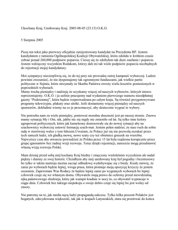 Ukochany Kraj, Umiłowany Kraj 2005-08-05 (23:15) O.K.O. 5 Sierpnia 2005 Piszę ten tekst jako pierwszy oficjalnie zarejestrowany kandydat na Prezydenta RP. Jestem kandydatem z ramienia Ogólnopolskiej Koalicji Obywatelskiej, która zdołała w krótkim czasie zebrać ponad 260,000 podpisów poparcia. Cieszę się że zdobyłem tak duże zaufanie i poparcie. Jestem wdzięczny wszystkim Rodakom, którzy dali mi tak wiele podpisów poparcia niezbędnych do rejestracji mojej kandydatury. Moi sympatycy niecierpliwią się, że do tej pory nie prowadzę ostrej kampanii wyborczej. Ludzie powinni zrozumieć, że nie dysponujemy tak ogromnymi funduszami, jak wielkie partie polityczne w Sejmie, które otrzymały ze Skarbu Państwa zwroty wielu kosztów poniesionych w poprzednich wyborach. Mamy trochę pieniędzy i nadzieję że uzyskamy więcej od naszych wyborców, których interes reprezentujemy. O.K.O. i ja usilnie pracujemy nad wydaniem pierwszego numeru nieodpłatnej gazety “Podziemnej”, która będzie rozprowadzana po całym kraju. Są również przygotowywane programy telewizyjne, plakaty oraz ulotki. Jeśli dostaniemy więcej pieniędzy od naszych sponsorów, dokładnie wiemy na co je przeznaczyć, aby skutecznie wygrać te wybory. Nie potrzeba nam za wiele pieniędzy, ponieważ moralna słuszność jest po naszej stronie. Znowu mamy sytuację My i Oni, tak, jakby nic się nigdy nie zmieniło od lat. Są tylko inne kolory ugrupowań politycznych, które jak kameleony dostosowały się do nowej sytuacji aby na szachownicy wyborczej ustawić formację szach-mat. Jestem pełen nadziei, że nasz ruch da sobie radę w nierównej walce z tym fałszem.Uważam, że Polacy już się nie pozwolą oszukać przez tych samych ludzi, ich gładką mowę, nowe szaty czy też obietnice gruszek na wierzbie. Najwyższy czas aby otwarcie powiedzieć że Polska przez 15 lat była rządzona korupcynie przez grupę ignorantów bez żadnej wizji rozwoju. Teraz dzięki rejestracji, nareszcie mogę przedstawić własną wizję rozwoju Polski. Mam dzisiaj przed sobą mój kochany Kraj biedny i zmęczony wieloletnim wyzyskiem ale nadal piękny i dumny ze swej historii. Chciałbym aby mój umiłowany kraj był pogodny i bezstresowy bo tylko w takim nastroju można zacząć odbudowę wydobywajac się z biedy. Kiedy mówię, że zaraz po wyborach będzie lepiej, wroga prasa, która promuje moją opozycję krzyczy że jestem oszustem. Zapewniam Was Rodacy że będzie lepiej zaraz po wygranych wyborach bo lepiej człowiek czuje się we własnym domu. Obywatele mają prawo do ochrony przed niewidzialną ręką państwowego złodzieja, który jak wampir kradnie w nocy to, co obywatel wypracuje w ciągu dnia. Człowiek bez takiego niepokoju o swoje dobro czuje się lepiej bo jest wolny od zmory. Nie patrzmy na to, jak media nęcą ludzi propagandą sukcesu. Tylko kilka procent Polaków jest bogatych, zdecydowana większość, tak jak w krajach Latynoskich, stara się przetrwać do końca miesiąca. Nie zapominajmy nigdy o tych, którzy cierpią na chorobę zwaną chronicznym bezrobociem. Musimy to bezrobocie szybko zlikwidować, bo to ludzie pracy a nie kapitał są wartością nadrzędną w naturze. Trzeba pomóc obywatelom znaleźć pracę, zgodnie z międzynarodowymi prawami człowieka. Choćby na kolanach, pójdę wszędzie o pomoc aby moi bezrobotni Rodacy mieli szansę na godne życie. Wroga prasa stale mi zarzuca że nigdy nie miałem i nie mam programu dla Polski. Co więcej usilnie stara się wykazać że nie znam polskich realiów. Kiedy mówię że widzę las, nieprzyjaźni dziennikarze domagają się abym mówił o pojedyńczych drzewach. Dzięki temu że tak wielka liczba Polaków dała mi podpisy poparcia będę teraz miał dostęp do radia i telewizji. Przedstawię mój “Nowy ład dla Polski”. Wiem że były elektorat i nowy, który będzie na mnie głosował po raz pierwszy jest zainteresowany tym, co mam do powiedzenia w swojej kampanii wyborczej. Zdaję sobie sprawę z tego, że to co powiem na początku będzie bardzo ważne bo będziecie mnie uważnie słuchali. Starannie przygotowywałem się do tej chwili przez 10 lat. Przyszłość Polski powinna zależeć nie tyle od polityków czy mass mediów ale od nas samych, ludzi wolnej i silnej woli. To nasza wola ma być motorem rozwoju. Dlatego powinniśmy stworzyć w naszym Kraju takie warunki, aby czuć się jak u siebie w domu. Aby Polska choć biedna, nie była okrutną macochą a naszą matką, która nas kocha i opiekuje się nami. Chcę, aby każdy urząd państwa i Narodowy Bank Polski pomagał a nie przeszkadzał ludziom w realizacji inicjatyw rozwoju. Uważam, że każdy pracownik i każdy pracodawca powinien być przez Państwo Polskie szanowany i chroniony. Podstawą takiego ładu jest głos wyborczy każdego obywatela. W krajach demokratycznych ten, który głosuje jest panem a polityk przez niego wybrany ma mu wiernie służyć. Mam nadzieję, że moje wieloletnie doświadczenie zdobyte za granicą zostanie uznane za pożyteczne dla Kraju. Nie ma mowy aby Polska wrócila do dyktatorskiego komunizmu, a więc jesteśmy zgodni że będziemy mieli w Polsce demokratyczny kapitalizm. Ale nie taki jaki gnębił Polaków przez ostatnie 15 lat. Tak złej demokracji i kapitalizmu nie ma na Zachodzie. Spędziłem wiele lat za granicą nie muszę czytać książek aby wiedzieć co można a czego nie można robić w nowoczesnym kraju demokracji kapitalistycznej. Większość ludzi w Polsce nigdy nie żyła na Zachodzie, gdzie prawa jednostki są chronione i jest wiele prawnych osłon przed drapieżnym kapitalizmem. Prawda jest taka że wysoko rozwinięte kraje Zachodu stykają się z socjalizmem ze względu na wierną służbę swoim obywatelom. Tak też powinno być w Polsce, bo inaczej nie możemy marzyć o żadnym rozwoju gospodarczym. System sprawiedliwości społecznej trzeba mieć w sobie, aby działać skutecznie wykorzystując duże doświad